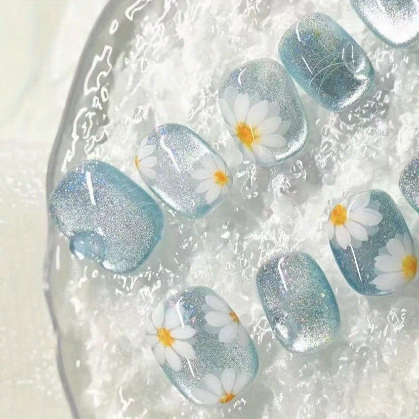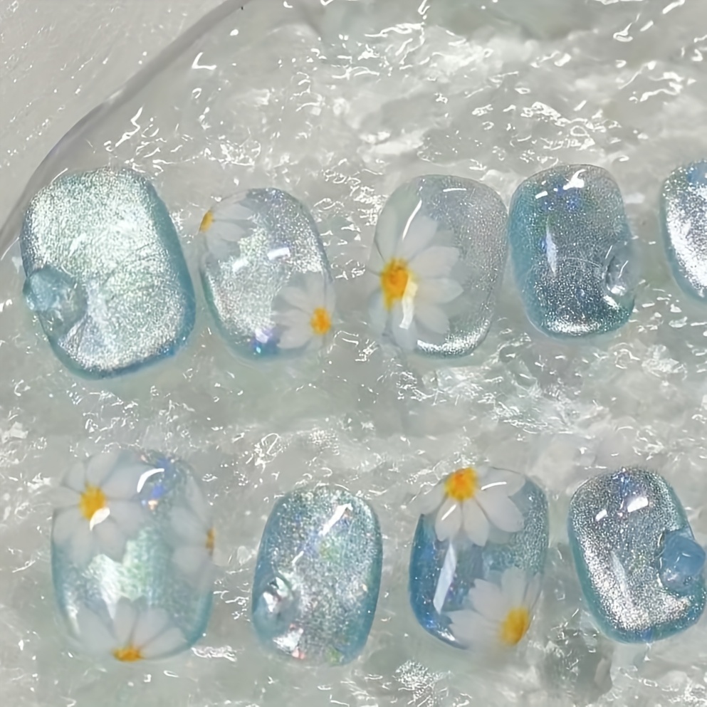 10pcs Blue Ice Crystal Daisy Line Bubble Wearable Nails, New Summer Beach Trip Detachable False Nails, Suitable for Nail Art DIY Enthusiasts, Women and Girls
