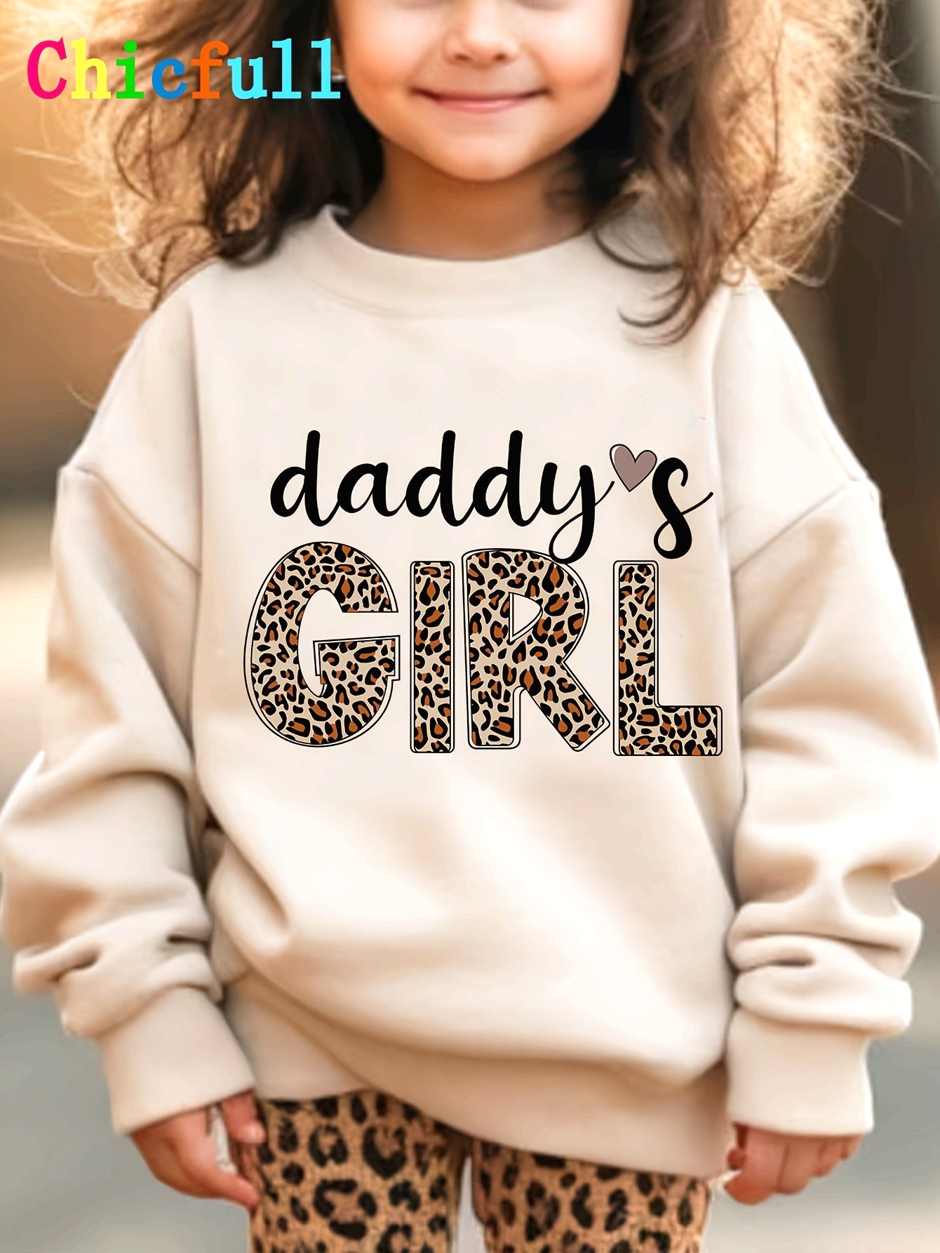 1pc Chicfull Daddy'S Girl Leopard Print Lettering Sweatshirt for Girls, Casual Style, Round Neck, Polyester, Knitted, Regular Fit, Warm and Stretchy - All Seasons, Thick