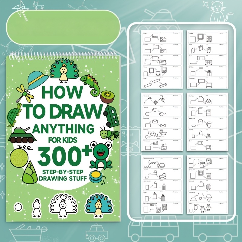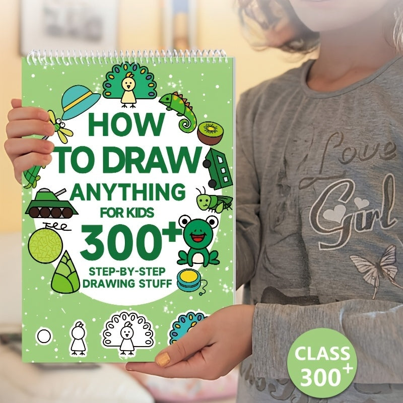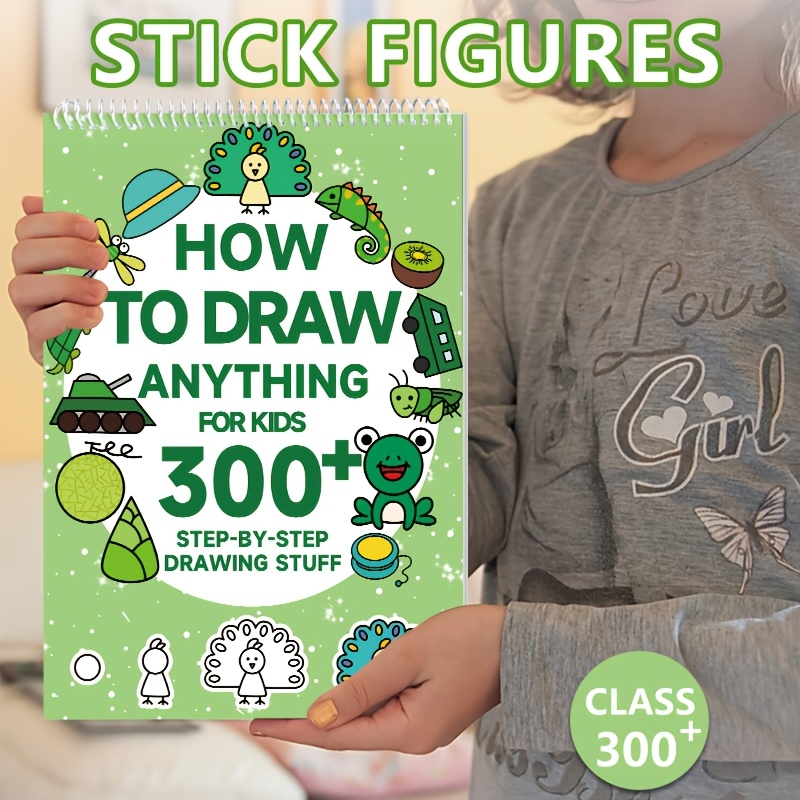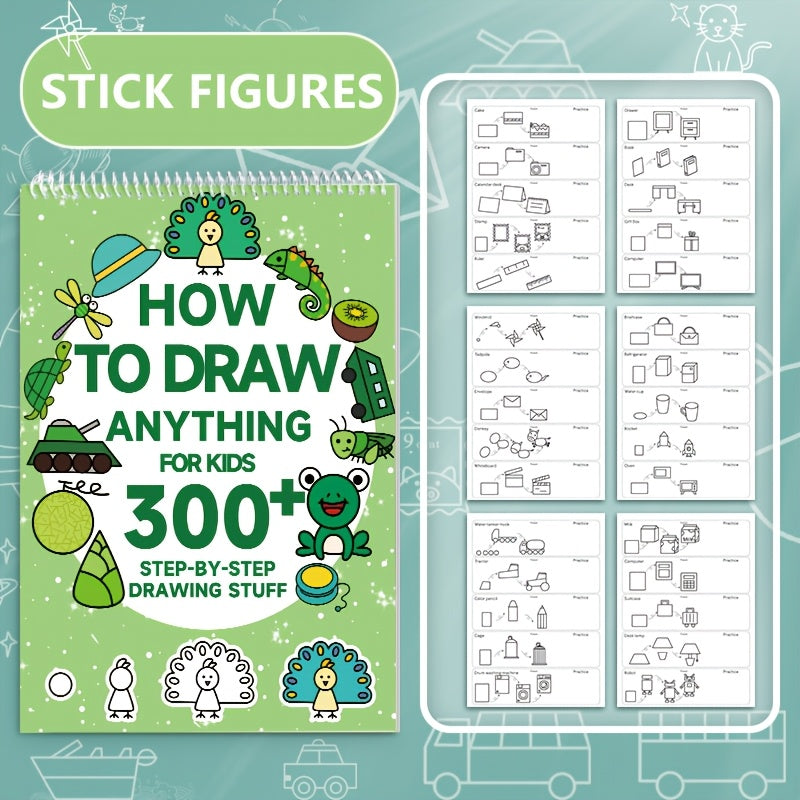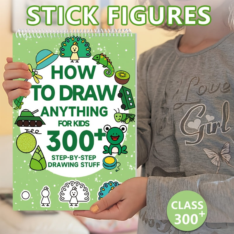 1pc Green Stick Figure Drawing Book for Youngsters - 300+ Step-by-Step Art & Education Toy, Learning Painting Supplies with Cartoon Dinosaur & Frog Designs, Perfect for Creative Writing & Coloring, Youngsters Drawing Book | Playful Design | Spiralbound Bo