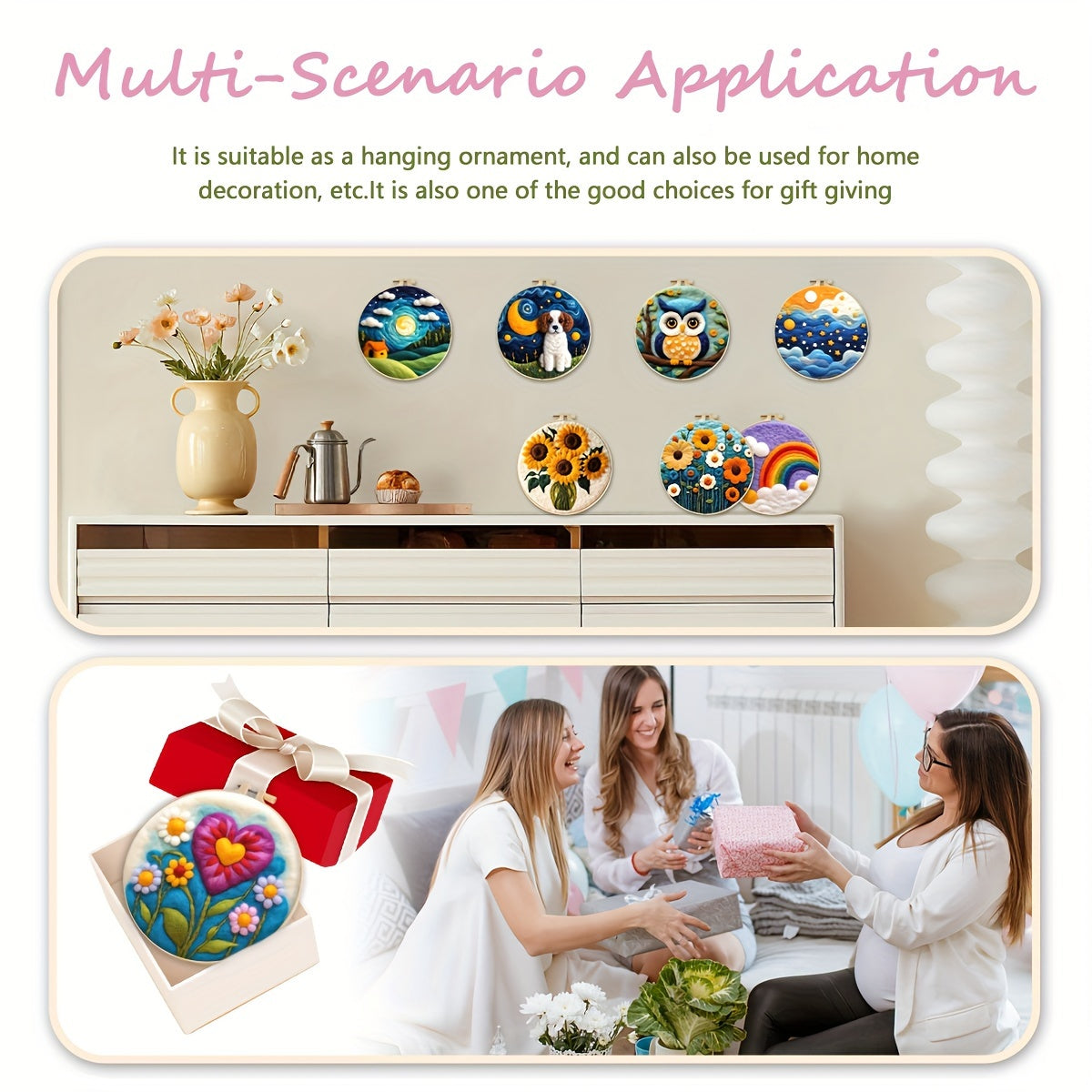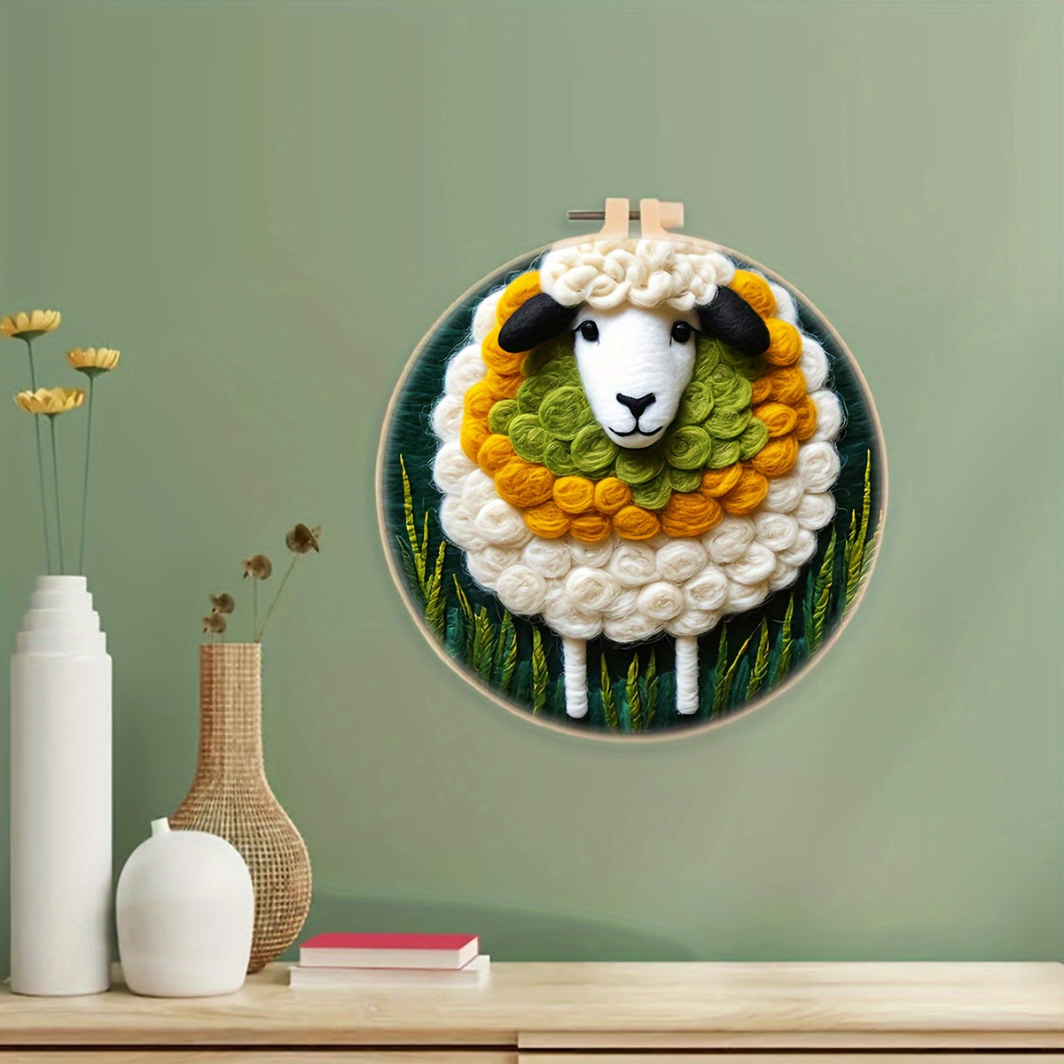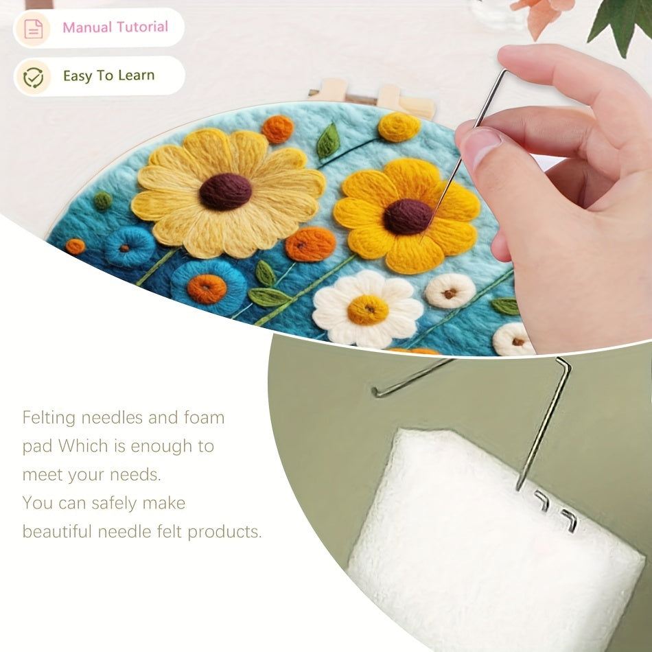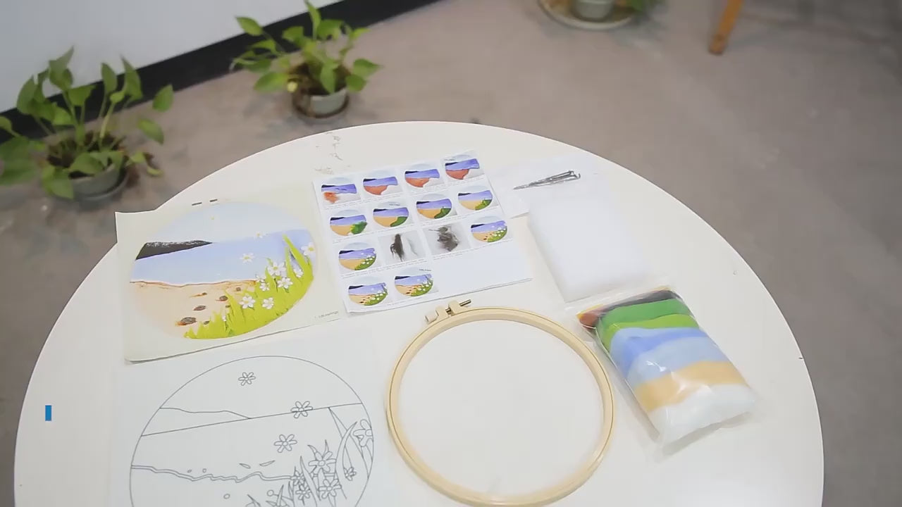 The kit includes: felting canvas, reference image, various wools, foam workplace, metal needles, and frame. Please note that the painting is not finished and needs to be felted by yourself. High-quality wool is provided, giving a super soft feel. The frame included is an embroidery frame.
