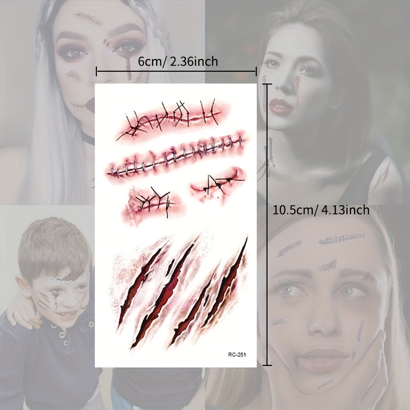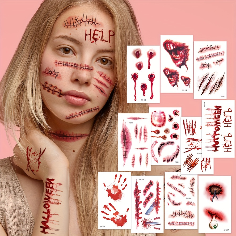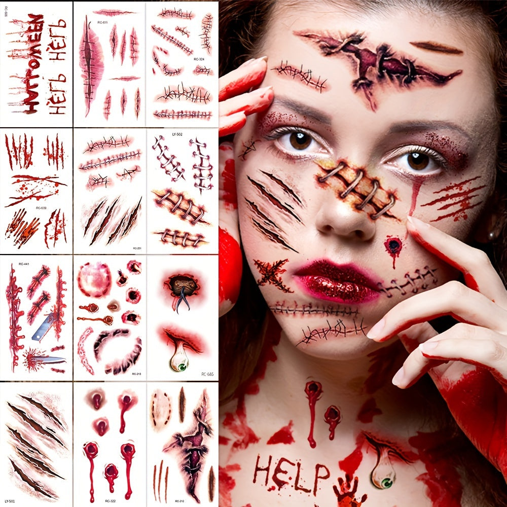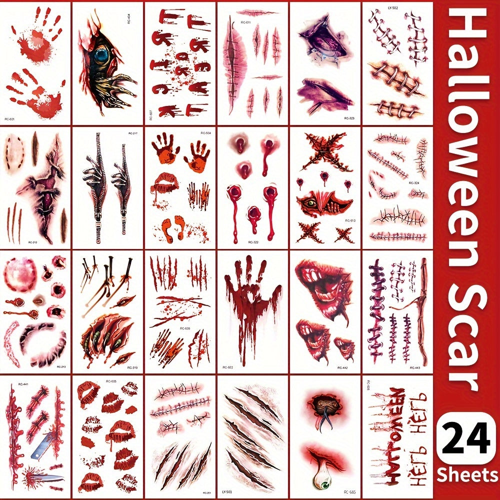 24 Sheets Halloween 3D Fake Scar Temporary Tattoos for Adults - Realistic Bloody Wound Designs for Face & Body, Perfect for Horror Cosplay, Masquerade Party, and Prank Makeup, Party Body Art | Graphic Tattoos | Detailed Tattoo Designs