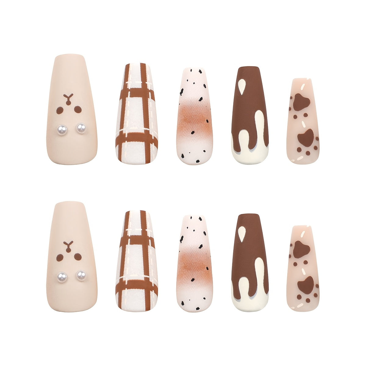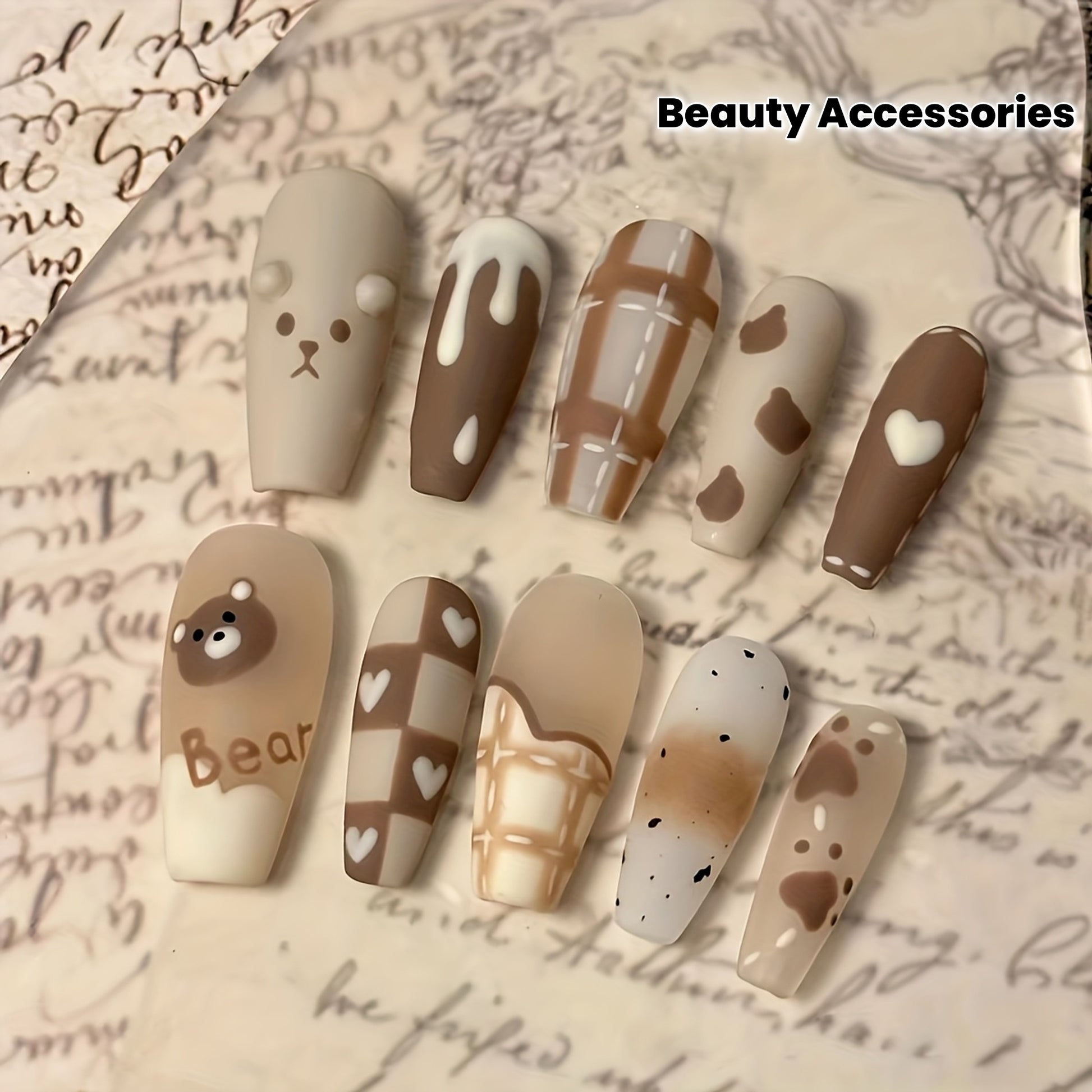 24pcs Cute Bear & Heart Design Press-On Nails - Medium Ballet Shape, Glossy Finish, Mixed Colors (Beige, Brown, White) with Jelly Glue & Nail File Included, Beauty Accessories, Whimsical Patterns, Durable Pressons