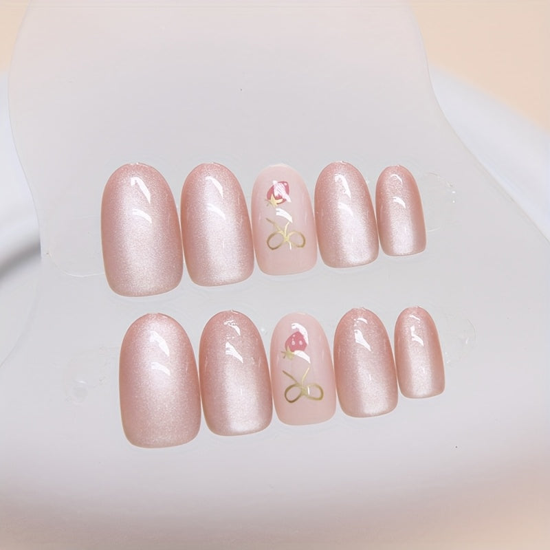24pcs Cute Strawberry & Bowknot Removable Press-On Nails - Pink Cat Eye Effect, Short Oval False Nails with Glossy Finish, Easy to Wear & Remove, Perfect for Casual Attir