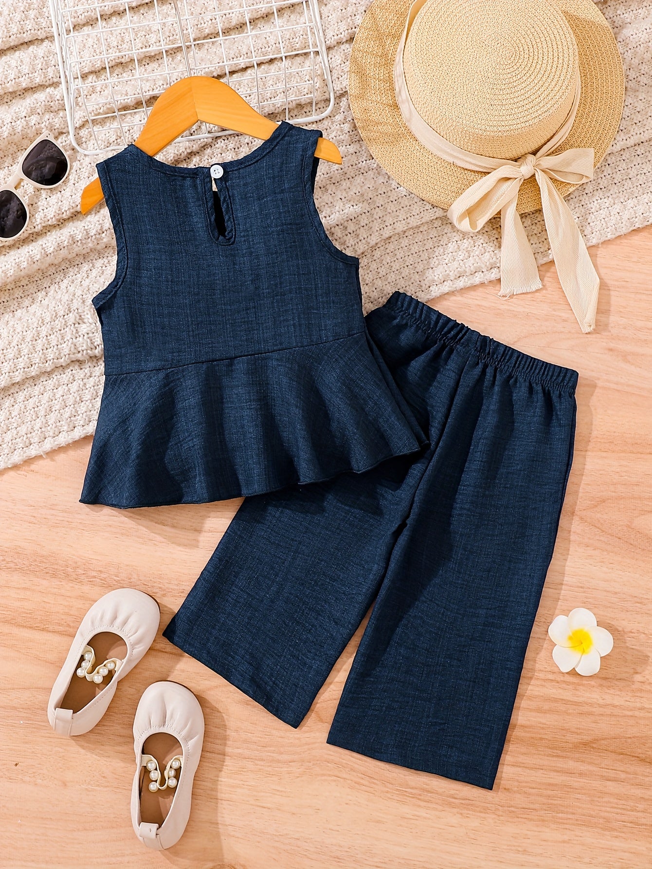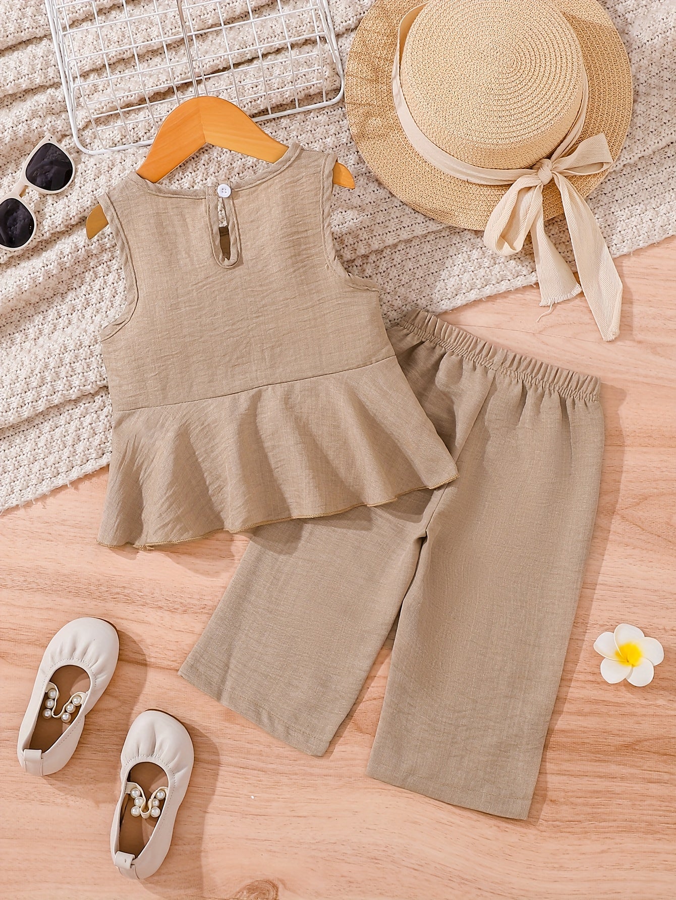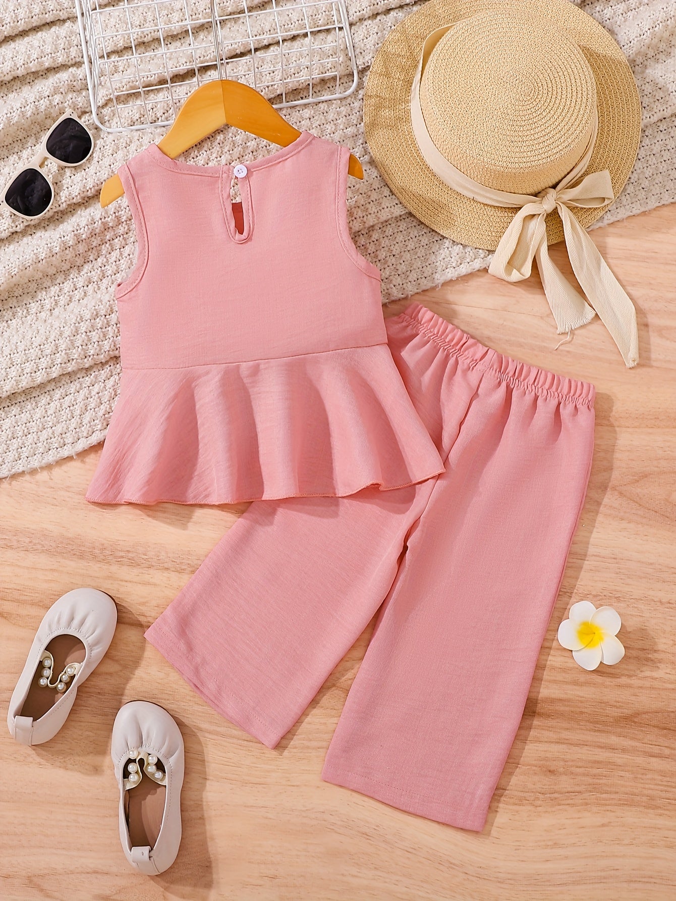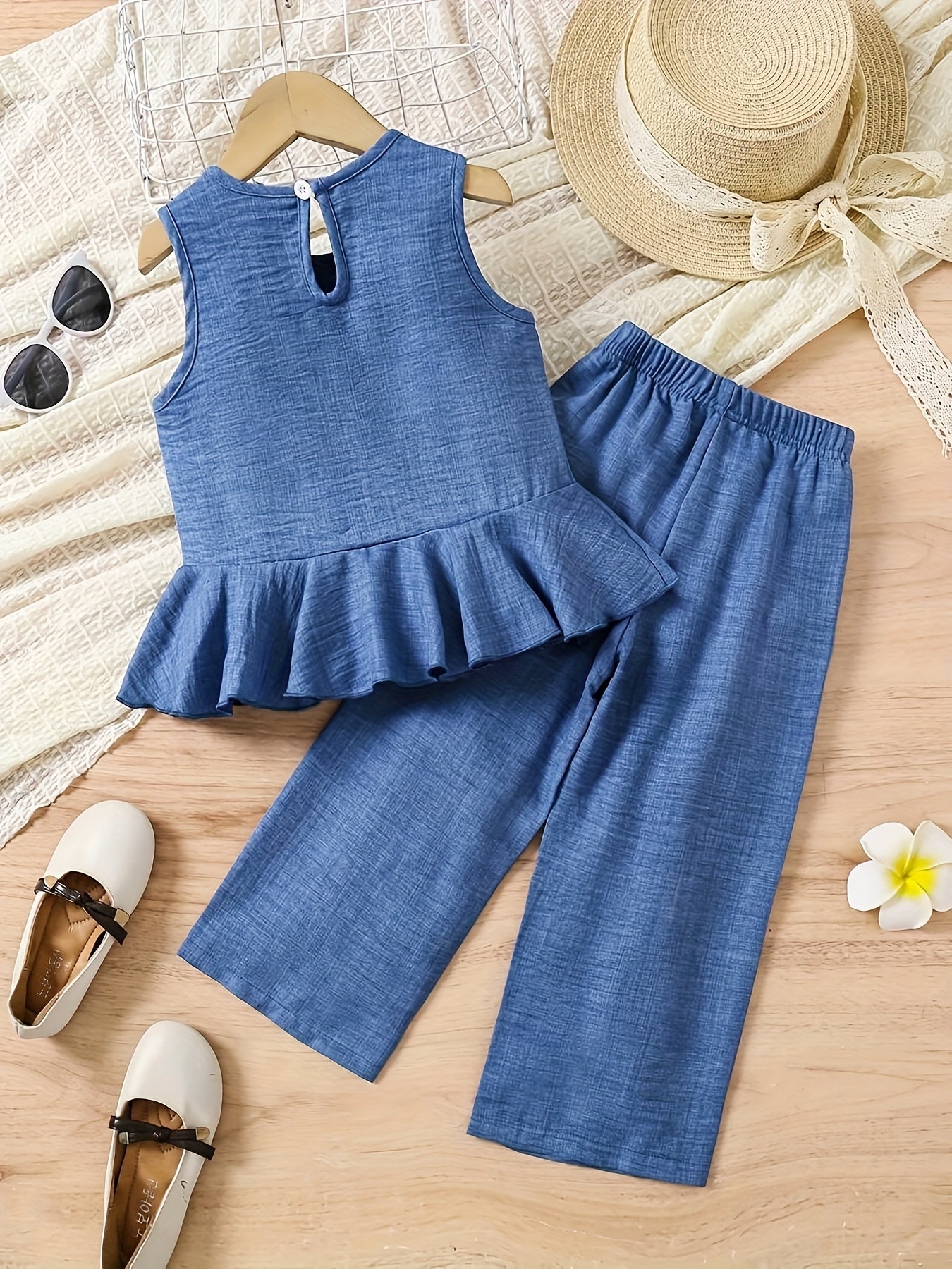 2pcs Young Girl Beach Vacation Set: Sleeveless Ruffle Hem Shirt + Wide Leg Pants, Sister Outfit, Perfect for Outdoor