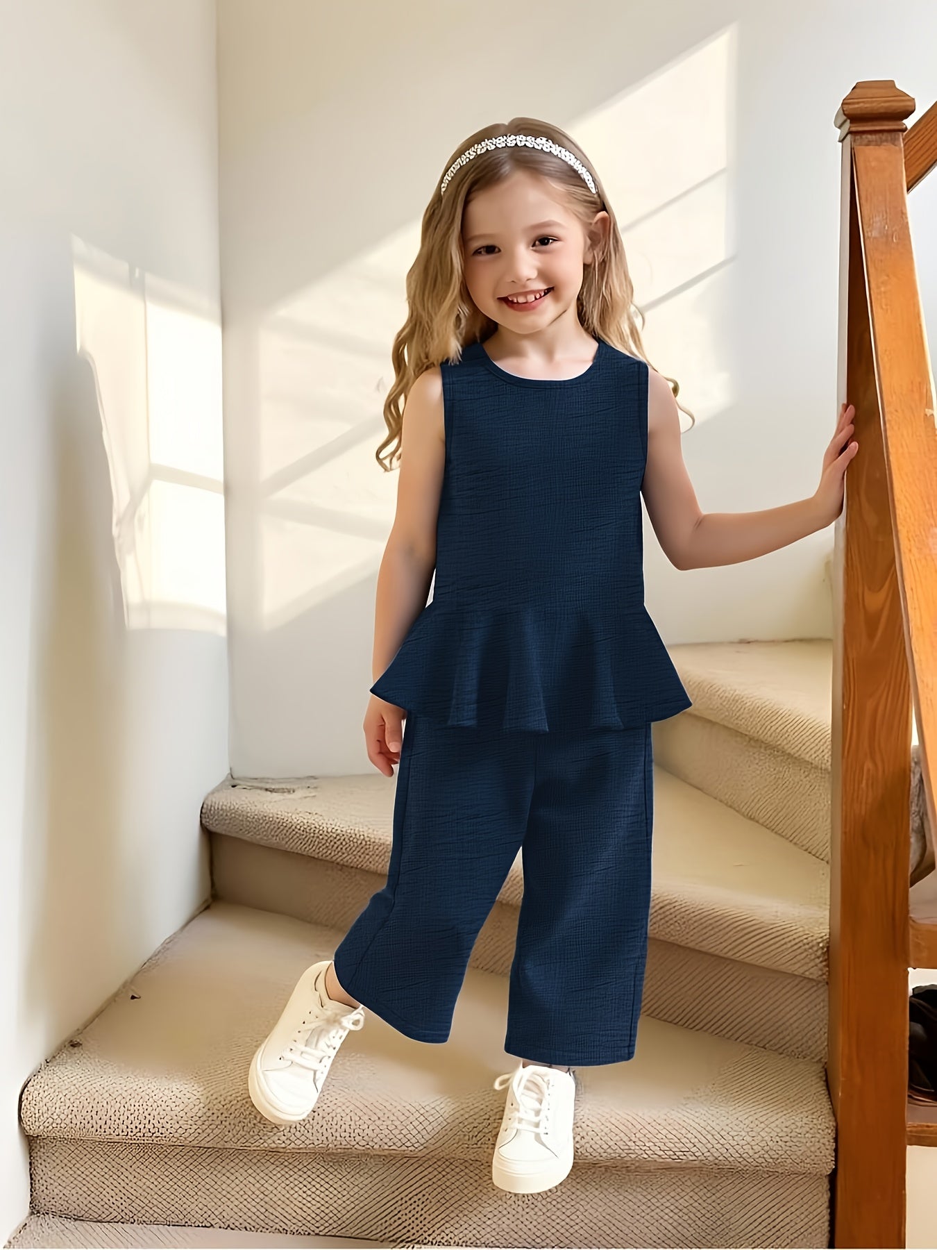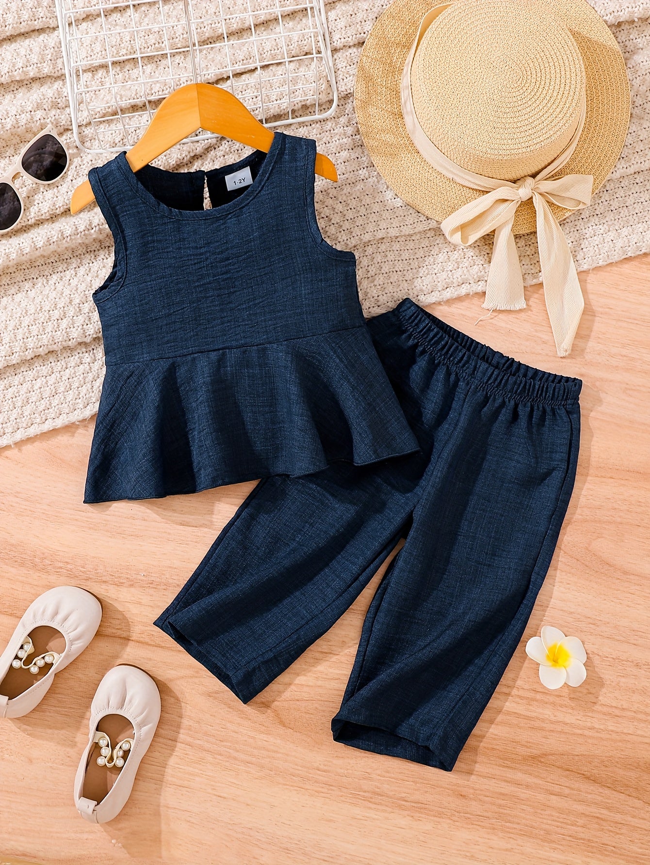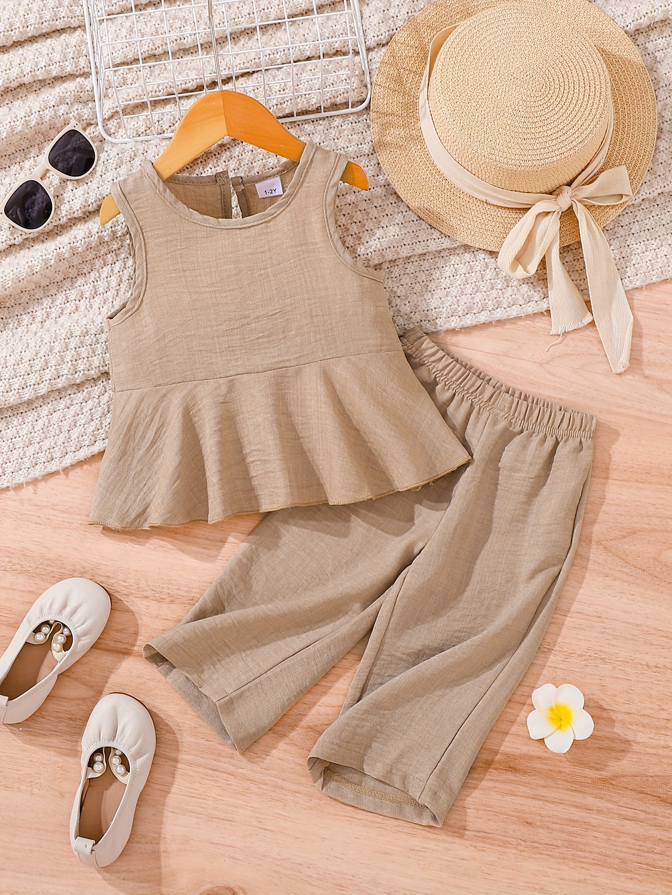2pcs Young Girl Beach Vacation Set: Sleeveless Ruffle Hem Shirt + Wide Leg Pants, Sister Outfit, Perfect for Outdoor