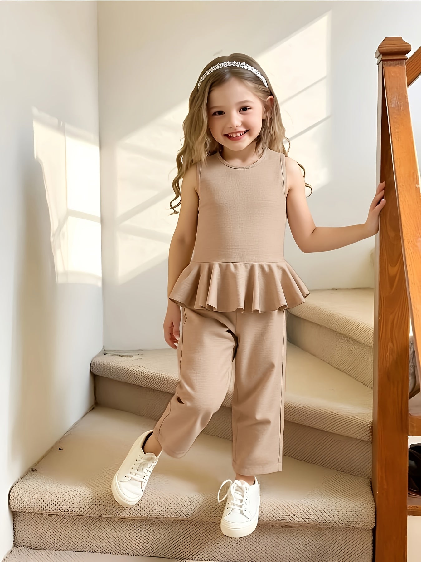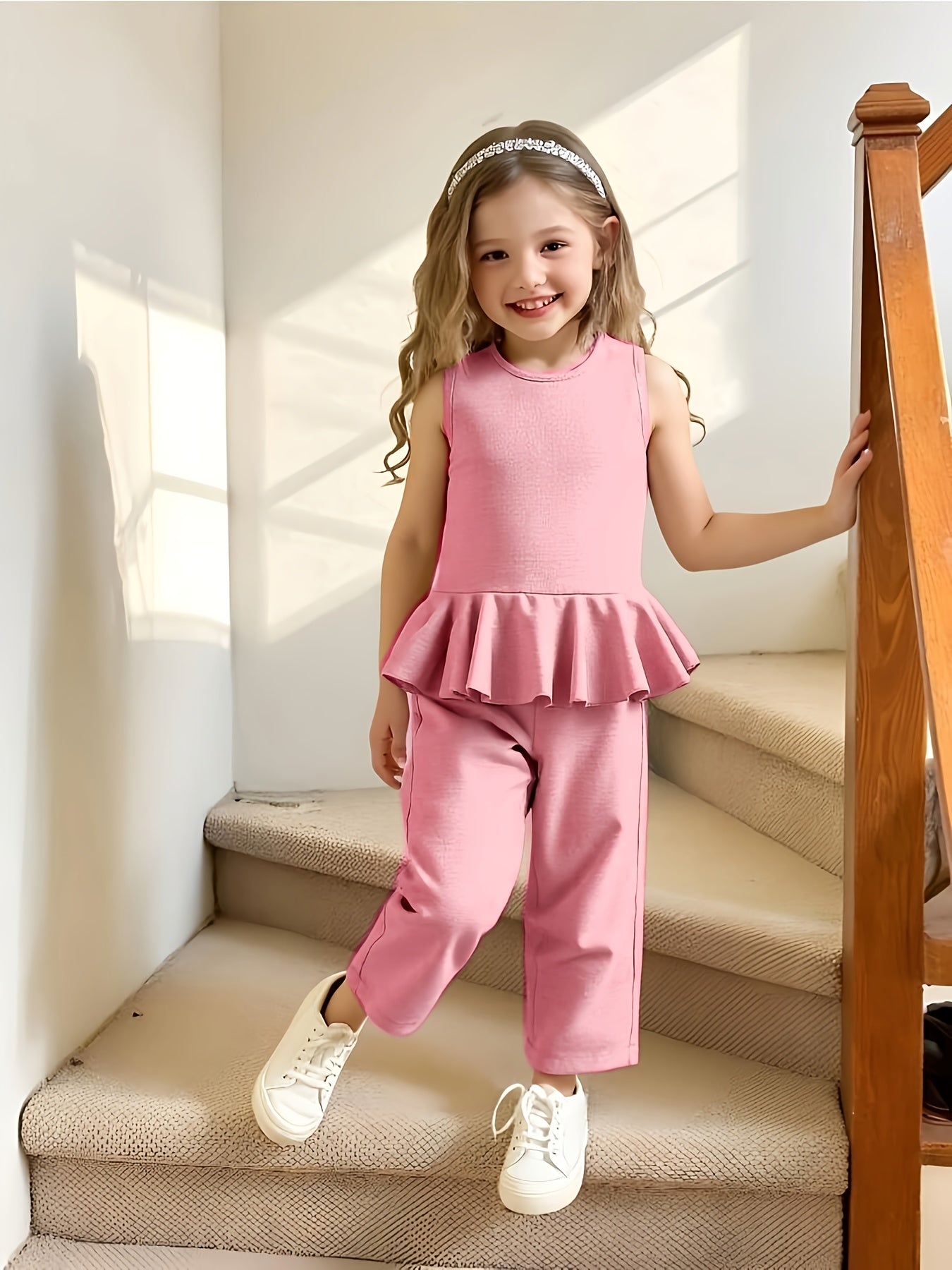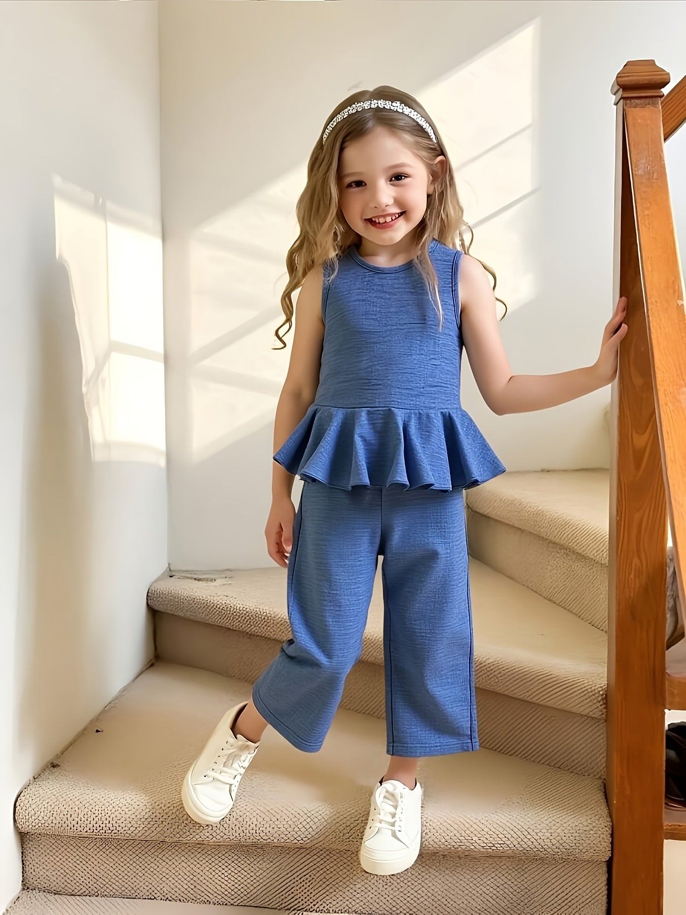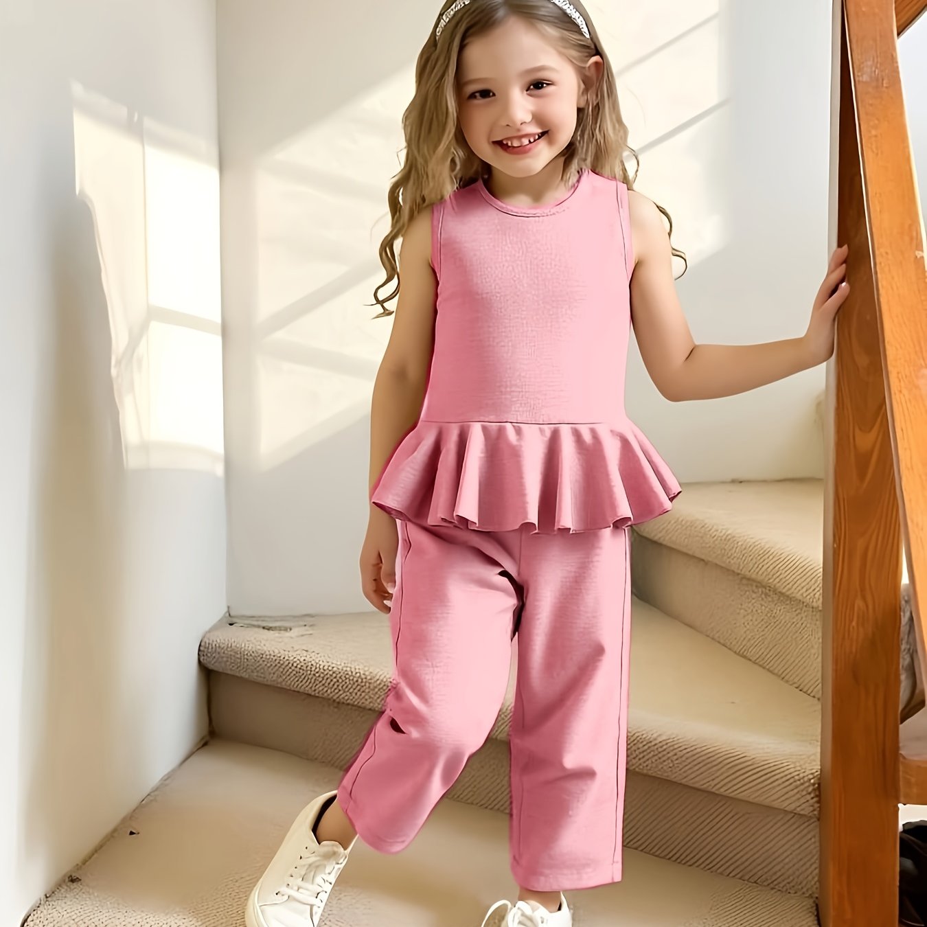 2pcs Young Girl Beach Vacation Set: Sleeveless Ruffle Hem Shirt + Wide Leg Pants, Sister Outfit, Perfect for Outdoor
