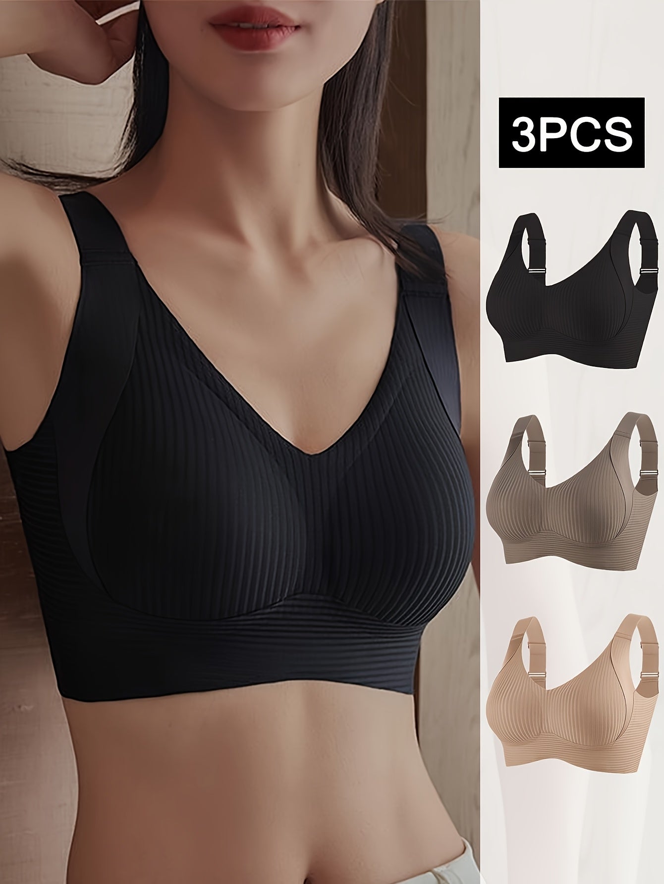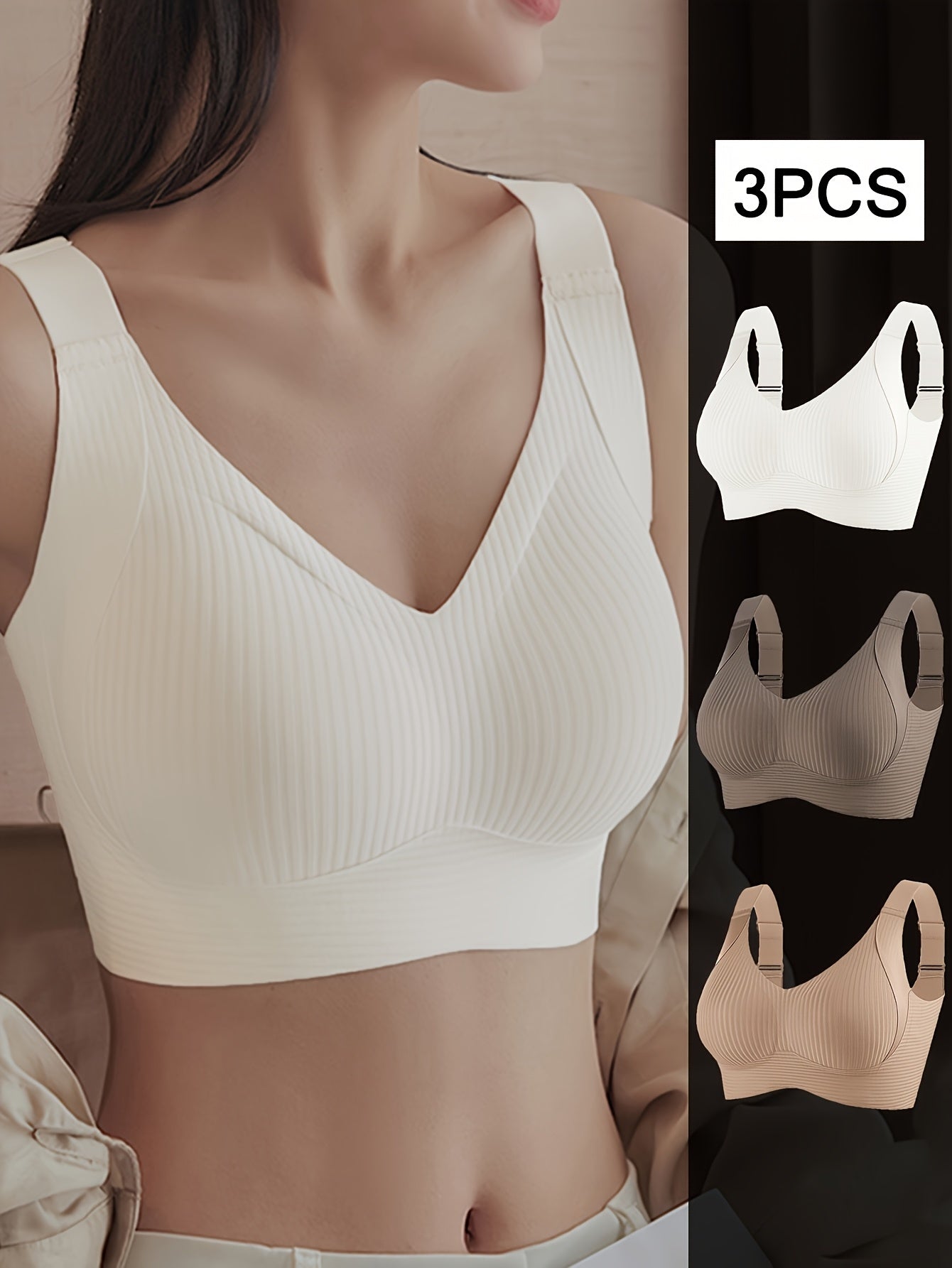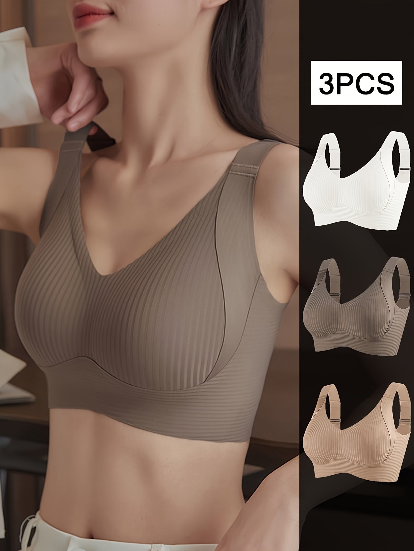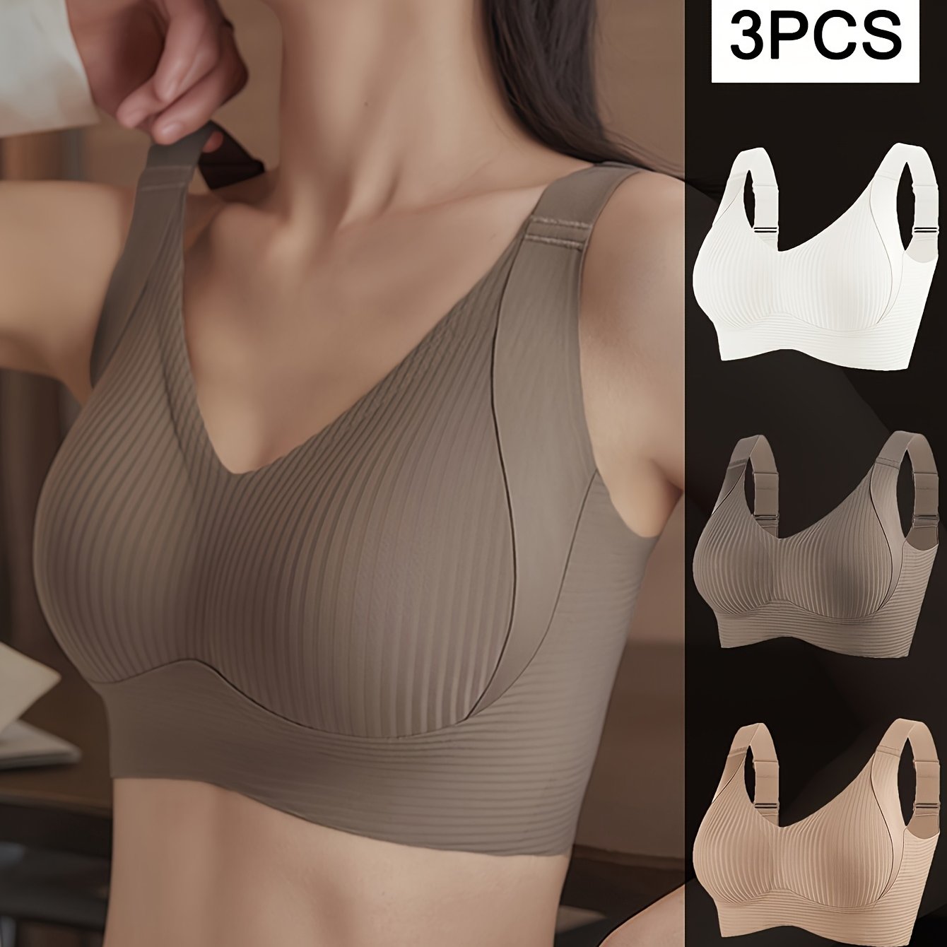 3pcs Women's Push-Up Bras Anti-Sagging Adjustable Comfort Seamless High Support Wire-Free with Removable Pads & Side Smoothing Striped Design - Breathable Soft Fabric for Casual Attire (Light Beige/White/Black), Comfortable Lingerie, Stylish Lingerie, Smo
