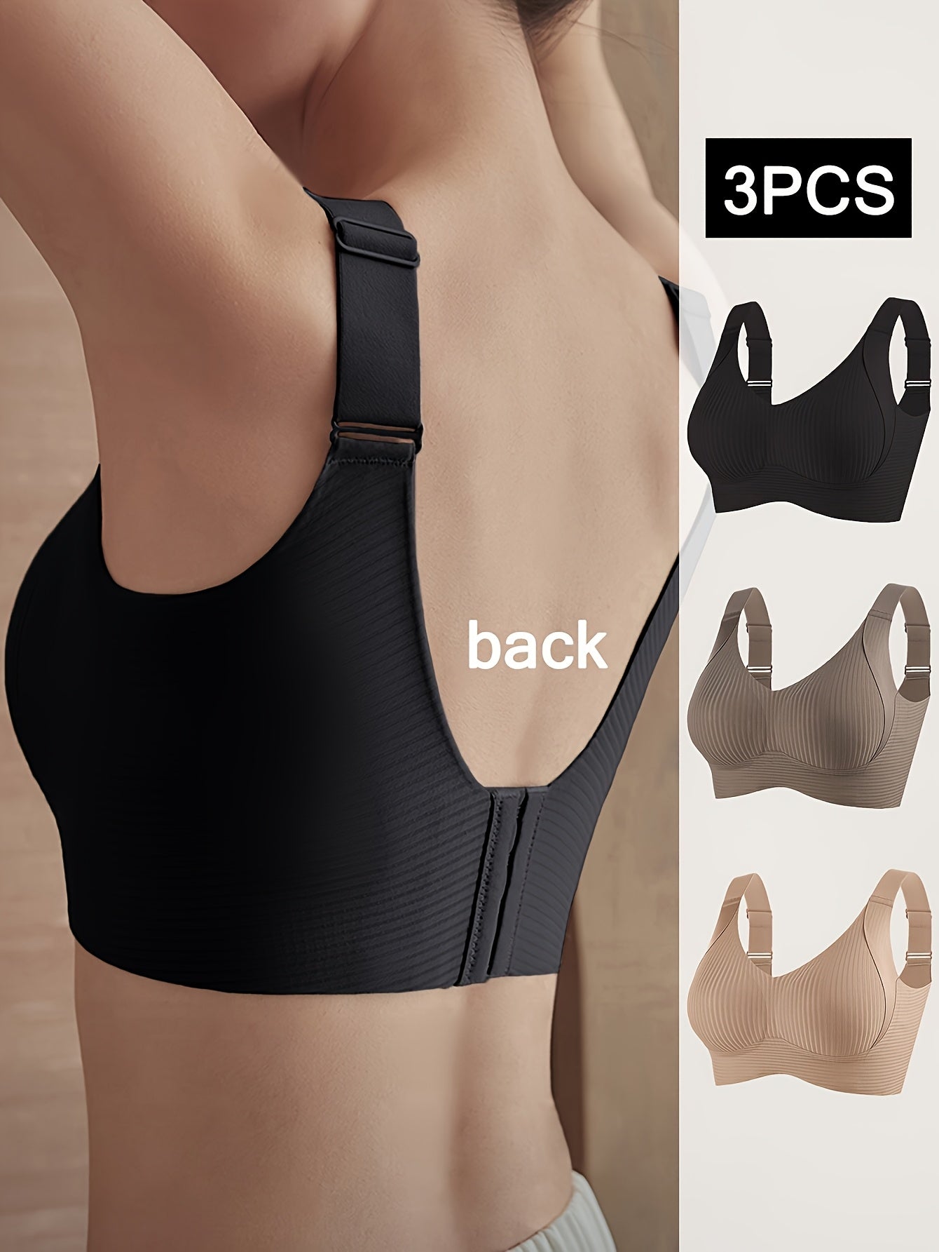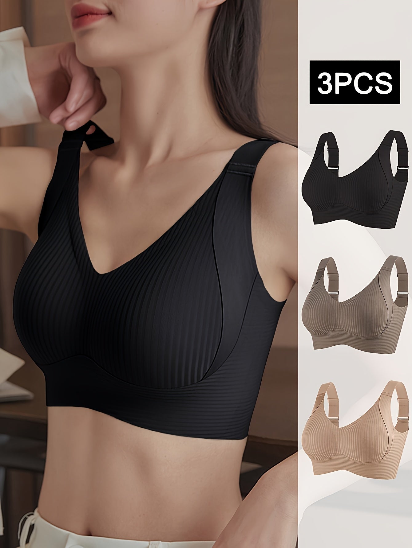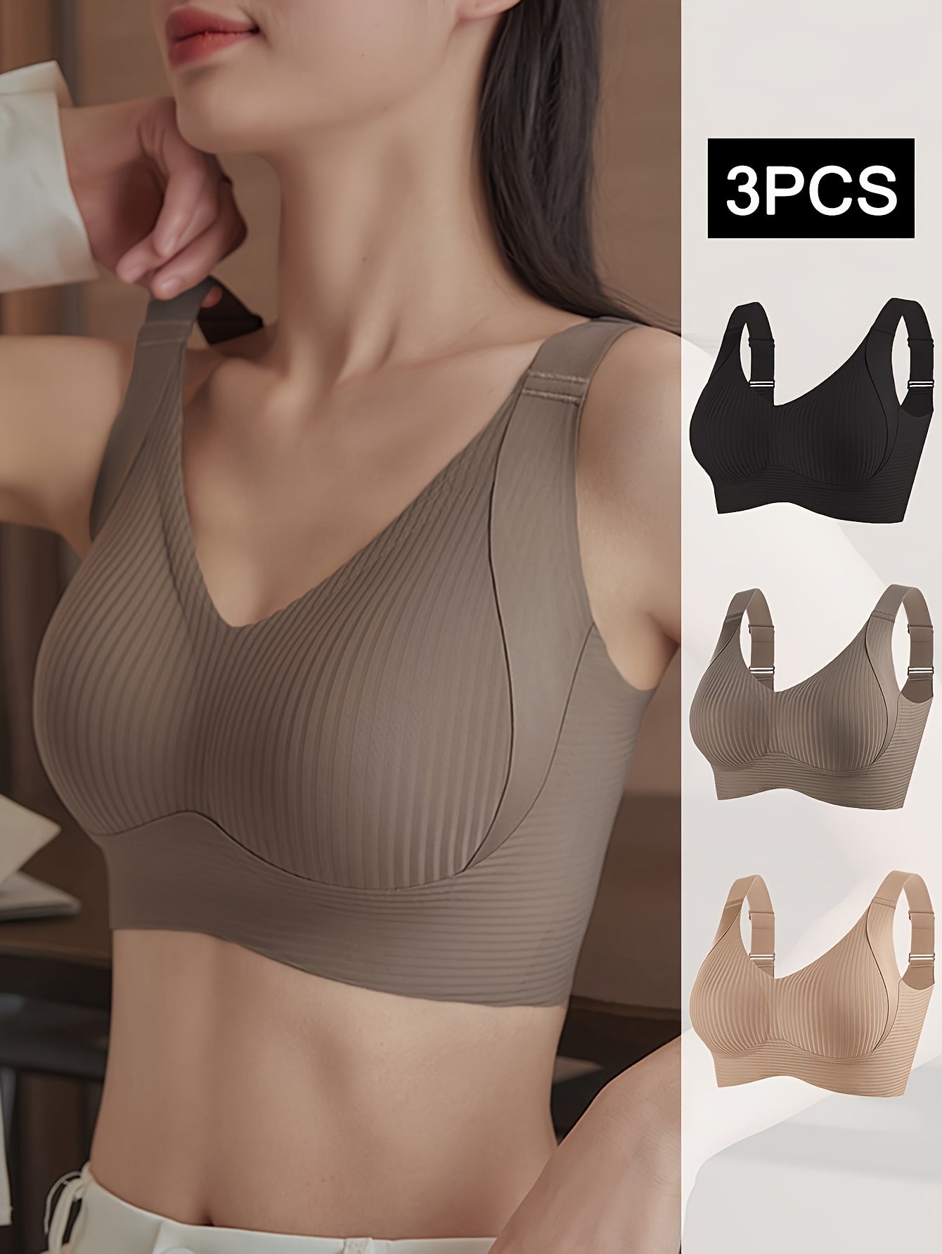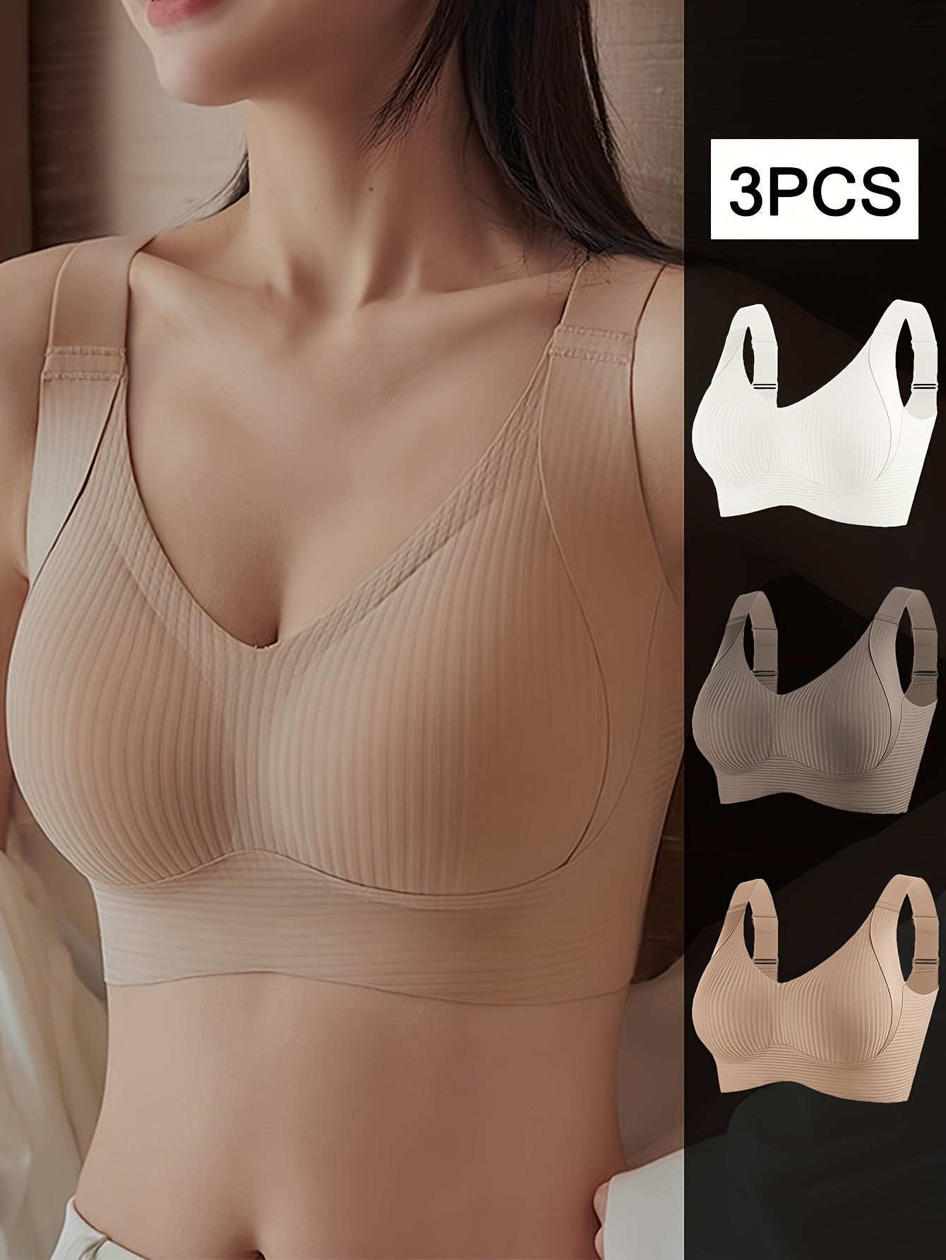 3pcs Women's Push-Up Bras Anti-Sagging Adjustable Comfort Seamless High Support Wire-Free with Removable Pads & Side Smoothing Striped Design - Breathable Soft Fabric for Casual Attire (Light Beige/White/Black), Comfortable Lingerie, Stylish Lingerie, Smo