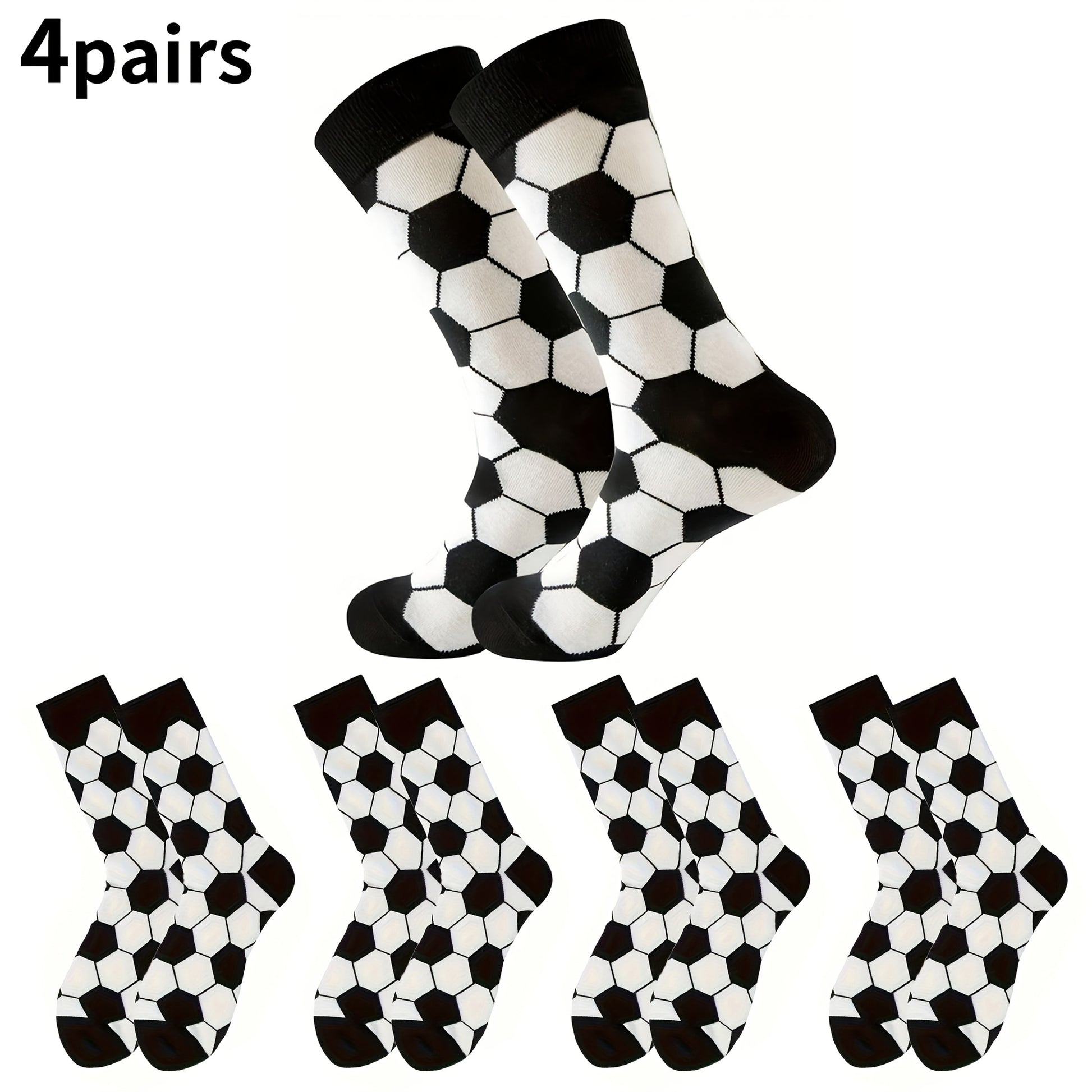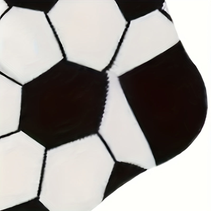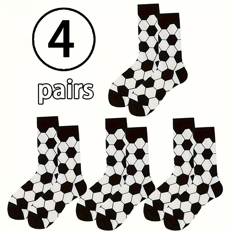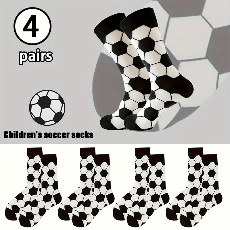 4 Pairs Kids Socks, Black and White Soccer Pattern, Polyester 80%, Elastane 20%, All-Season Knit Fabric, Mid-Calf Striped Plaid, Hand Washable, Trendy Sports Style for Boys and Girls