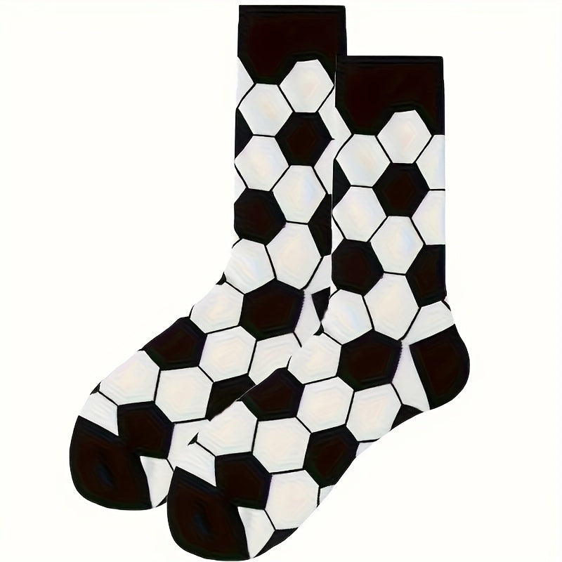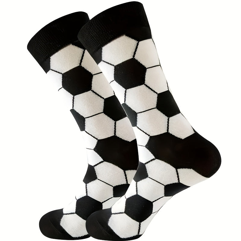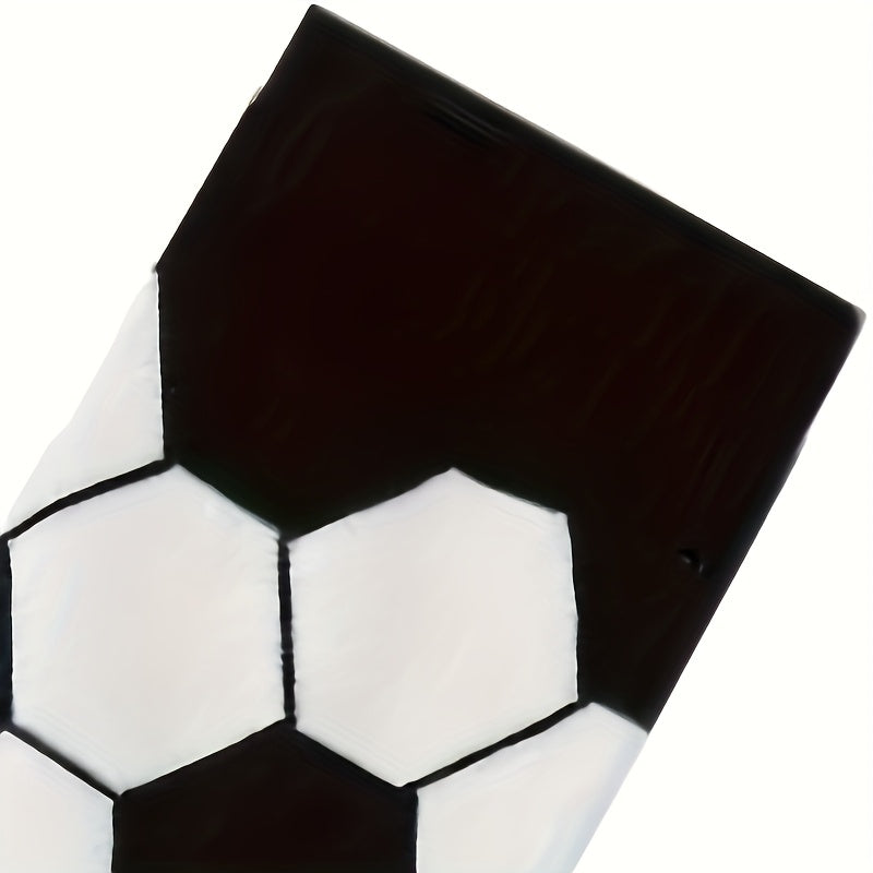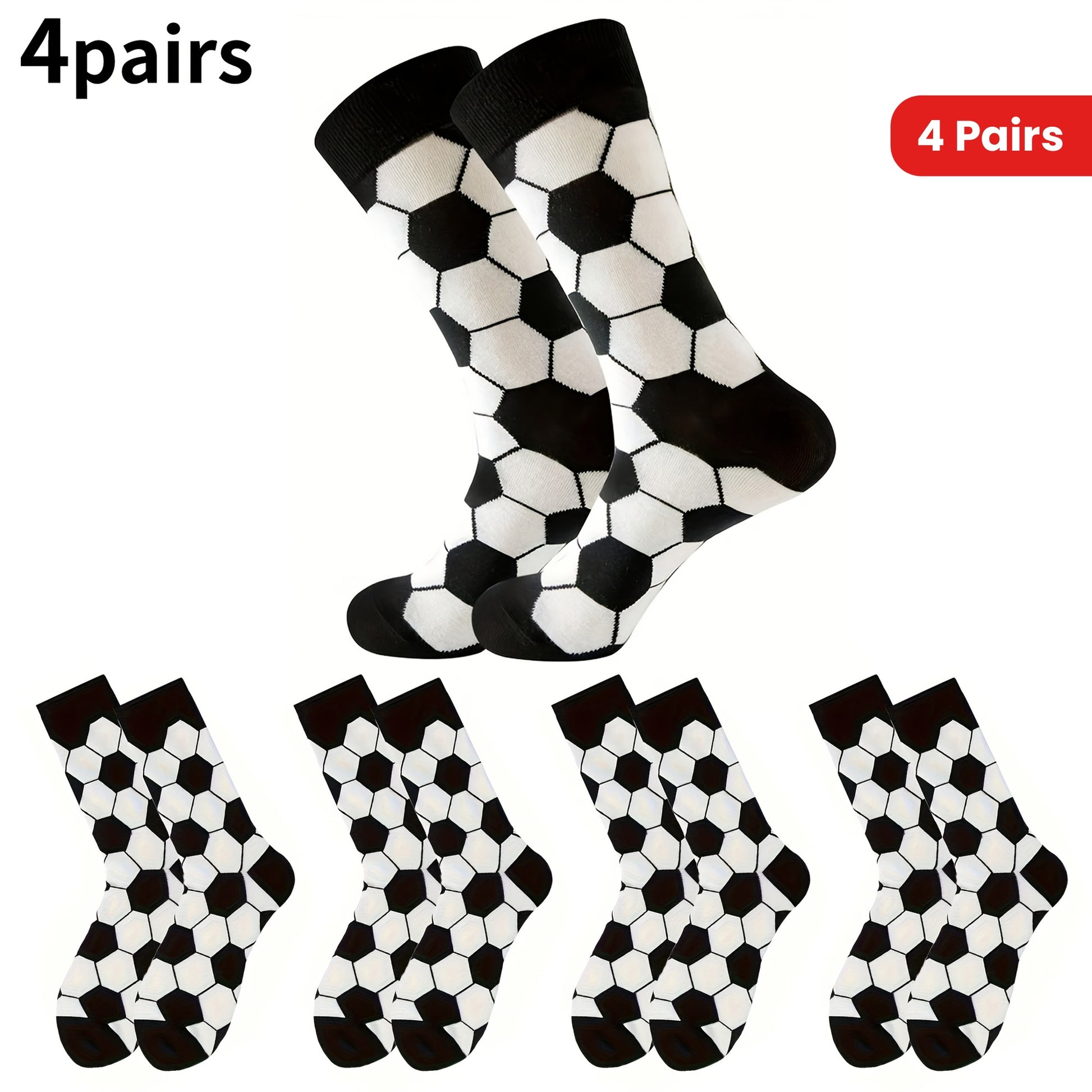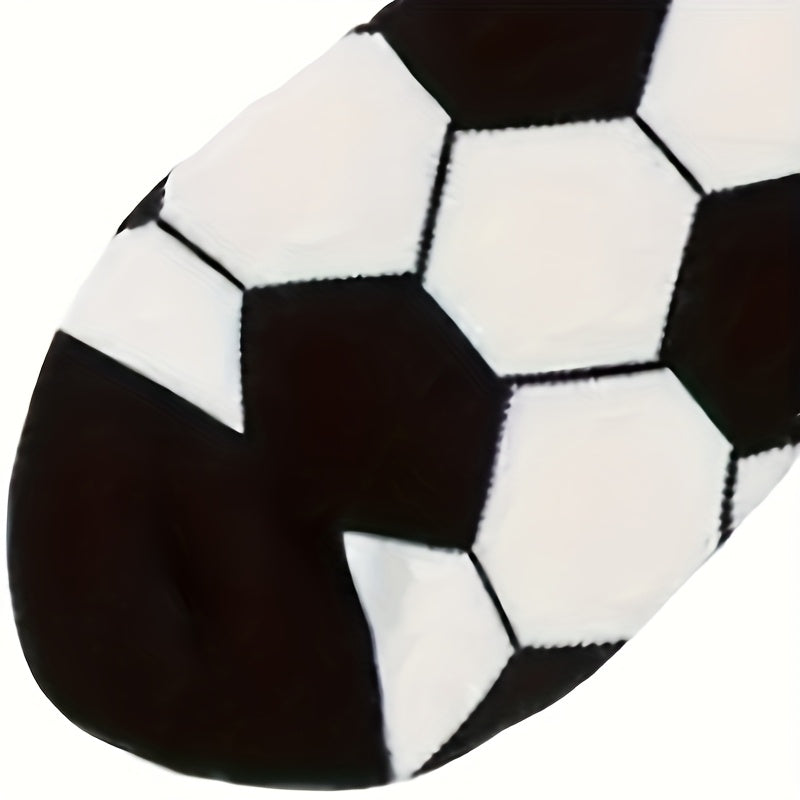 4 Pairs Kids Socks, Black and White Soccer Pattern, Polyester 80%, Elastane 20%, All-Season Knit Fabric, Mid-Calf Striped Plaid, Hand Washable, Trendy Sports Style for Boys and Girls
