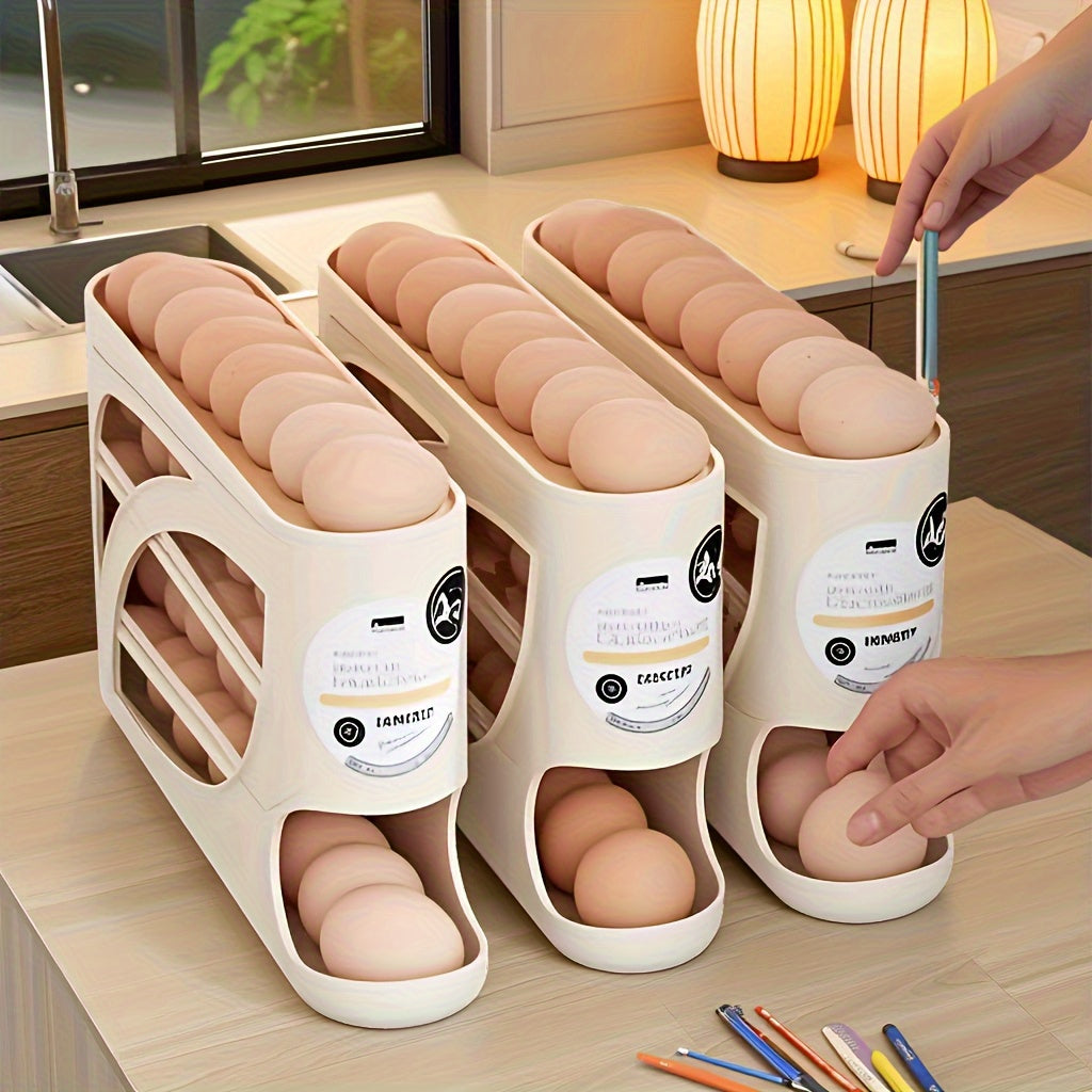 4-Tier Rolling Egg Holder - Space-Saving Side Door Design, Holds Up to 30 Eggs, Smooth Glossy Finish, Convenient Grip Handles, Ideal for Kitchen & Refrigerator Storage, Kitchen Organization | Modern Kitchen Accessory | Durable Plastic Holder,