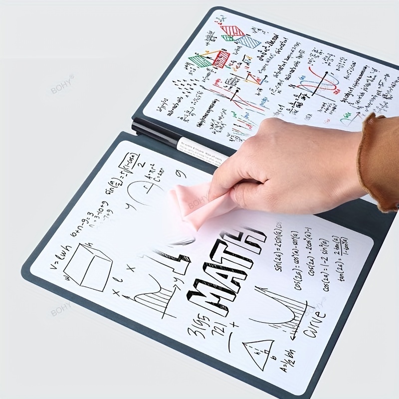 A5 Reusable Whiteboard Notebook with Faux Leather Cover - Portable Weekly Planner, Math Formulae & Illustrations Erase Cleanly, Includes Pen & Cloth, Ideal for Office & School, Notebooks for School