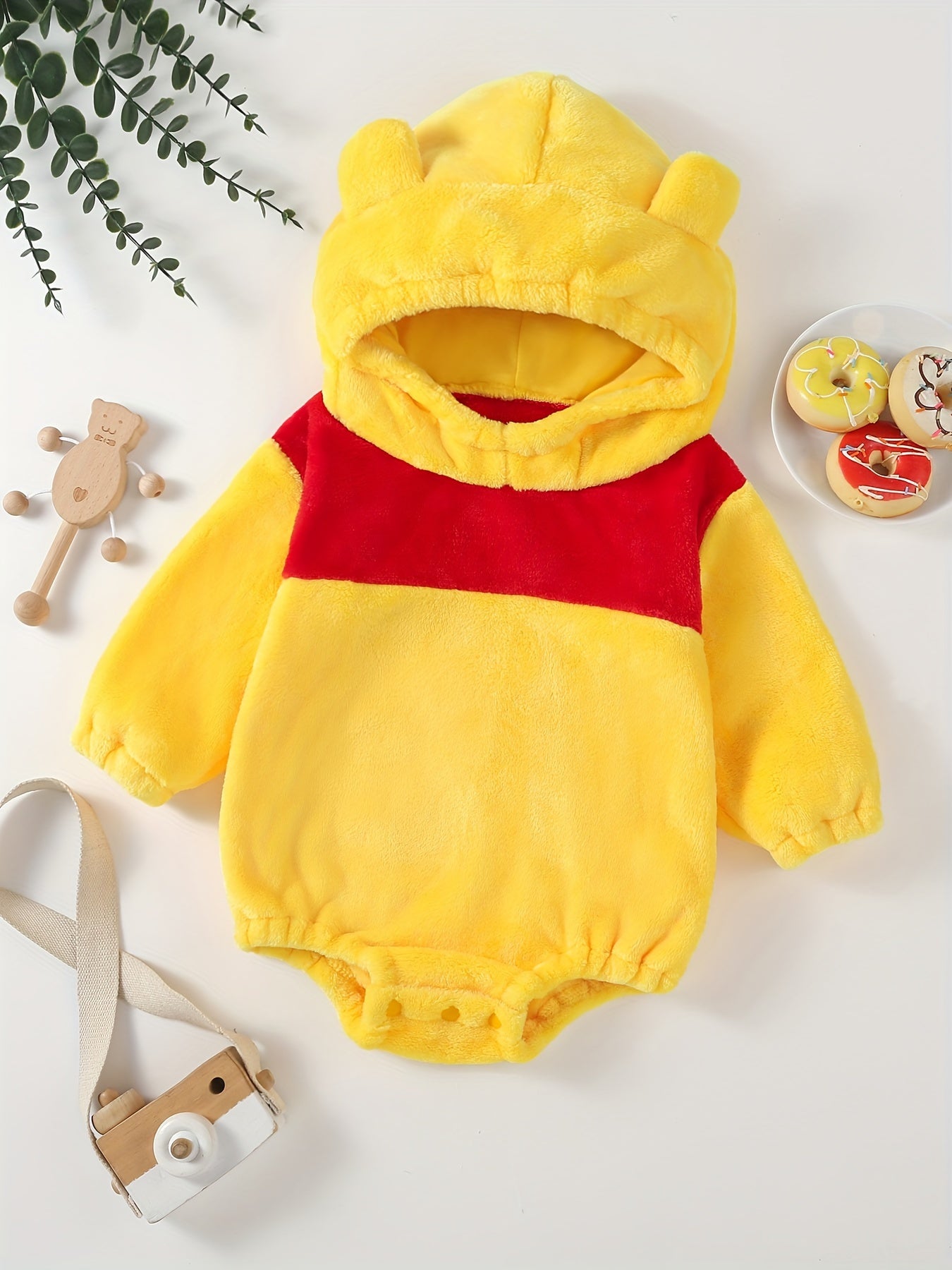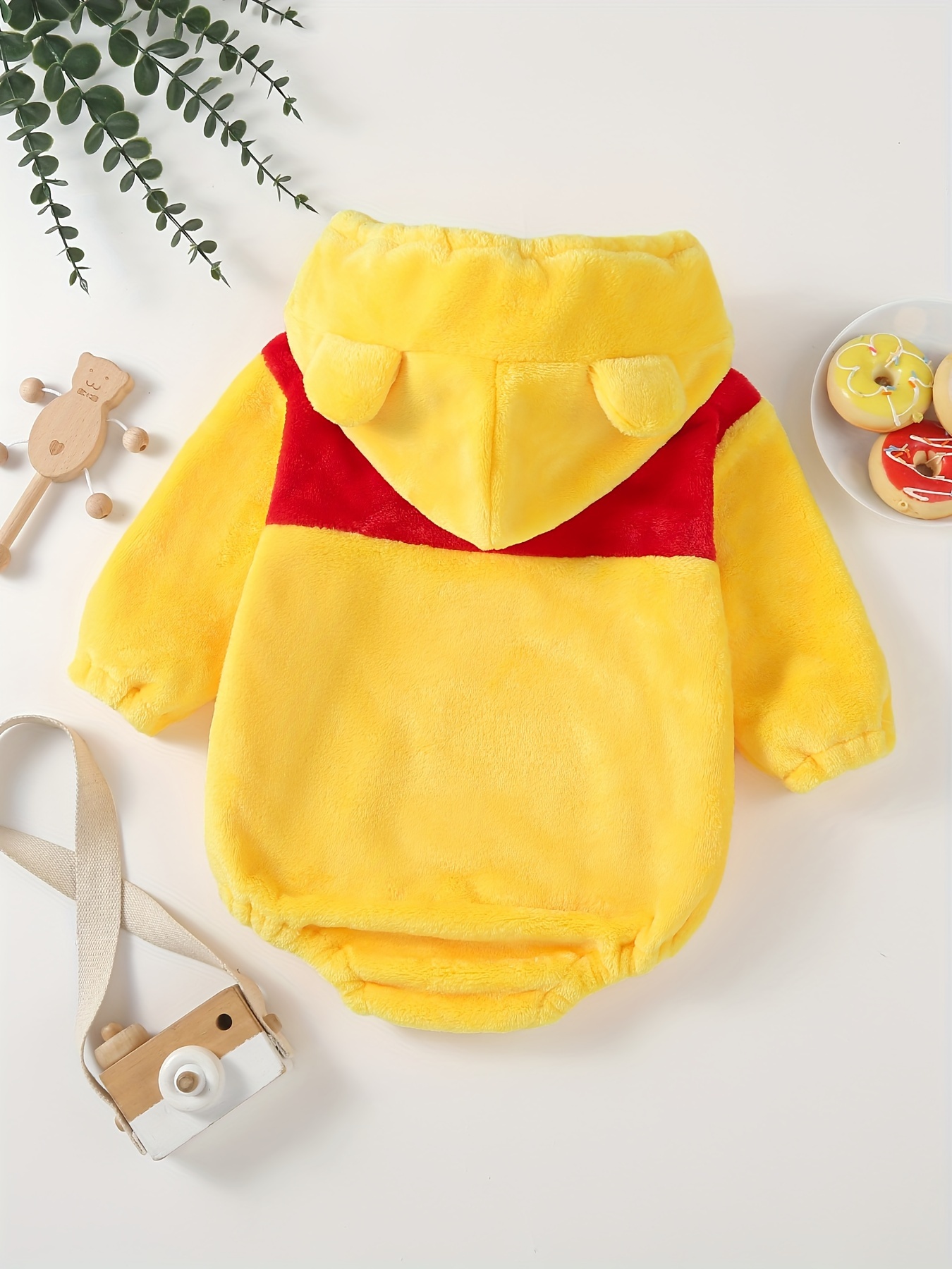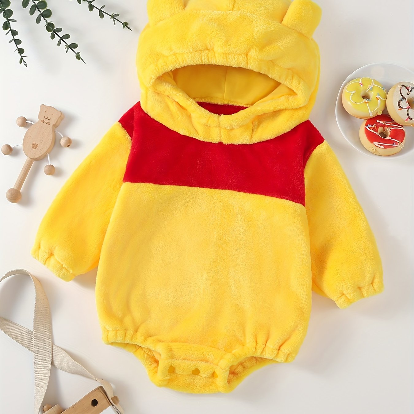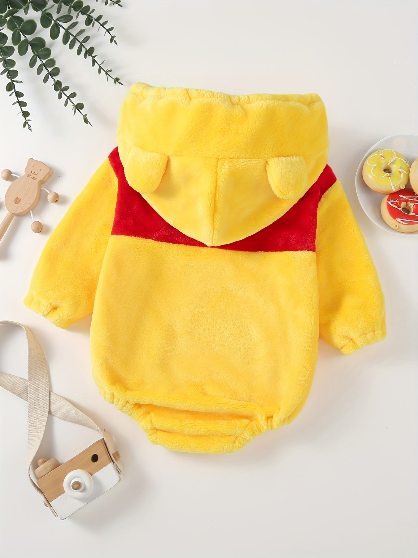 Baby's Cute Bear Character Themed Warm Fuzzy Hooded Long Sleeve Bodysuit, Toddler & Infant Girl's Onesie For Spring & Fall Outdoors