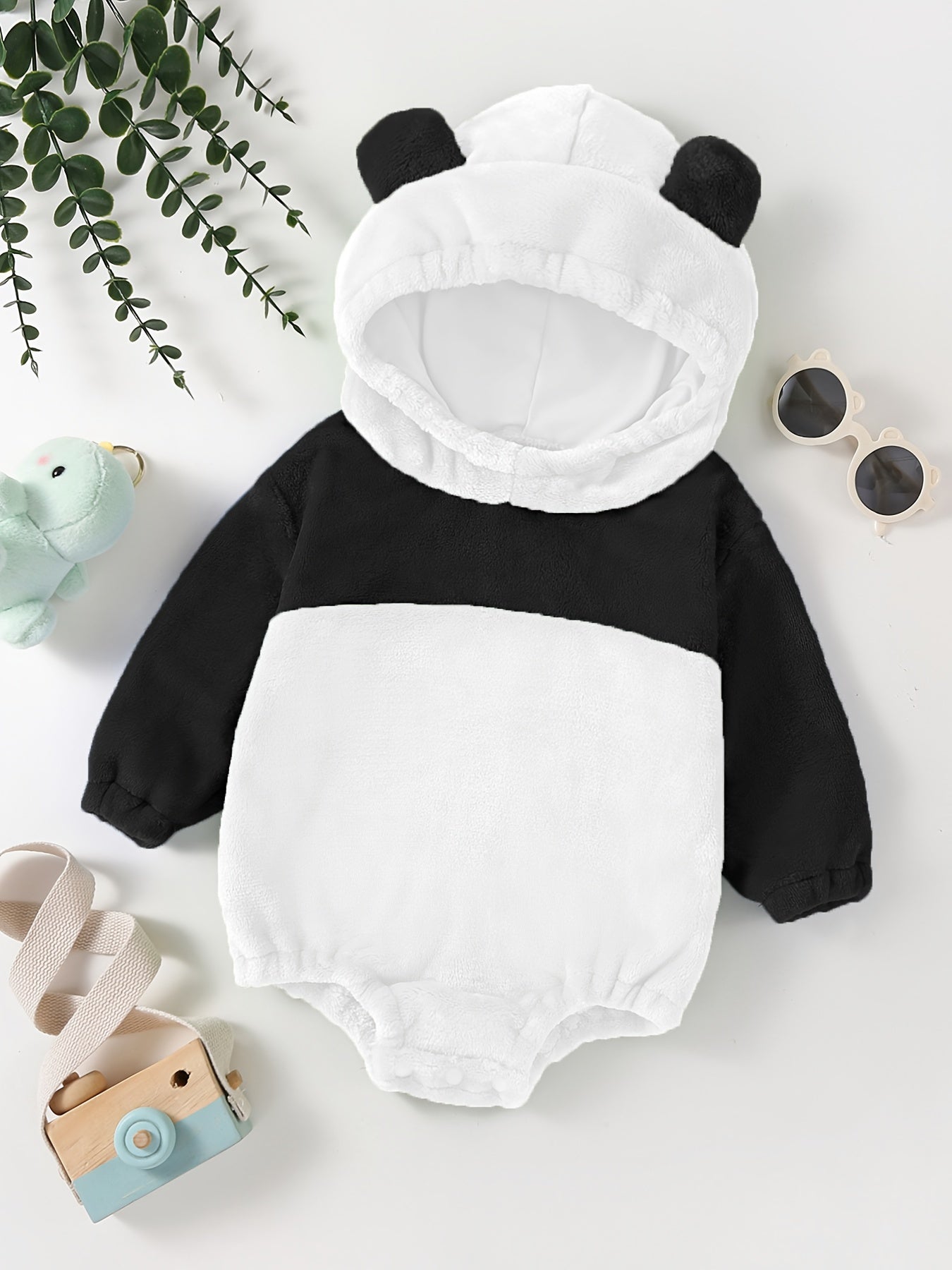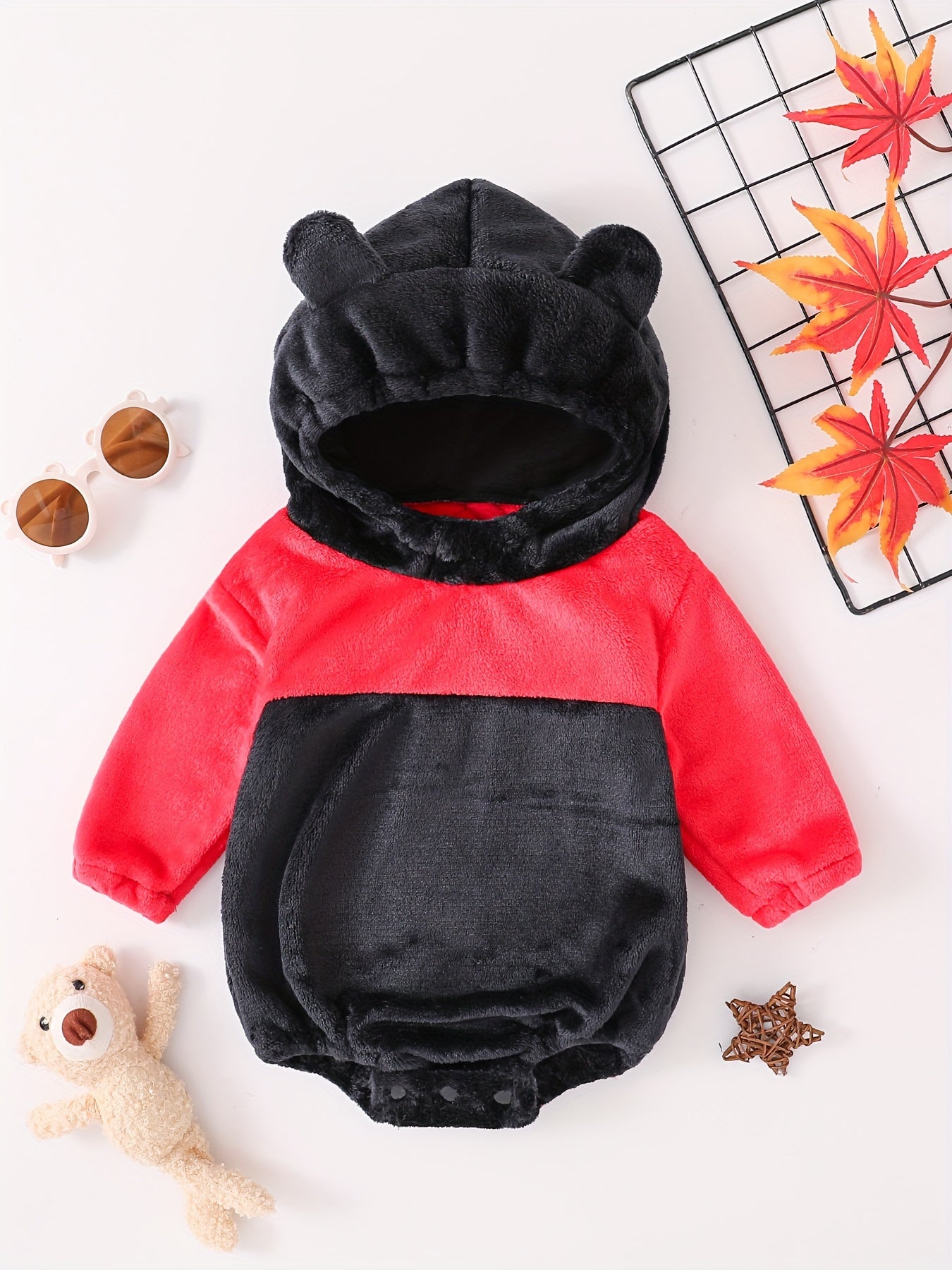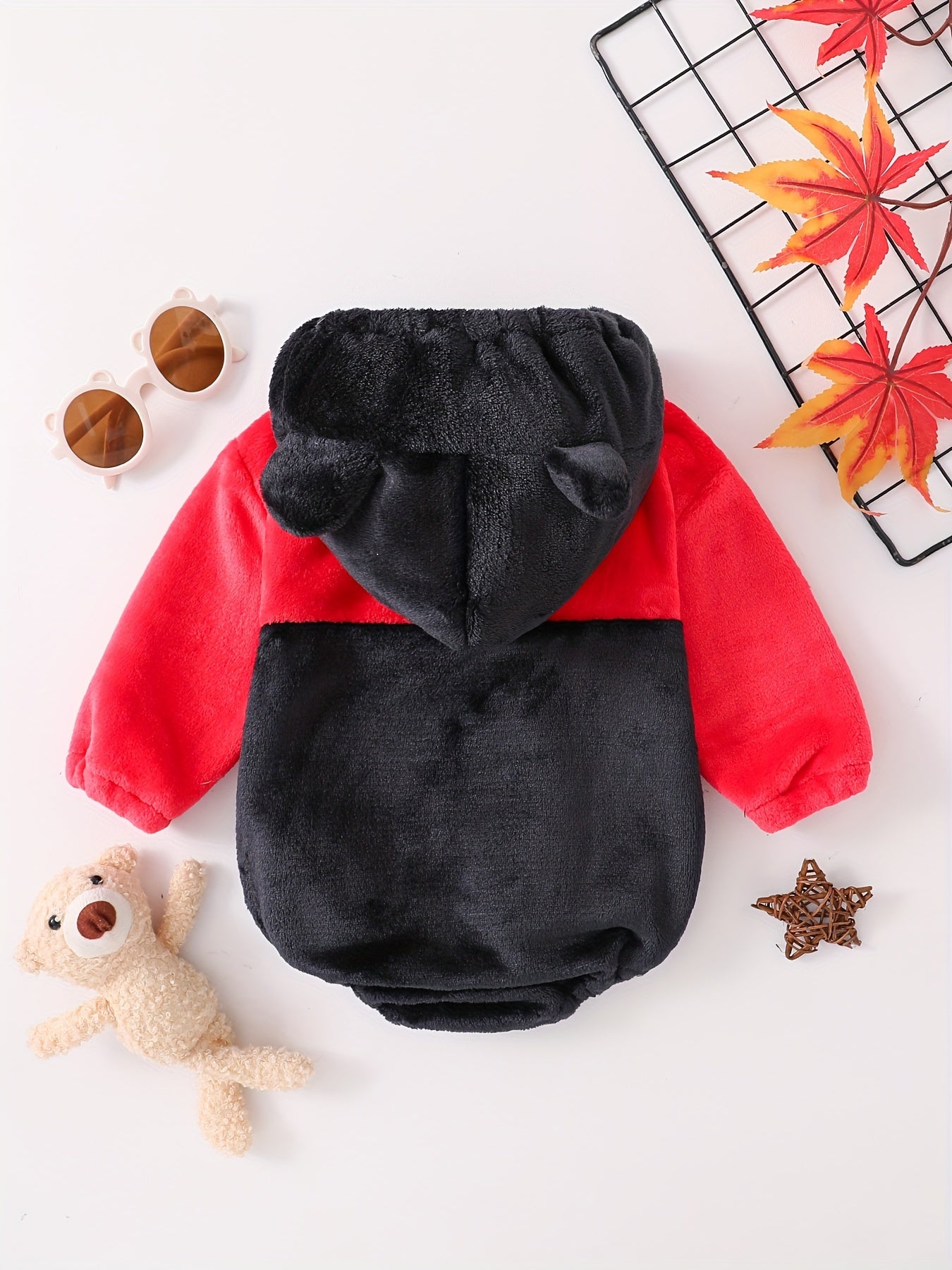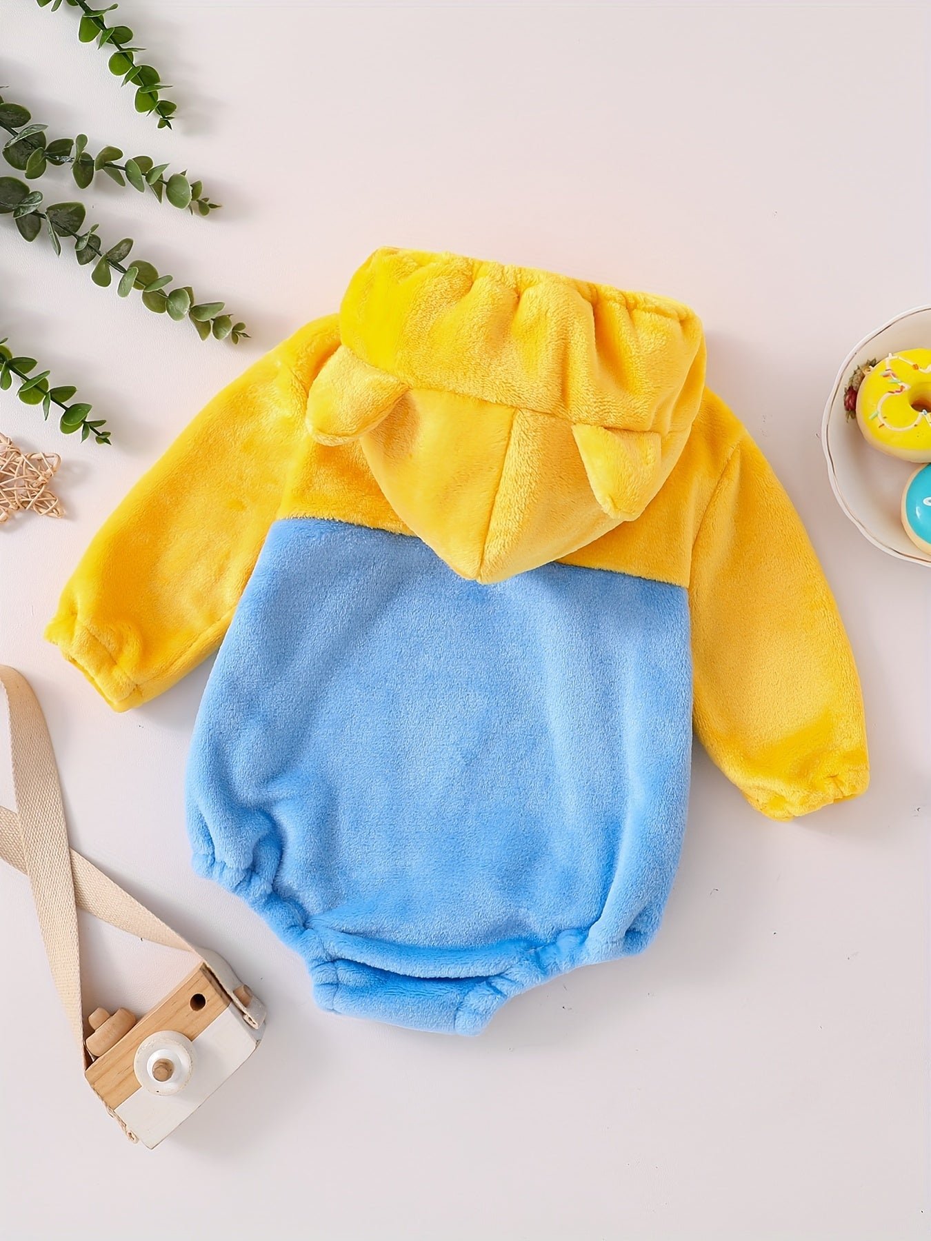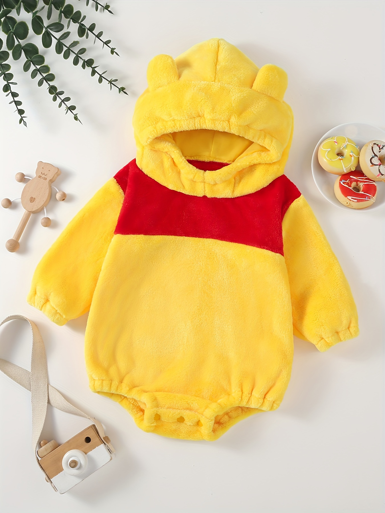Baby's Cute Bear Character Themed Warm Fuzzy Hooded Long Sleeve Bodysuit, Toddler & Infant Girl's Onesie For Spring & Fall Outdoors