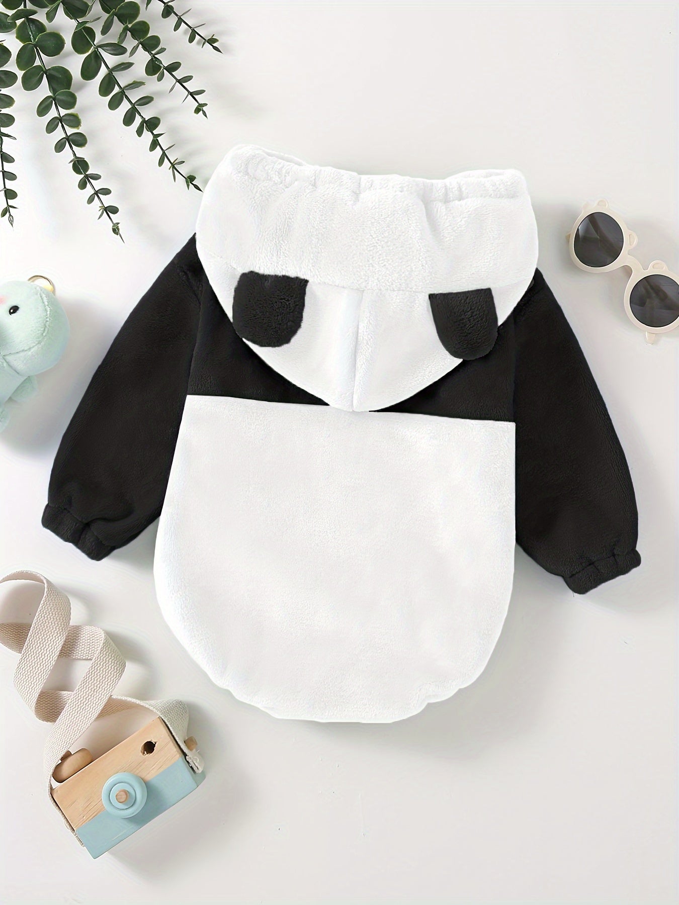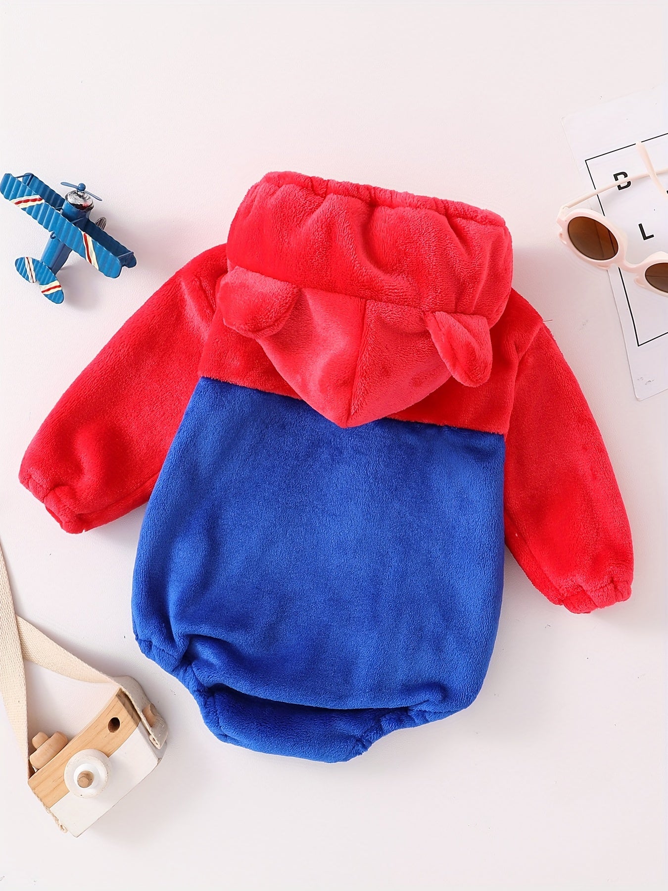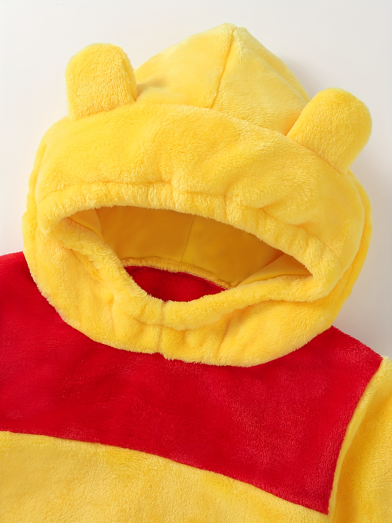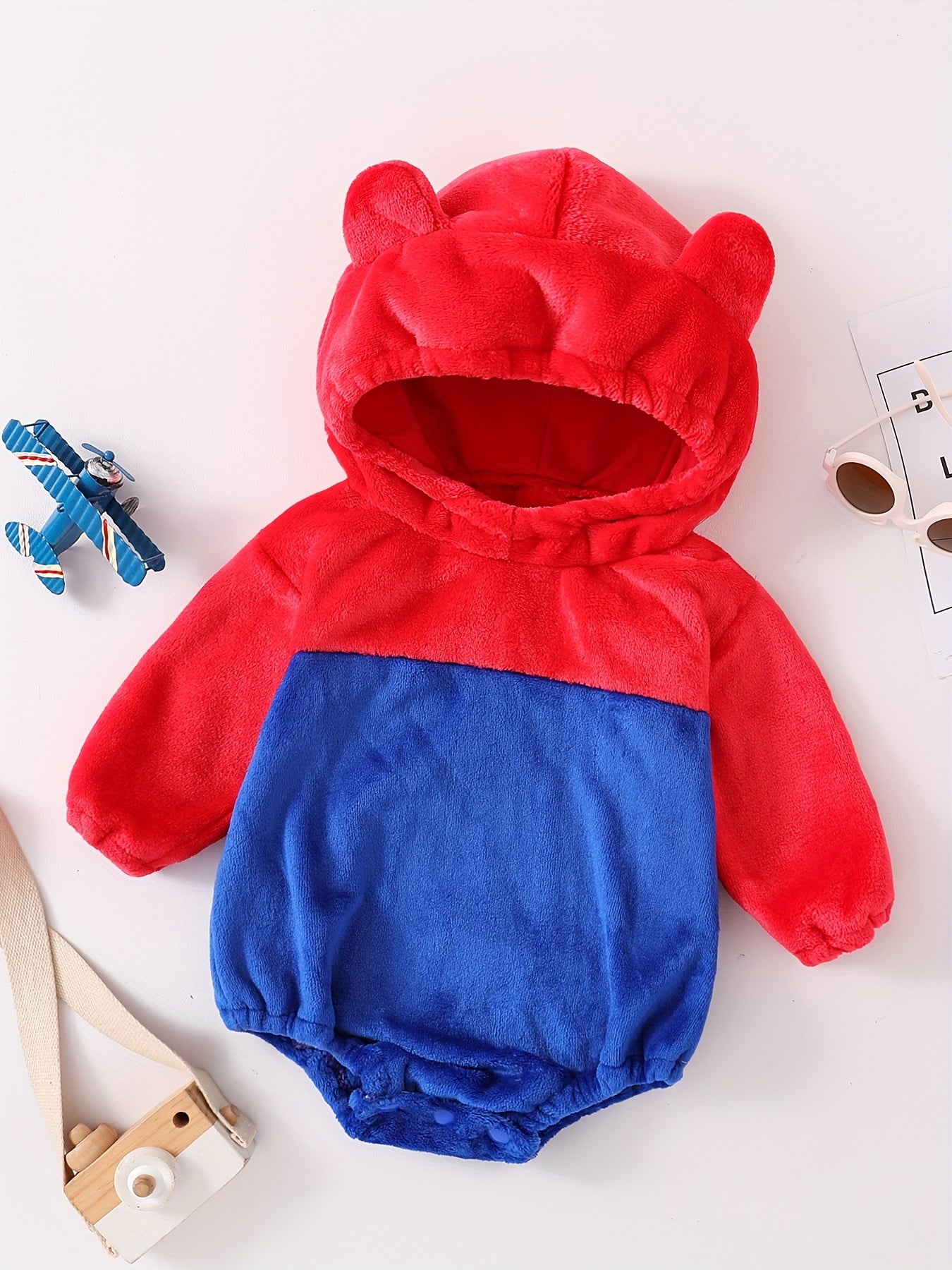 Baby's Cute Bear Character Themed Warm Fuzzy Hooded Long Sleeve Bodysuit, Toddler & Infant Girl's Onesie For Spring & Fall Outdoors