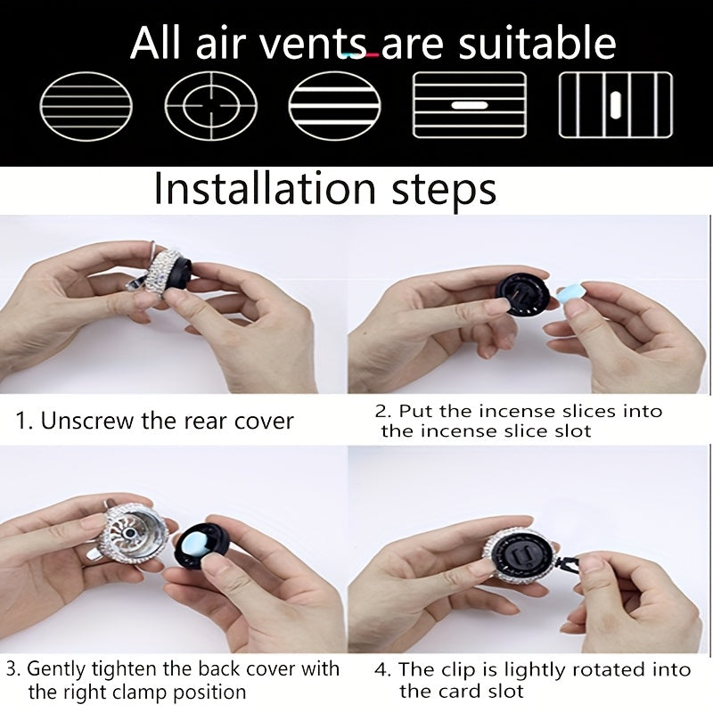 Instructions for use: 1. Remove the back cover of the device, place the incense pellets inside, and secure the cover. 2. Attach the designated black air outlet clip. 3. Plug the device into the car's air conditioning vent. 4. Activate the air conditioning, direct the airflow towards the fan blade of the device, and carefully spin the blade with your fingers. The fan blade should start to turn. Enjoy using it!