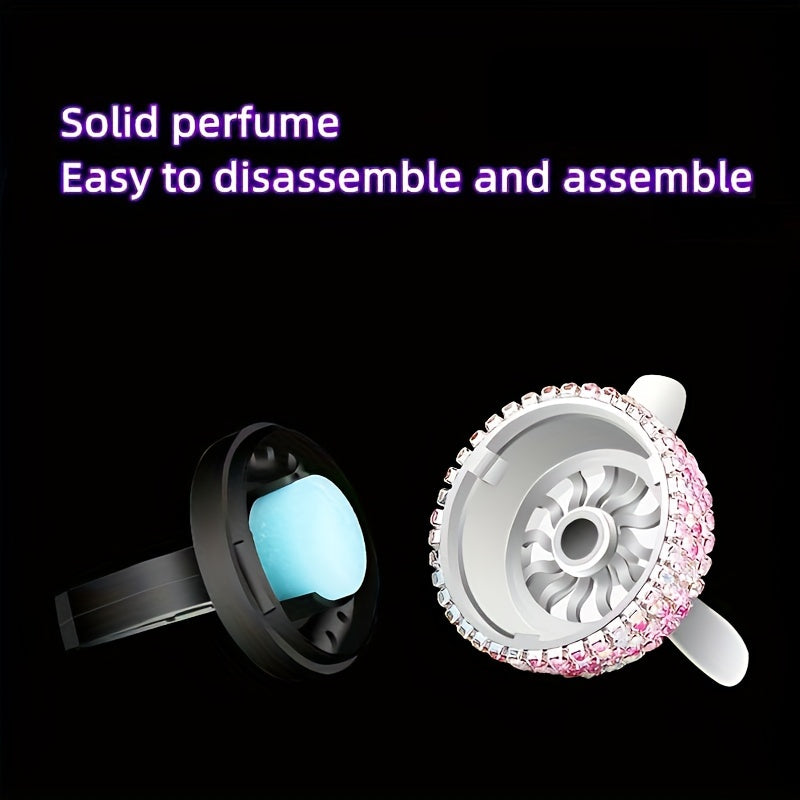 Introducing a product: Handcrafted rhinestones designed as a classic car air conditioning fragrance. It serves as a lovely accessory placed in the car's air vent, allowing the scent to disperse gently with the breeze. Made from ABS plastic and imitation rhinestones, it comes in colors like white, pink, and purple. Each fragrance refill lasts approximately 15-20 days, and you can easily replace it with new ones.