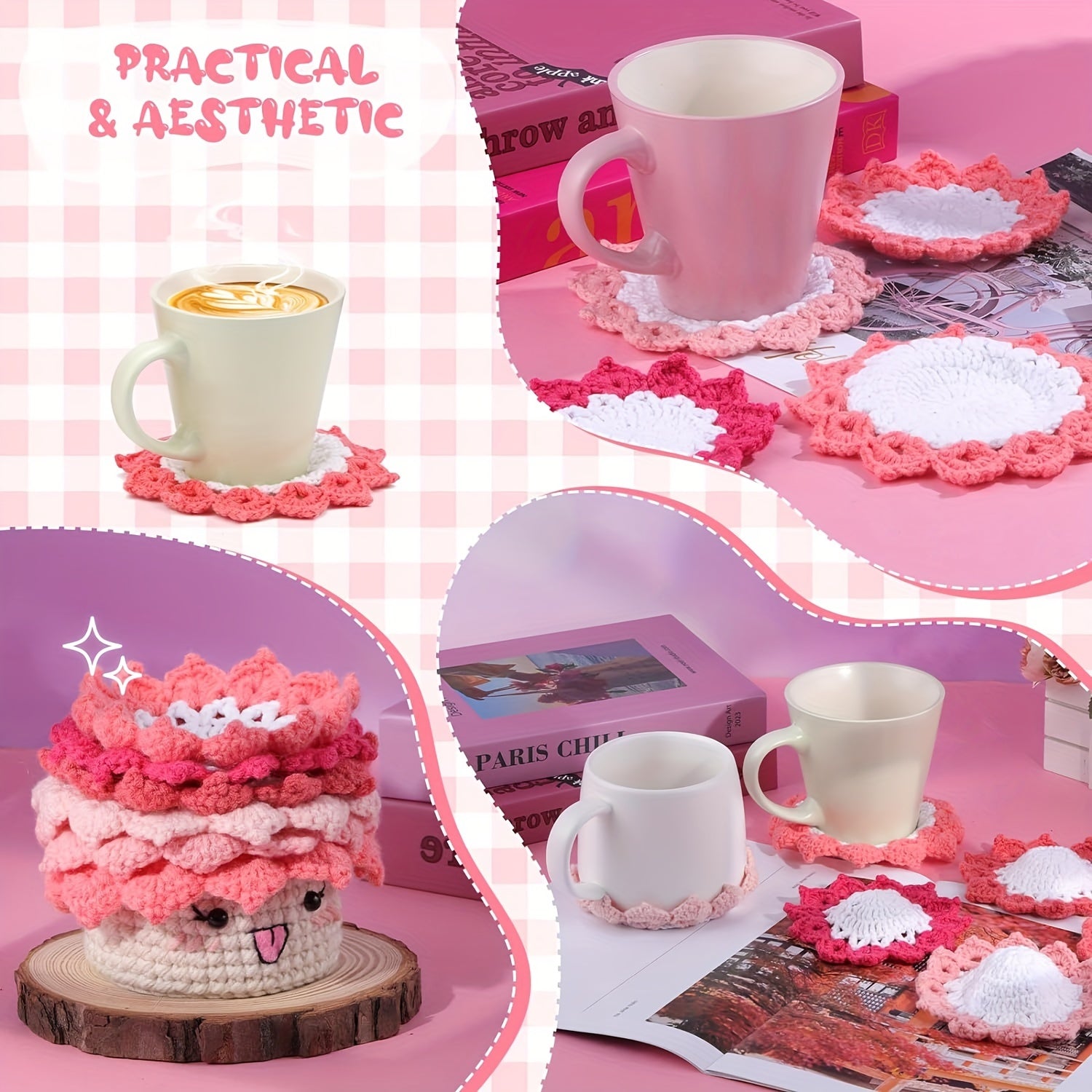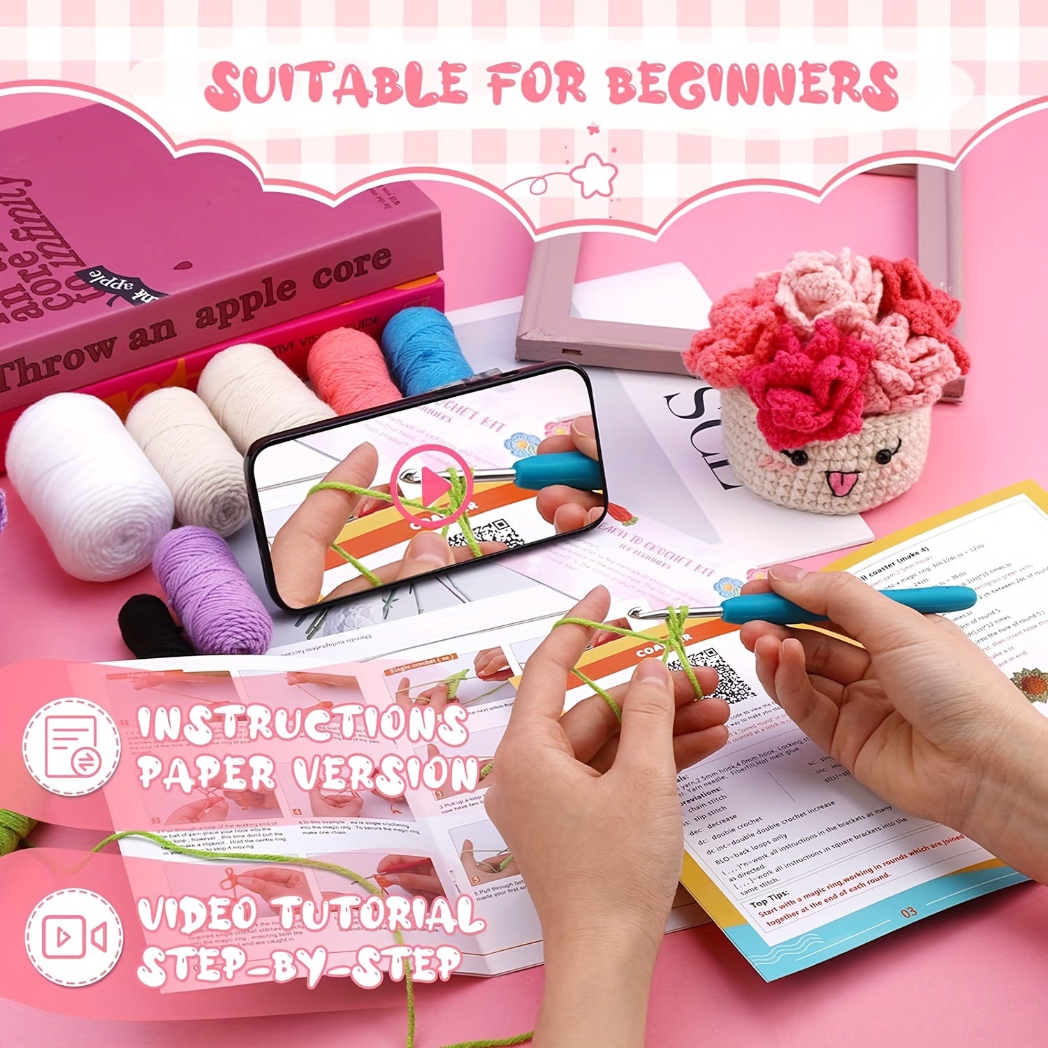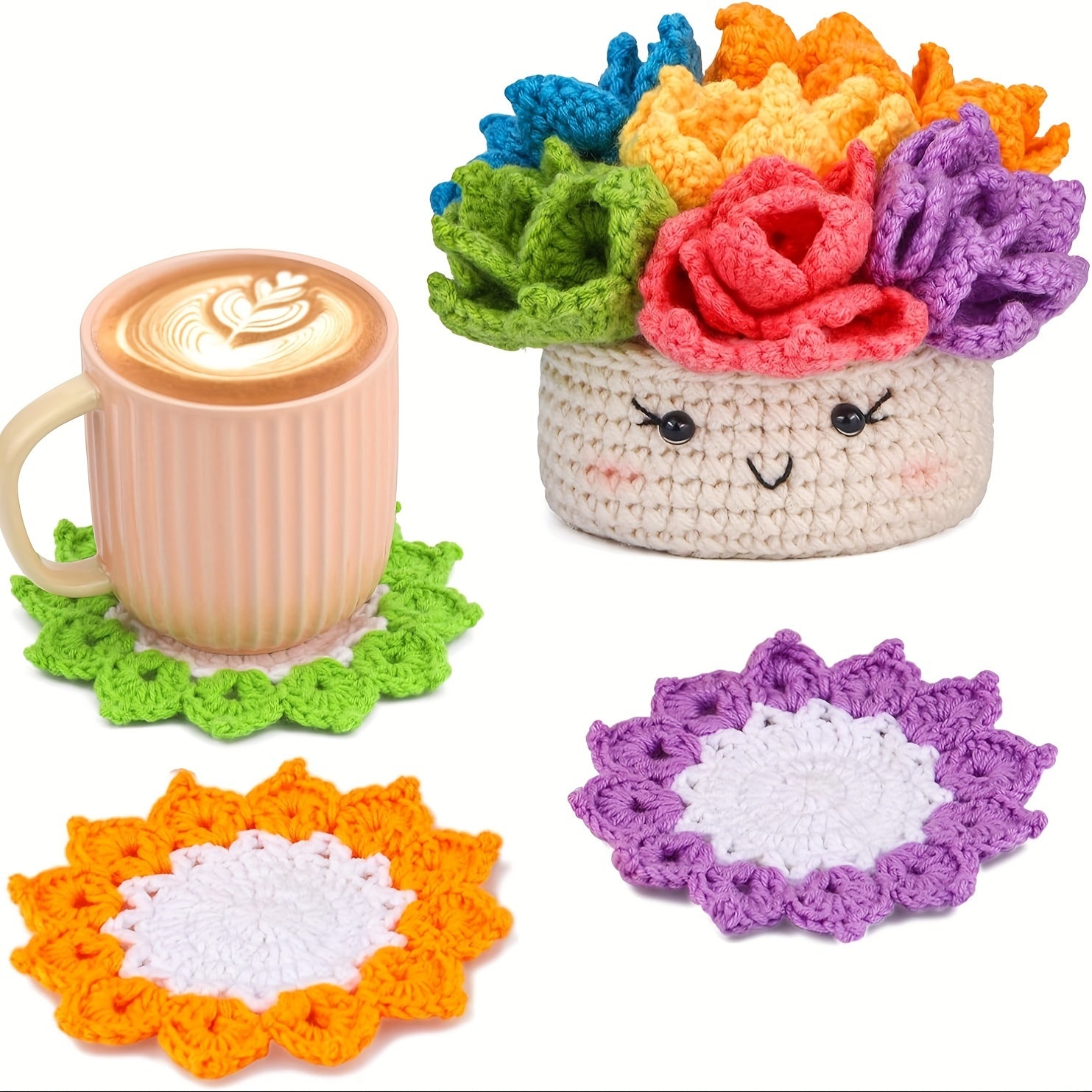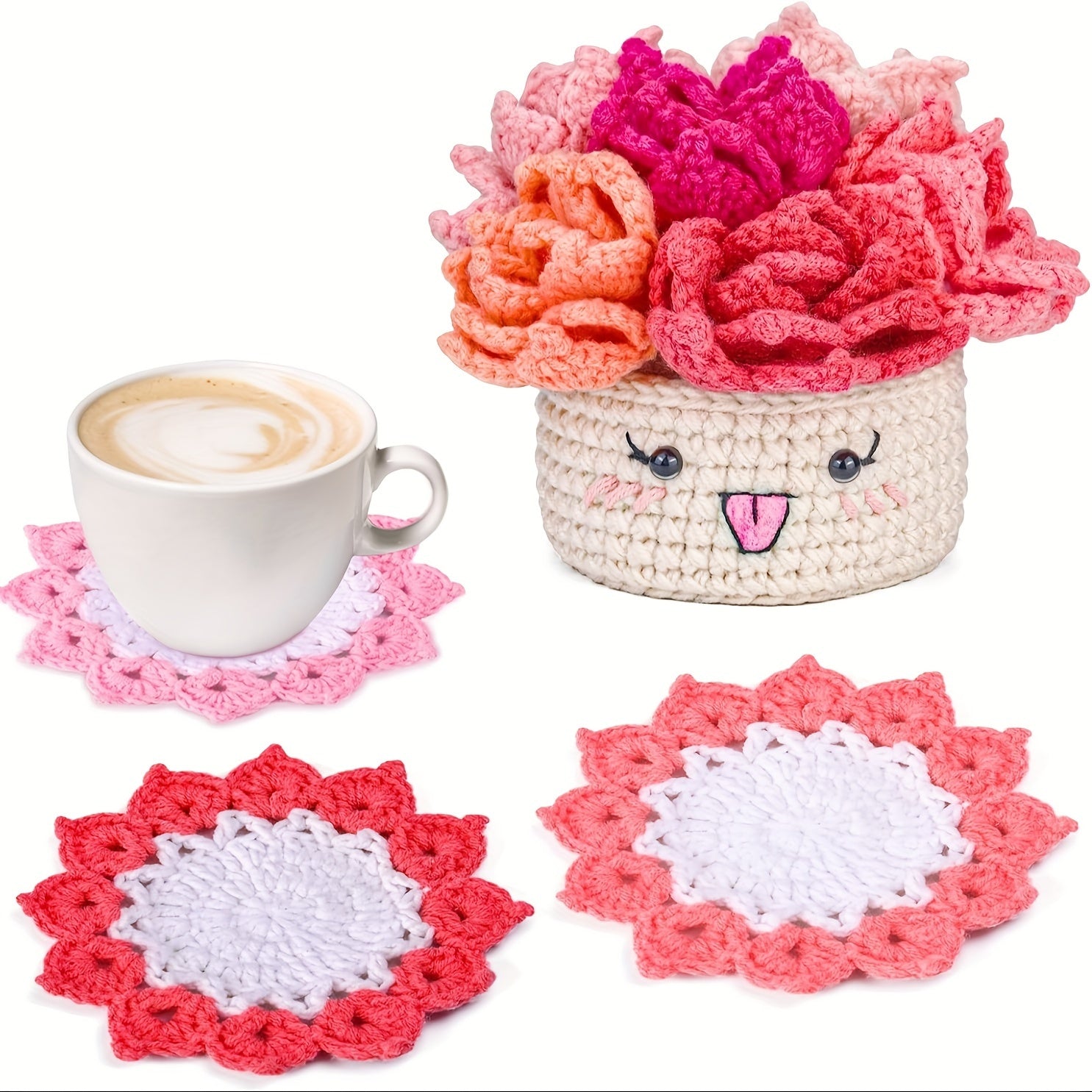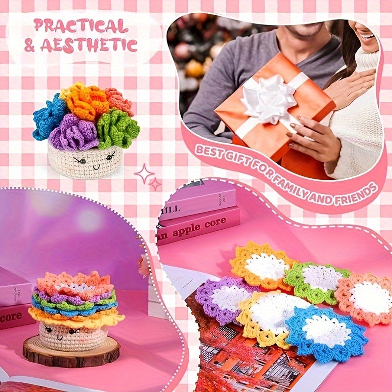 Crochet Set for Making Coasters Shaped Like Potted Plants, Complete with Video Guides And Crochet Hooks for Grown-Ups.