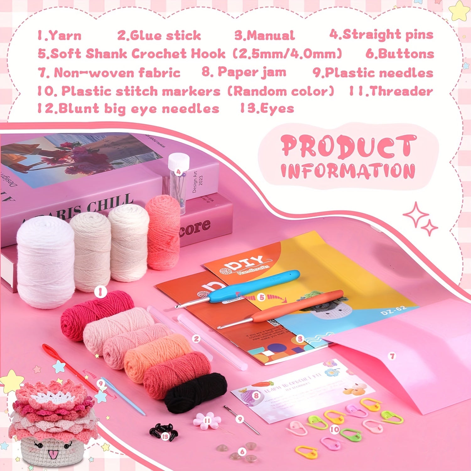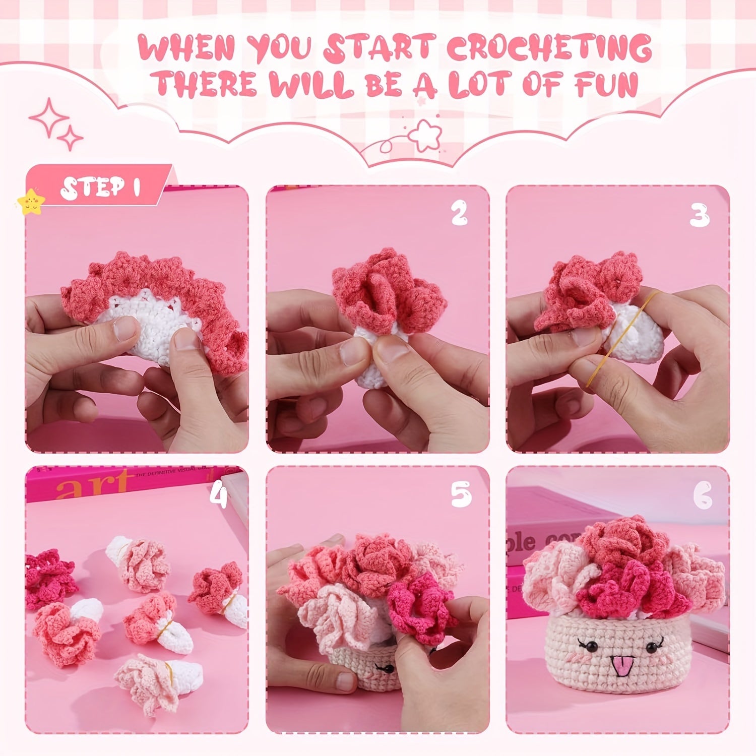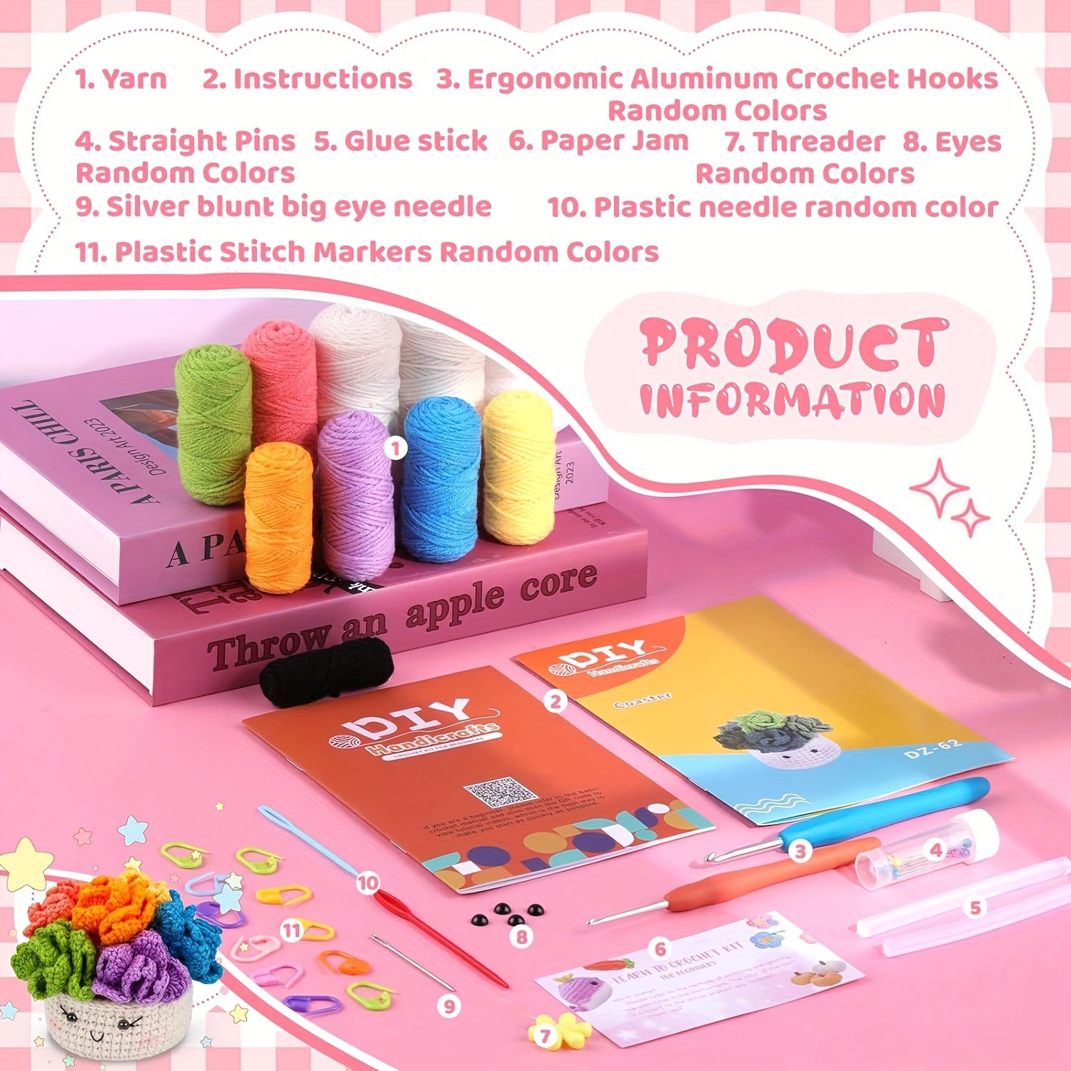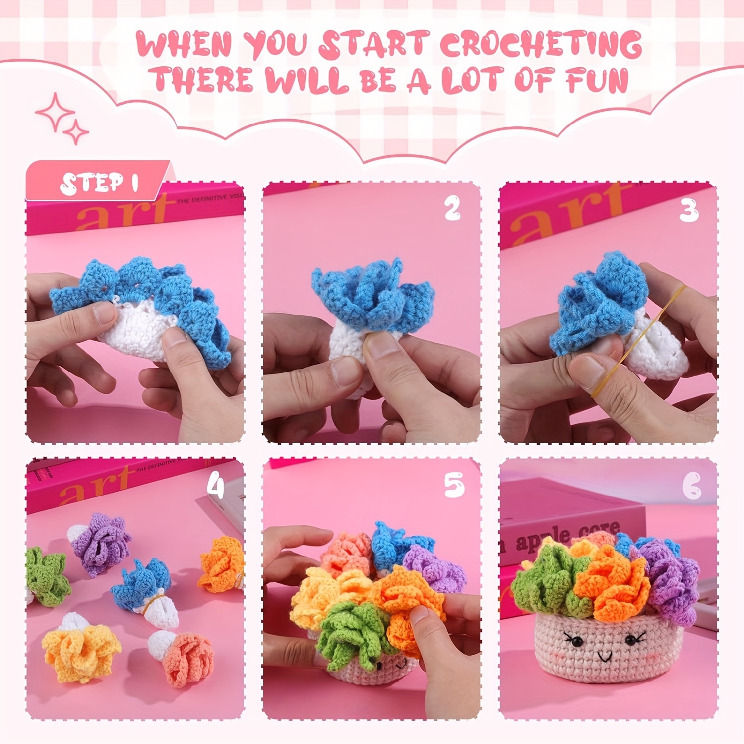 Crochet Set for Making Coasters Shaped Like Potted Plants, Complete with Video Guides And Crochet Hooks for Grown-Ups.