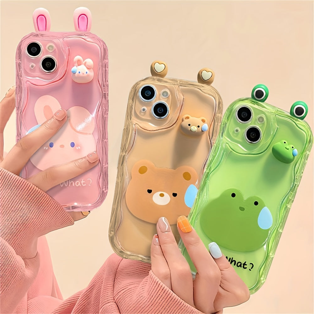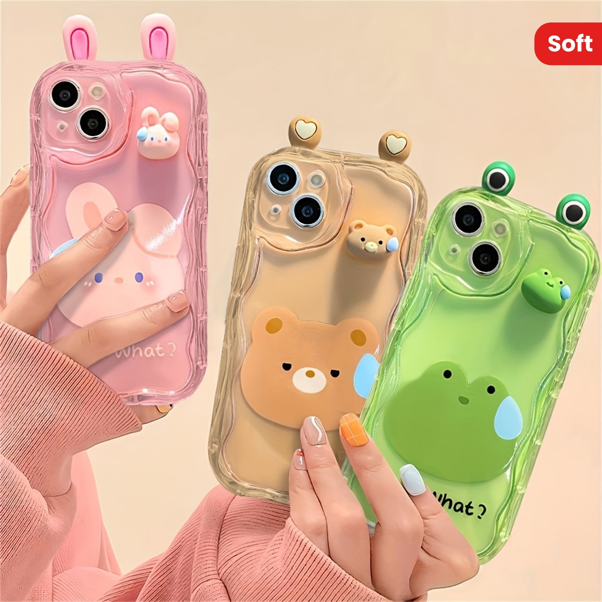 [Cute Cartoon Phone Case] iPhone 15 14 13 12 11 Pro Max XS Max X XR Soft Phone Case - Cute Cartoon 3D Transparent Pink Rabbit Green Frog Brown Bear Wavy Border Protector - Soft Cover