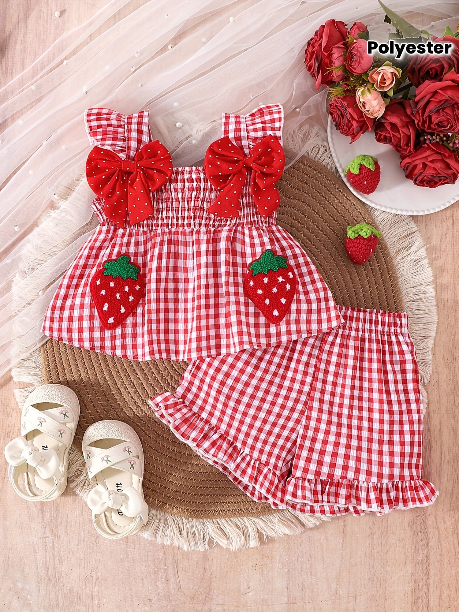 [Cute Summer Set] 2pcs Cute Summer Strawberry Top and Shorts Set | Ruffle Collar, Elastic Waist, Gingham Details, Playful Bow Accents - Outdoor Toddler Outfit