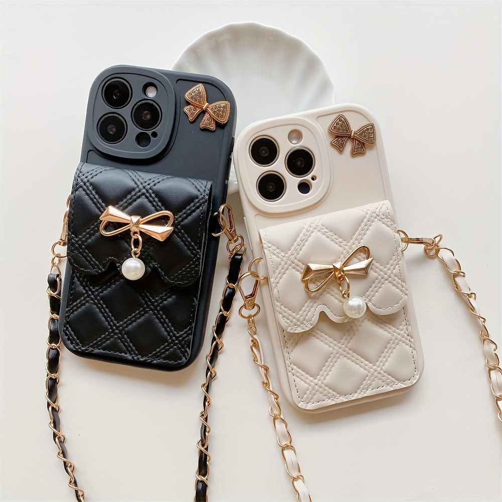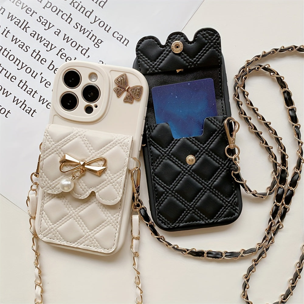 Diamond Grid Bow Card Phone Case Suitable for iPhone 15Promax/14plus with Lanyard Can Be Carried Obliquely 12pro/13promax Full Cover 12Mini/13Mini Soft Case 11 Protective Case Coin Purse