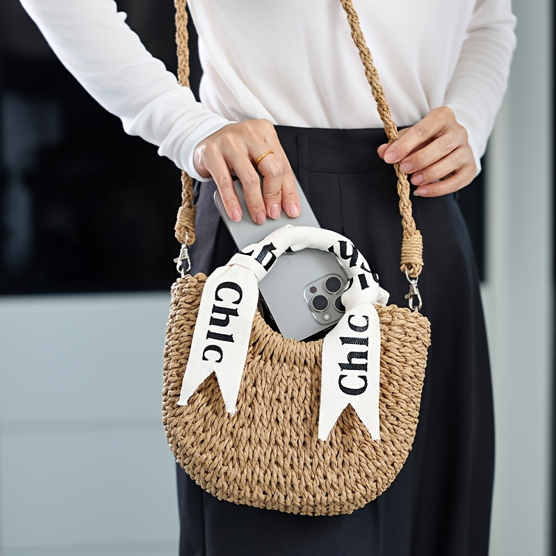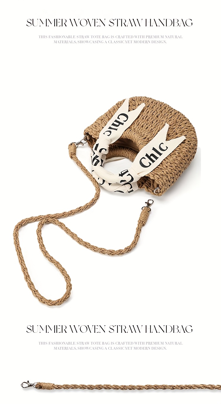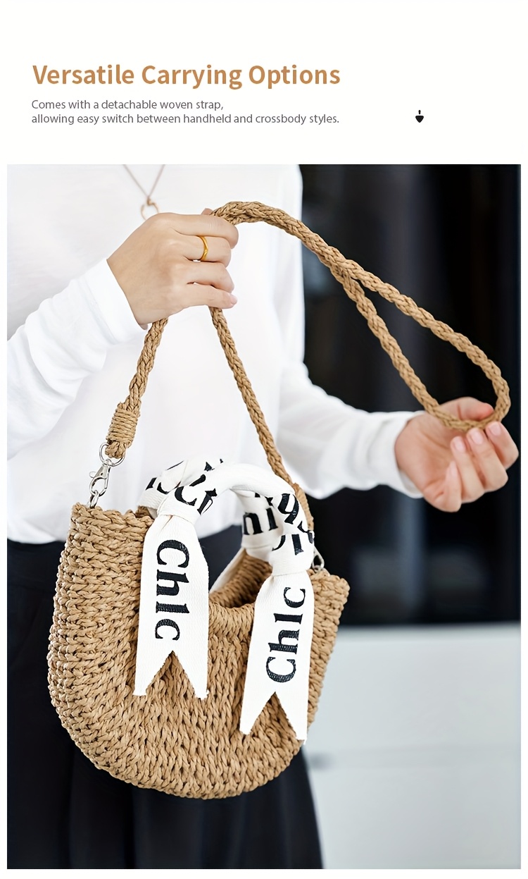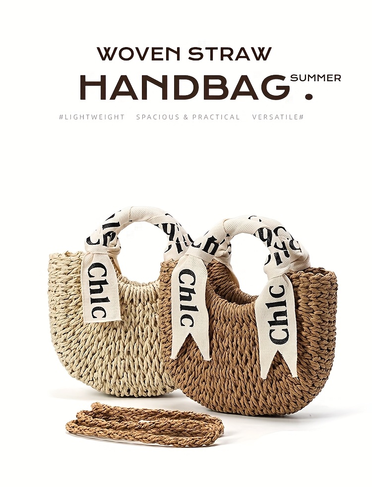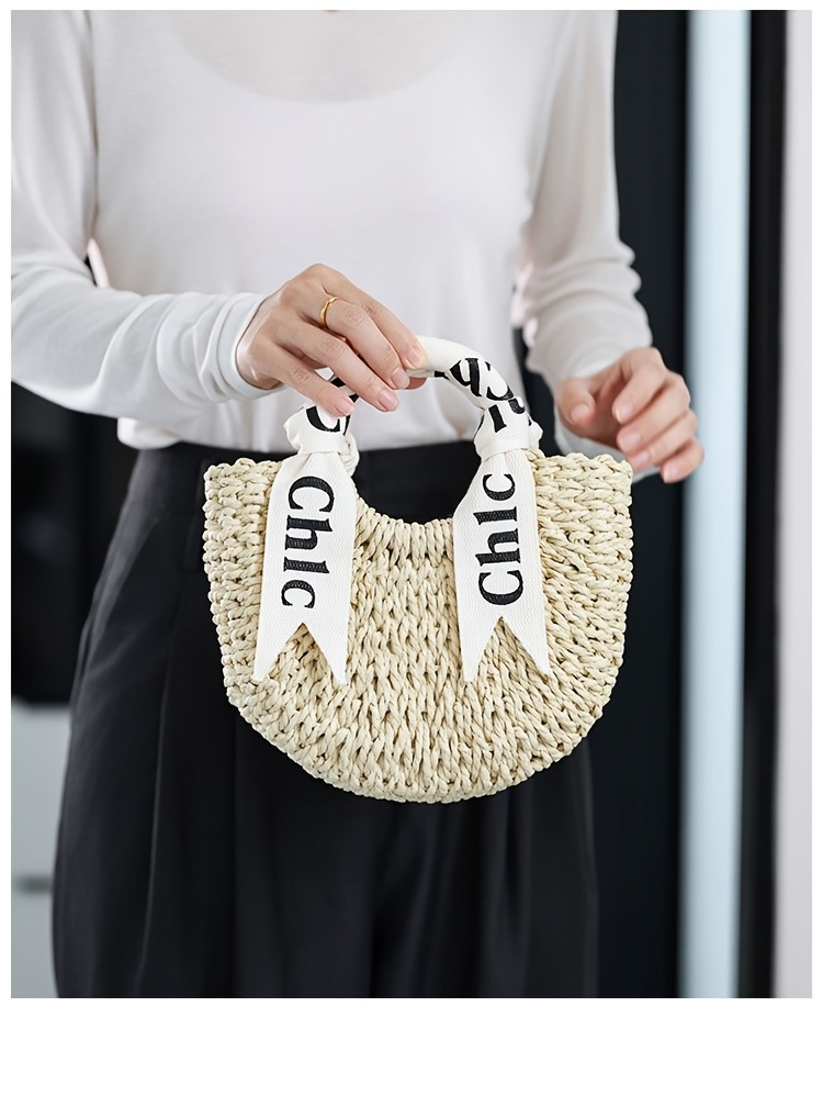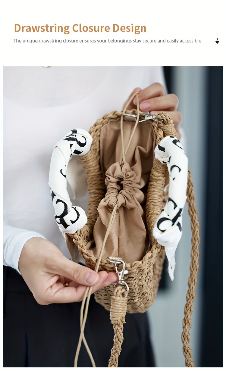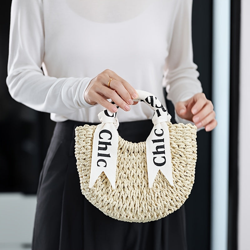 [Elegant Handbag] Elegant Straw Weaving Handbag | Simple and Stylish Women's Shoulder Bag Summer Beach Bag, Semi-Circular with Drawstring Closure, Casual Beach Tote