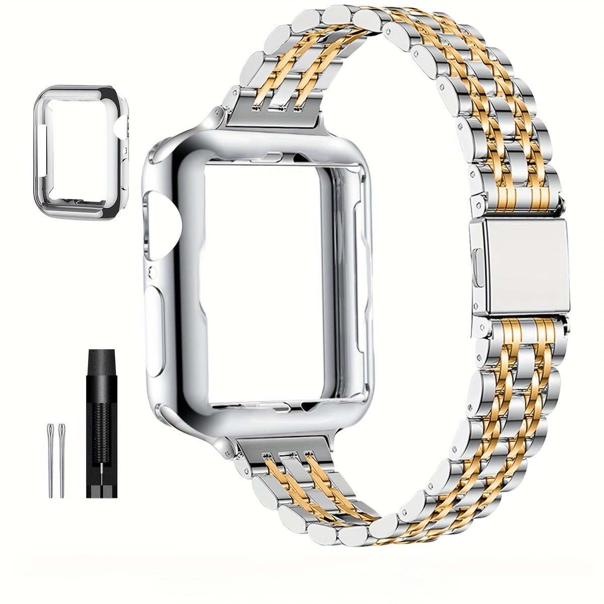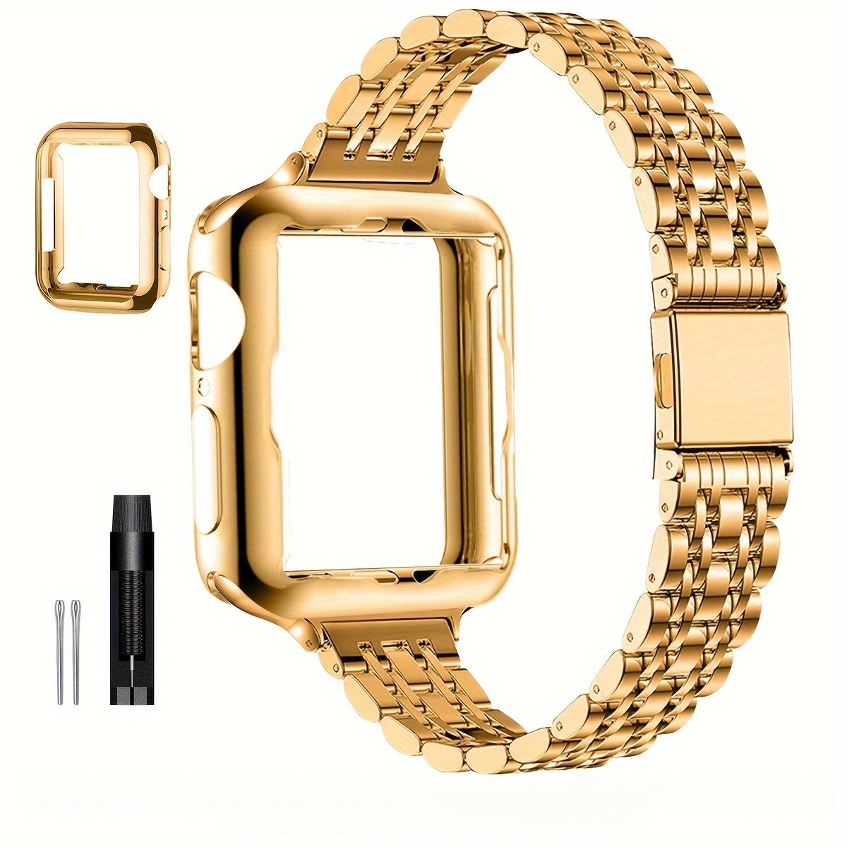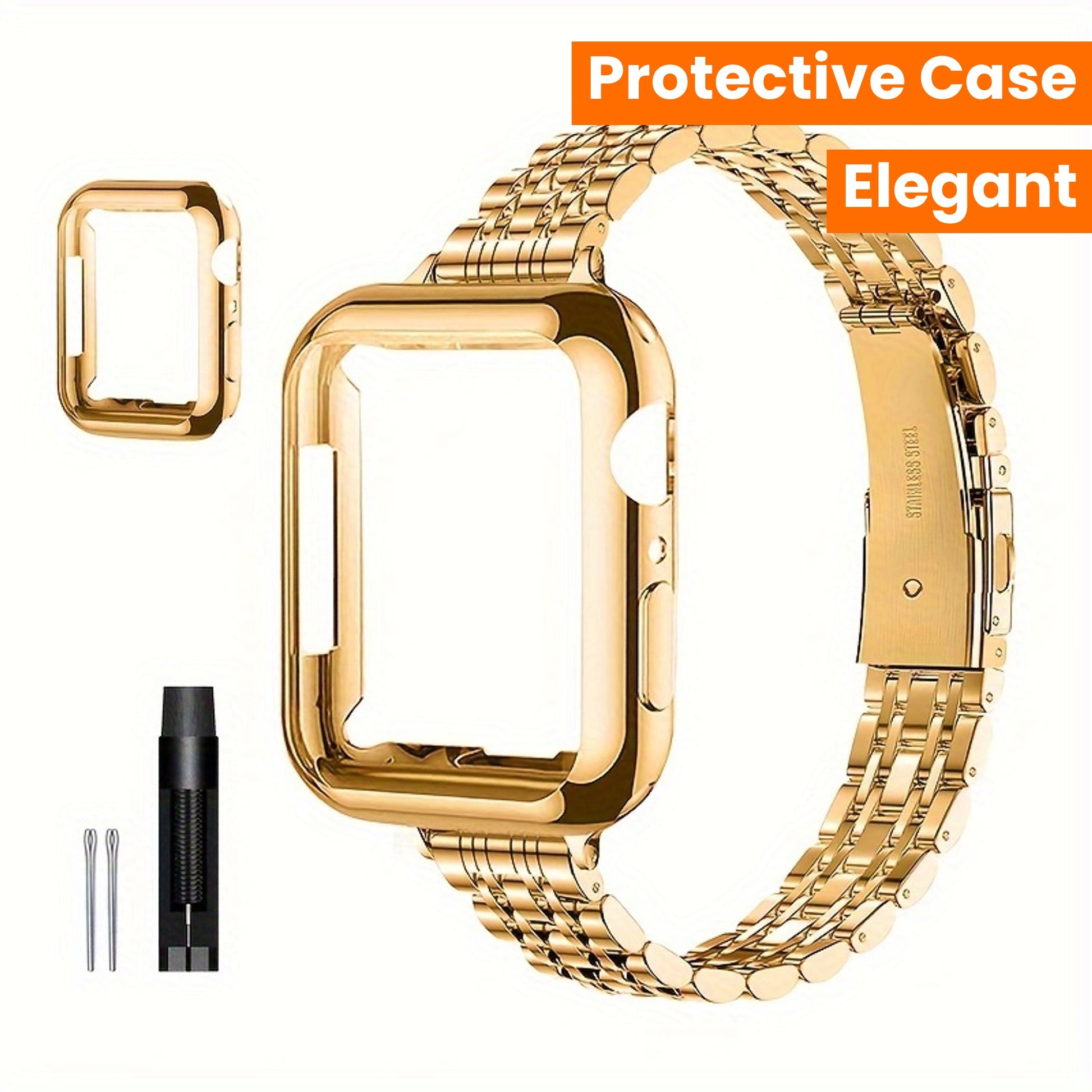 [Elegant Watch Band] Gold-Plated Stainless Steel 1pc Watch Band | Foldover Clasp and Protective Case for Apple Watch, Compatible with iWatch Series 1-9/SE/SE2, Elegant Women's Wristband Accessory