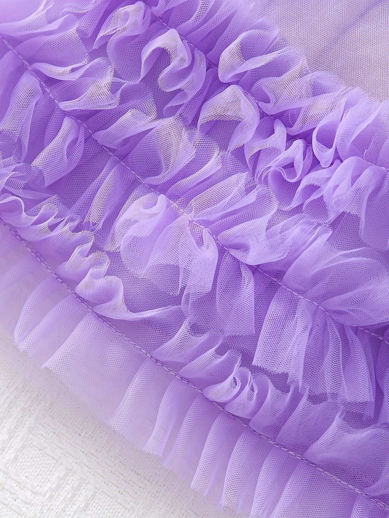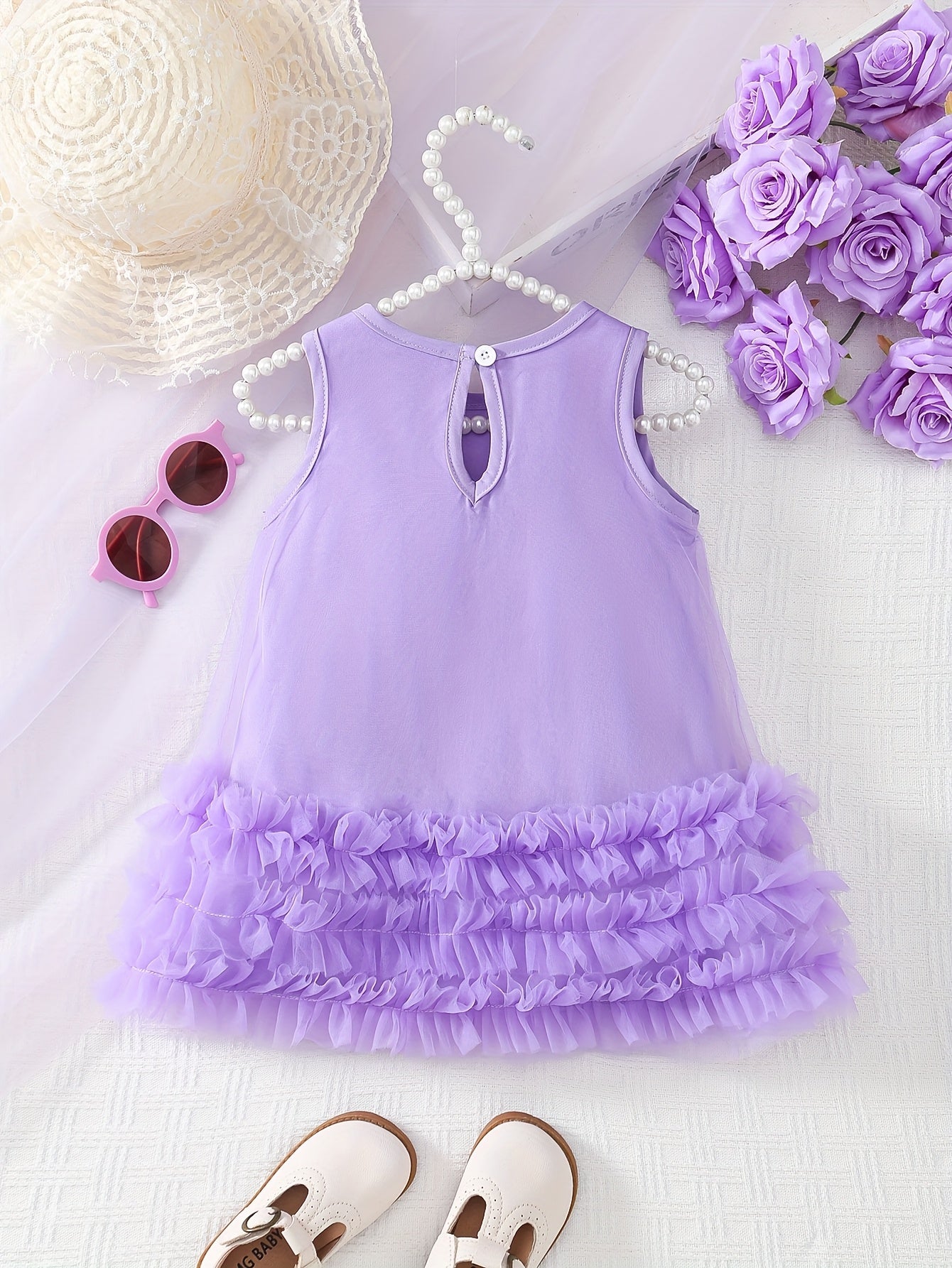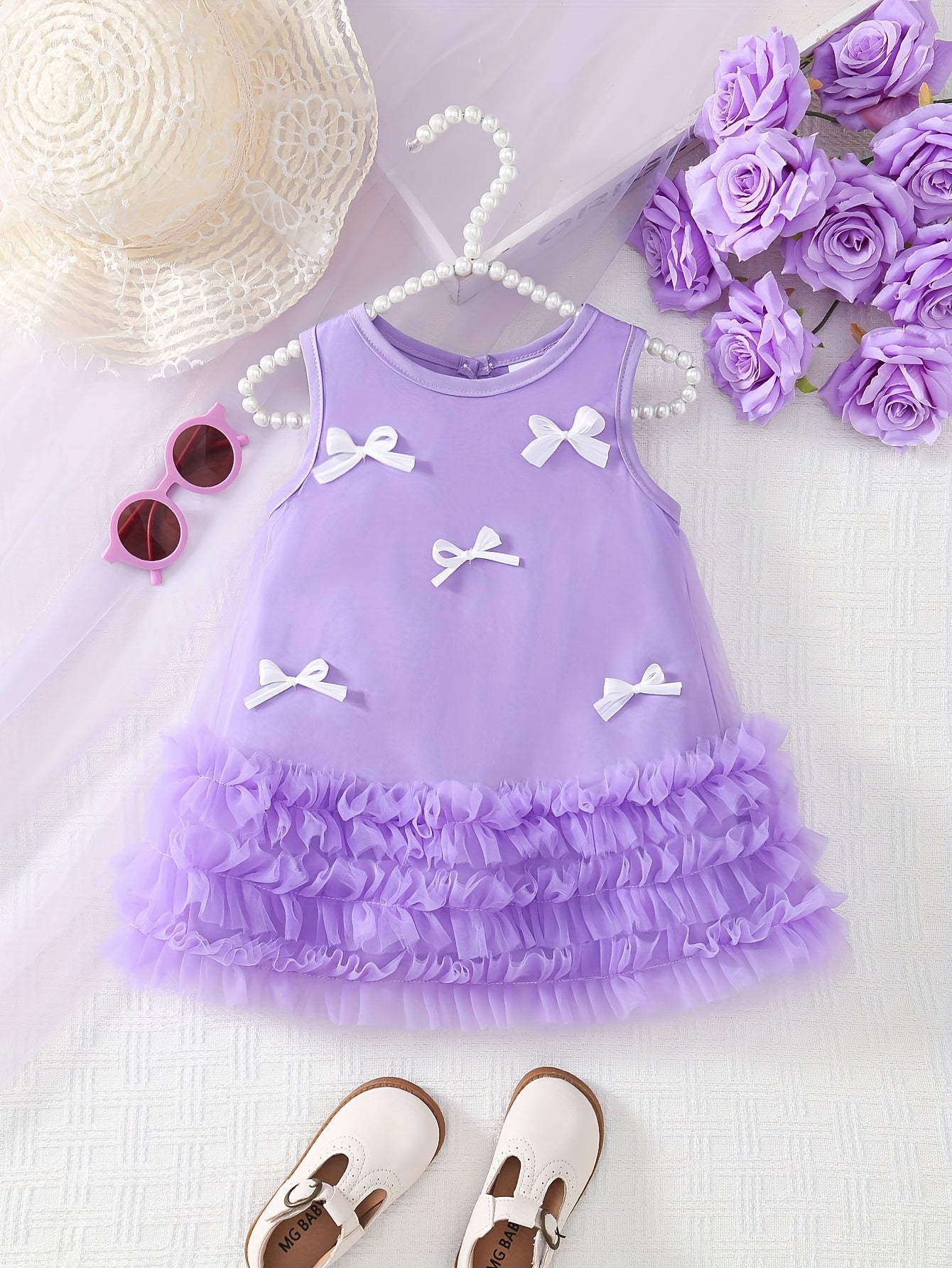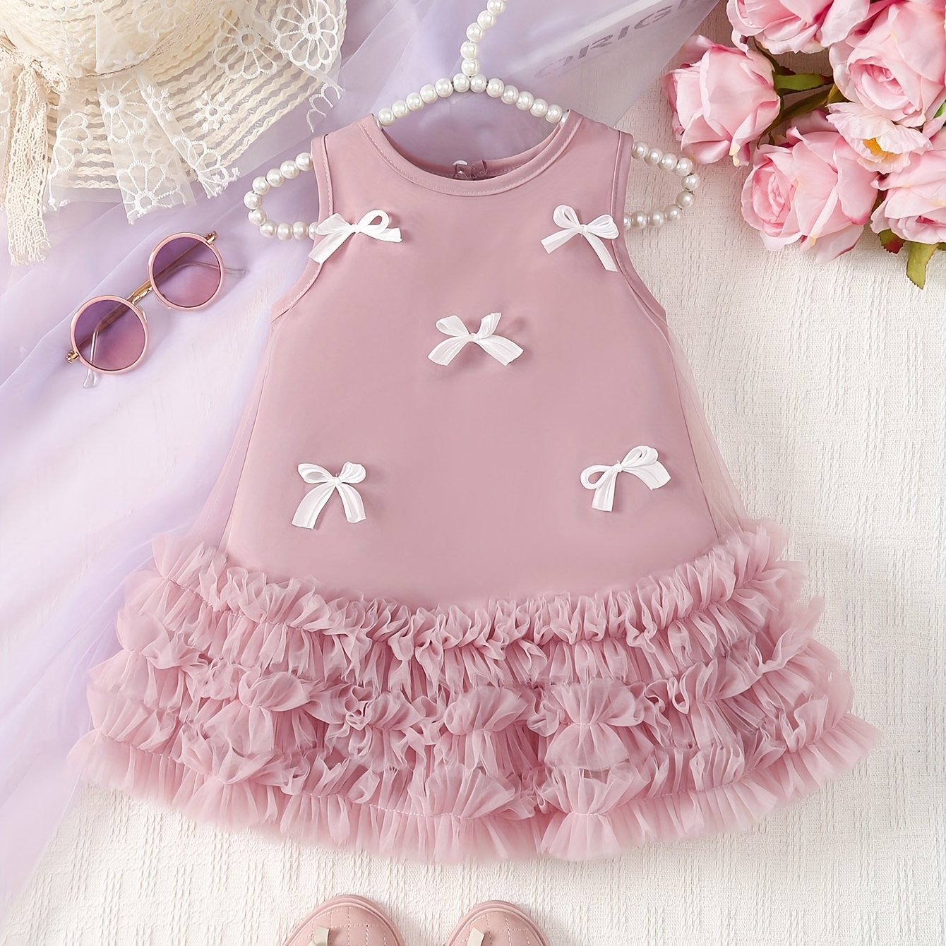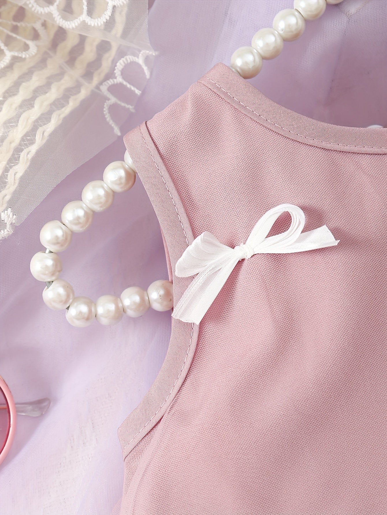 Girls' New Customized Light Pink Sleeveless Round Neck Tulle White Bow Pink Mesh Skirt Lace Casual Outdoor Dress