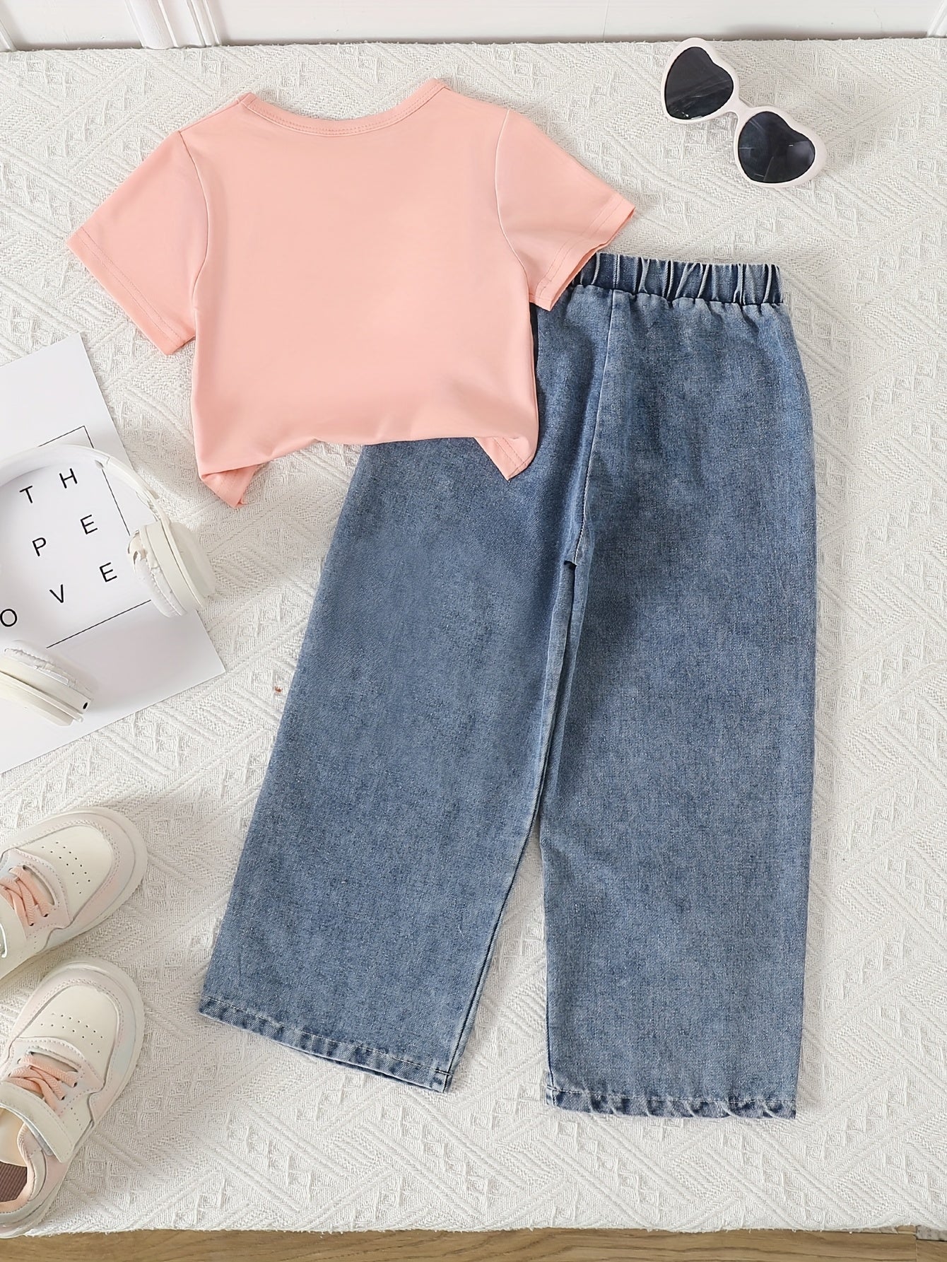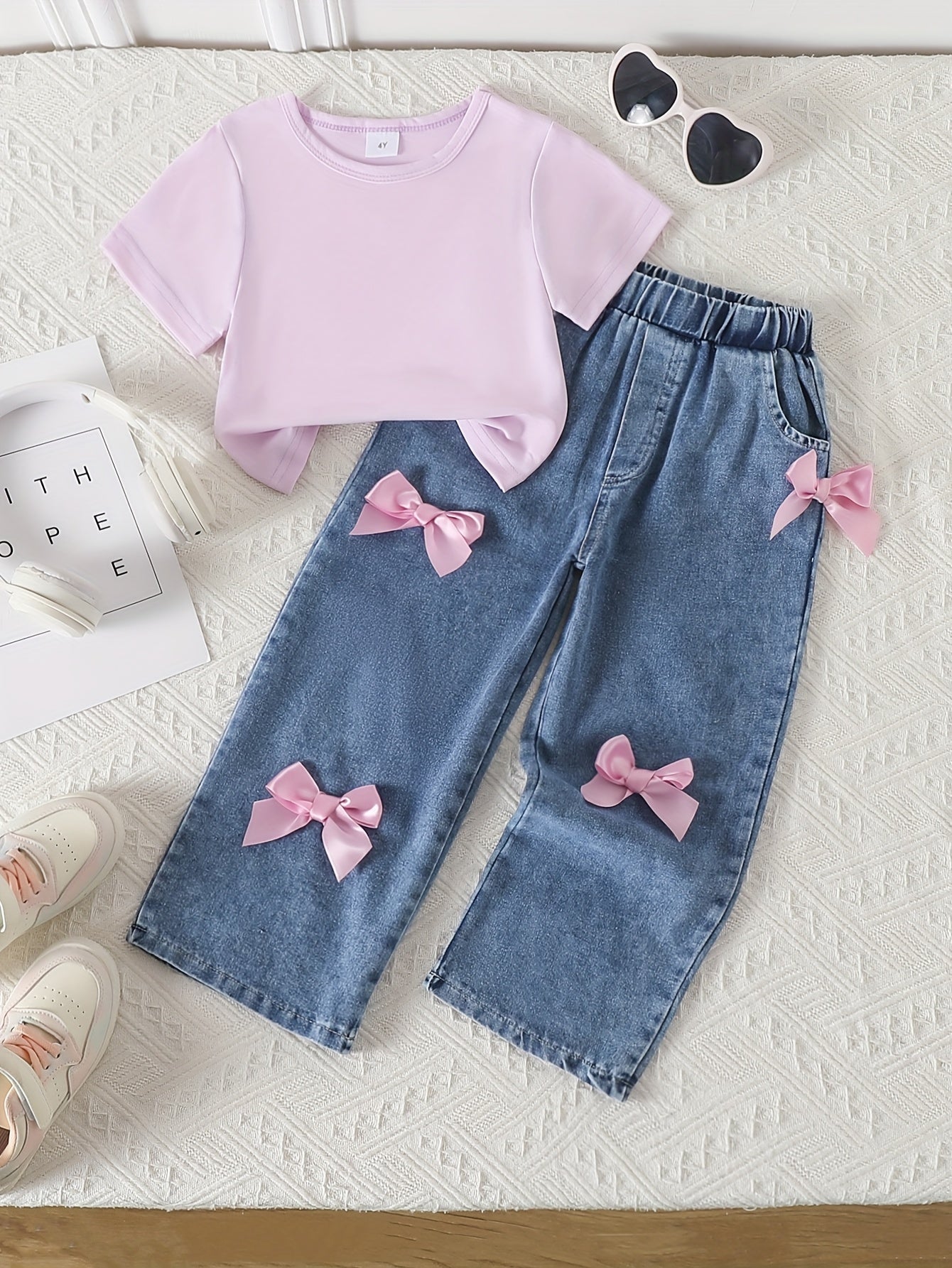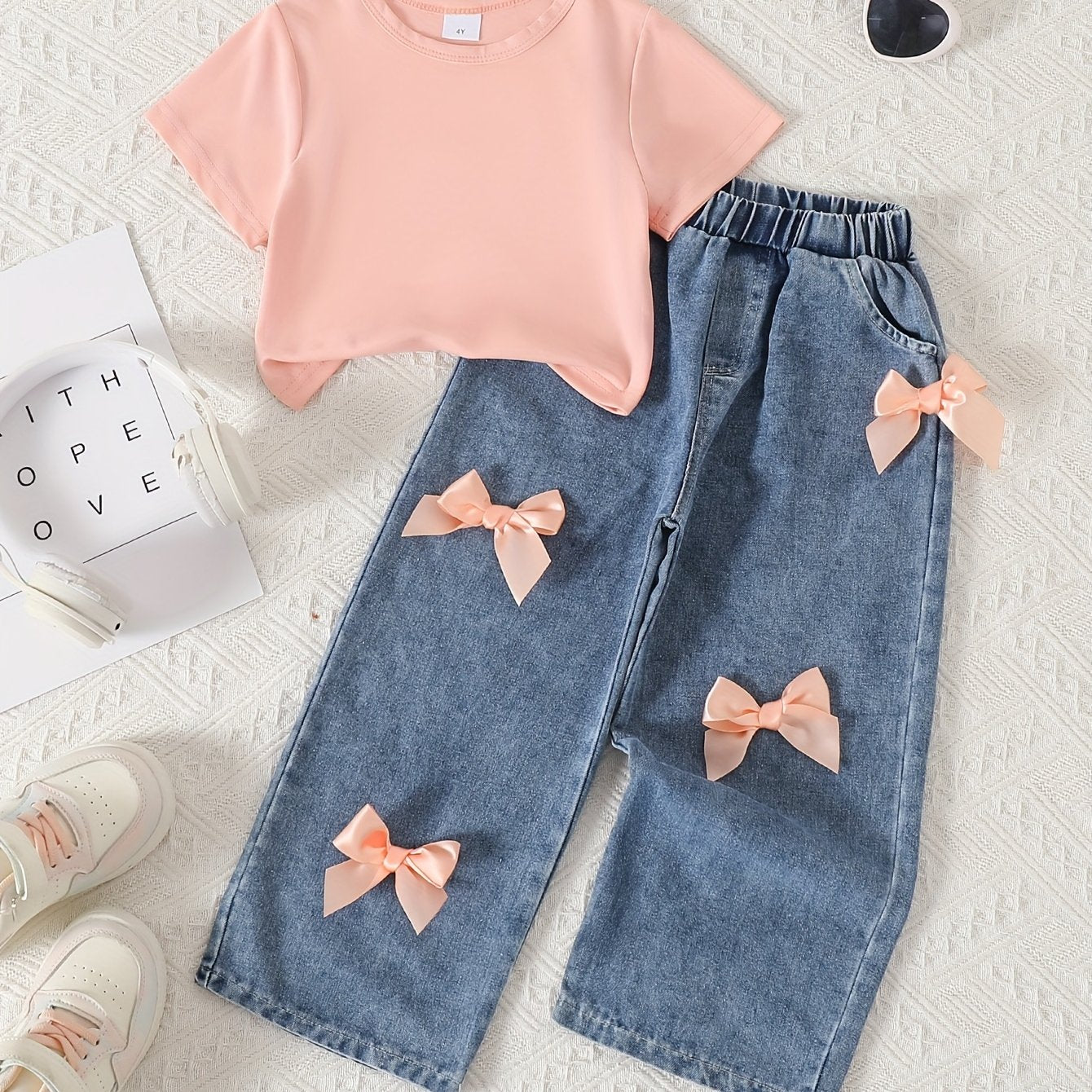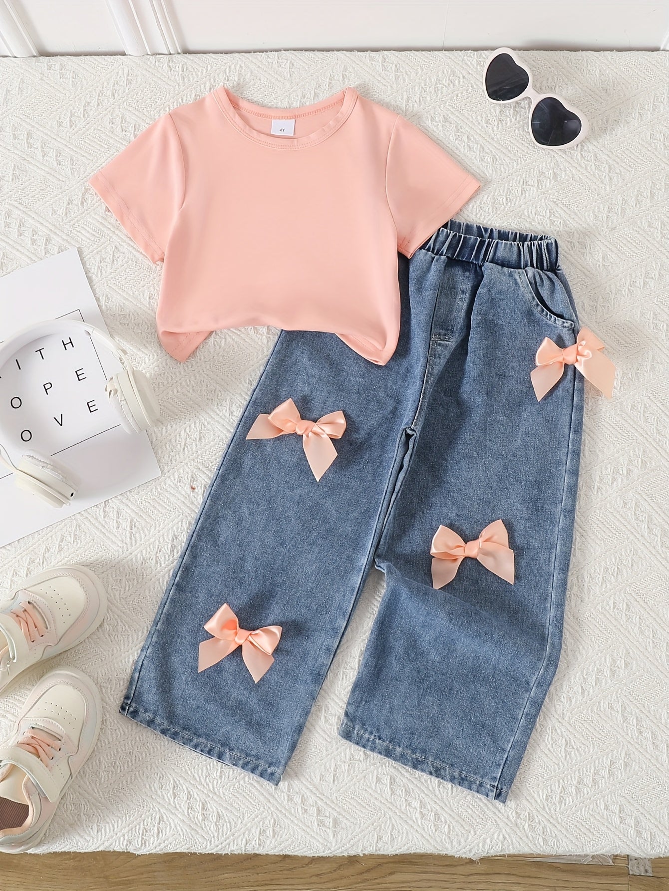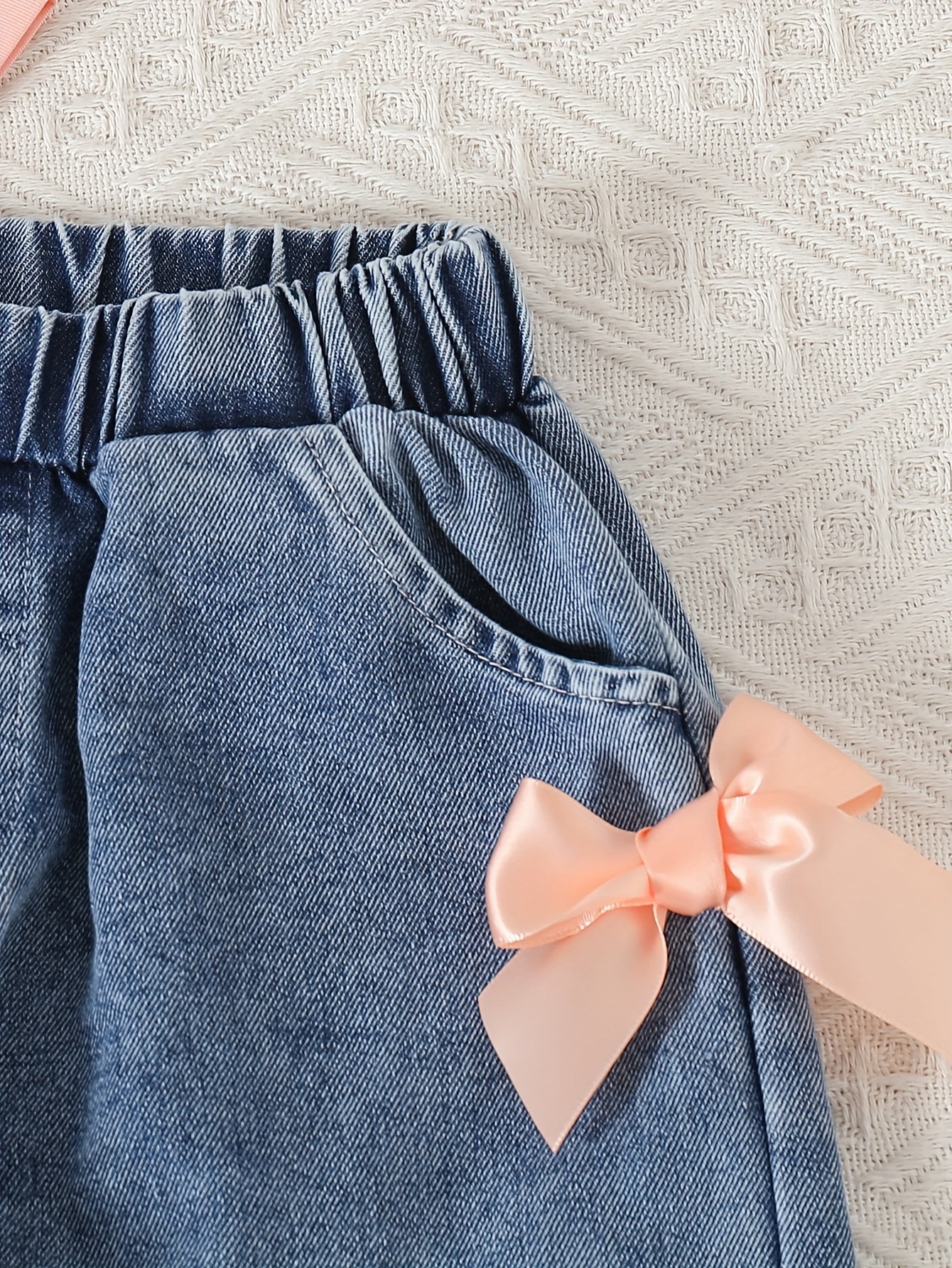 Girls' Pink Bow-Tie Denim Outfit - Short Sleeve T-Shirt & High-Waisted Pants with Adjustable Drawstring Waist, Soft Non-Stretch Fabric, Casual Spring Summer Fall Playwear, Denim Shorts for Girls, Spring Summer Clothing, Playful Design, Soft Fabric, Perfec