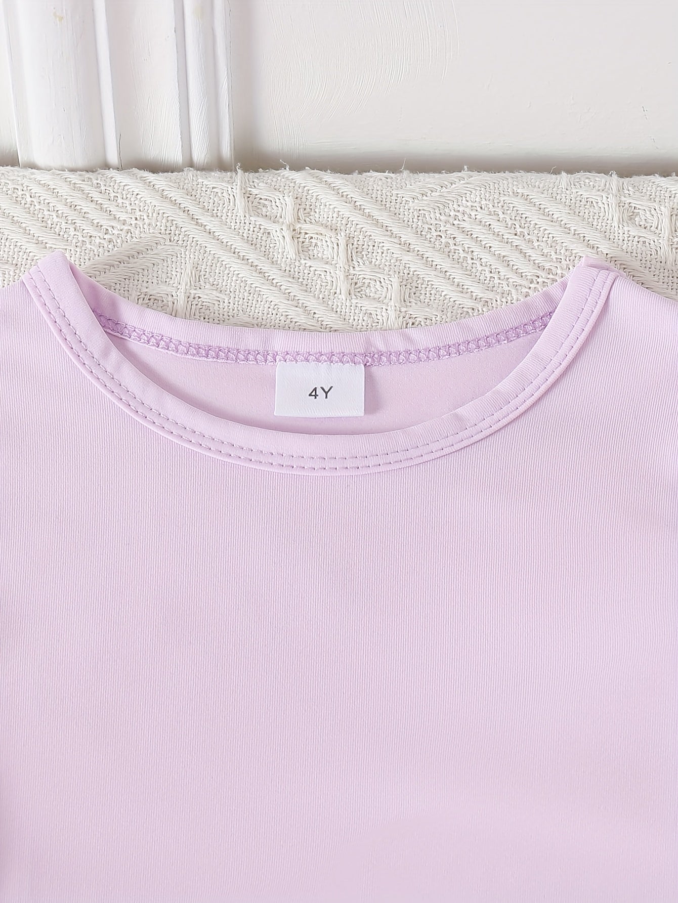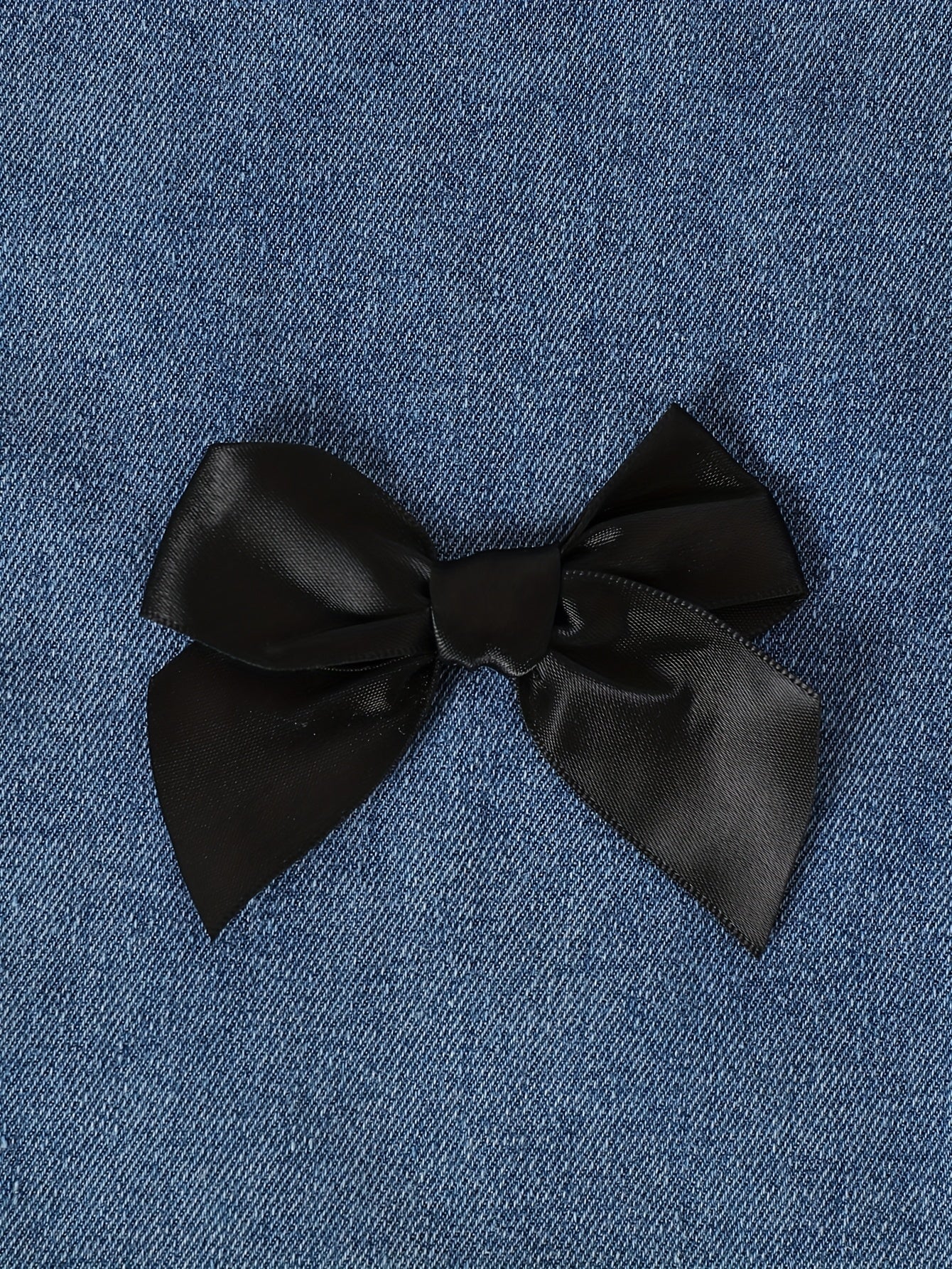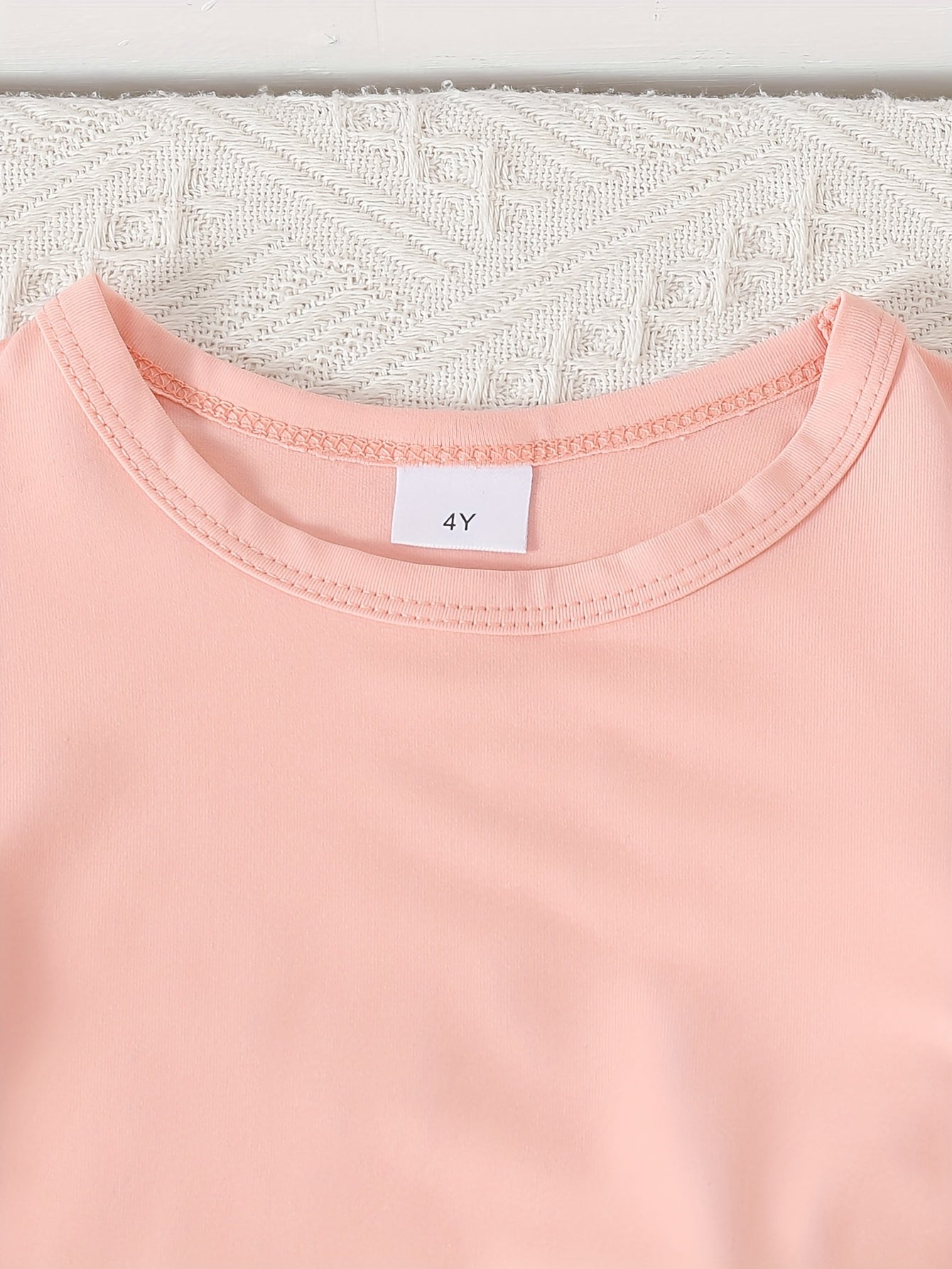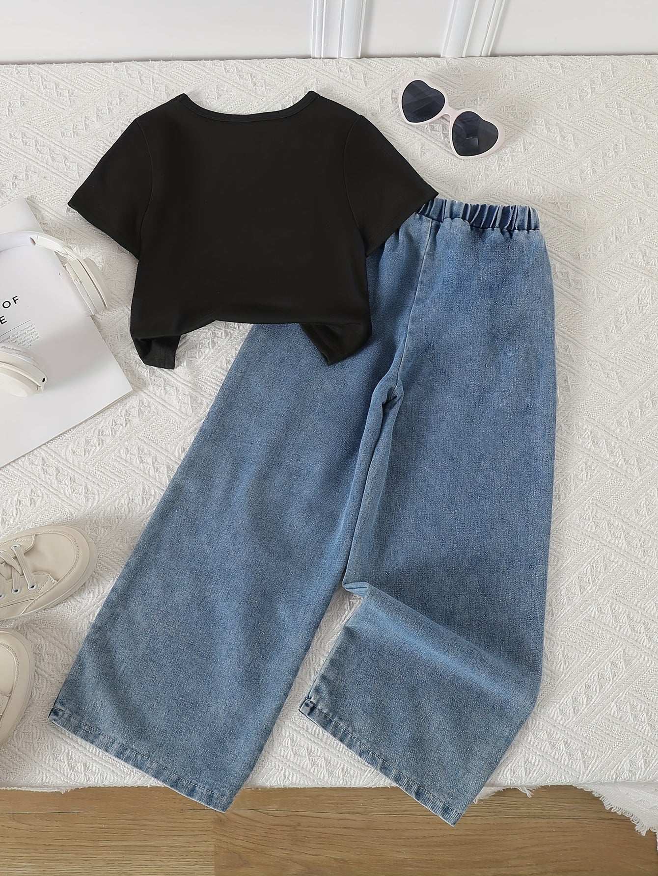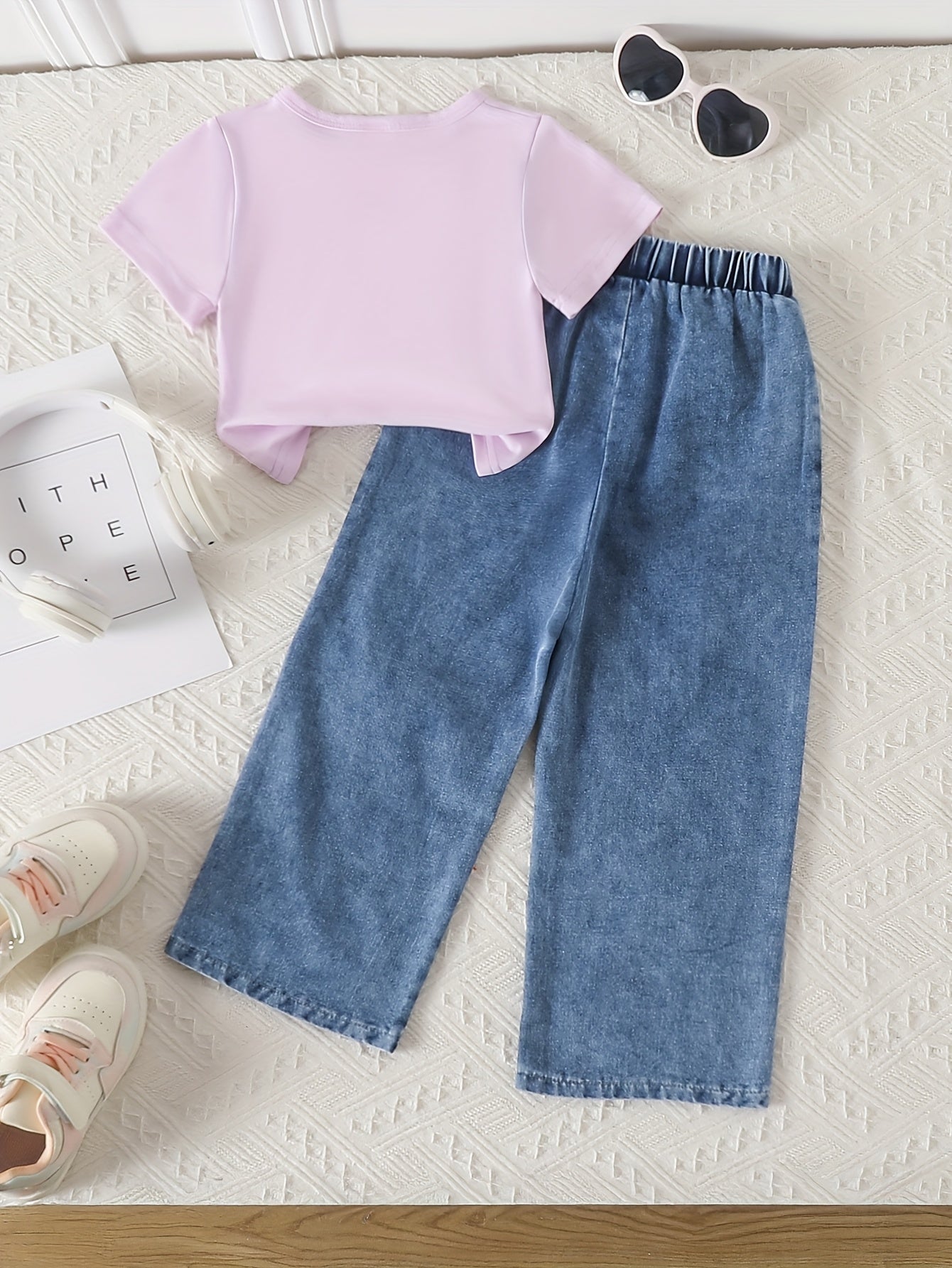 Girls' Pink Bow-Tie Denim Outfit - Short Sleeve T-Shirt & High-Waisted Pants with Adjustable Drawstring Waist, Soft Non-Stretch Fabric, Casual Spring Summer Fall Playwear, Denim Shorts for Girls, Spring Summer Clothing, Playful Design, Soft Fabric, Perfec