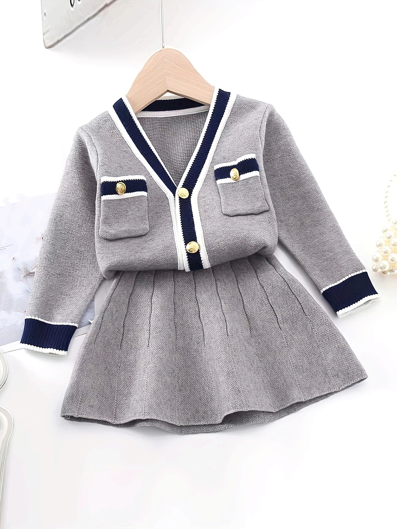 Girls Preppy Style Cardigan And Skirt Set - V-Neck Long Sleeve Top with Button Front & Pockets, Elastic Waistband, Ribbed Texture, Solid Color, Perfect for Fall, Casual Attire | Preppy Clothing | Construction, Clothes for Youngster