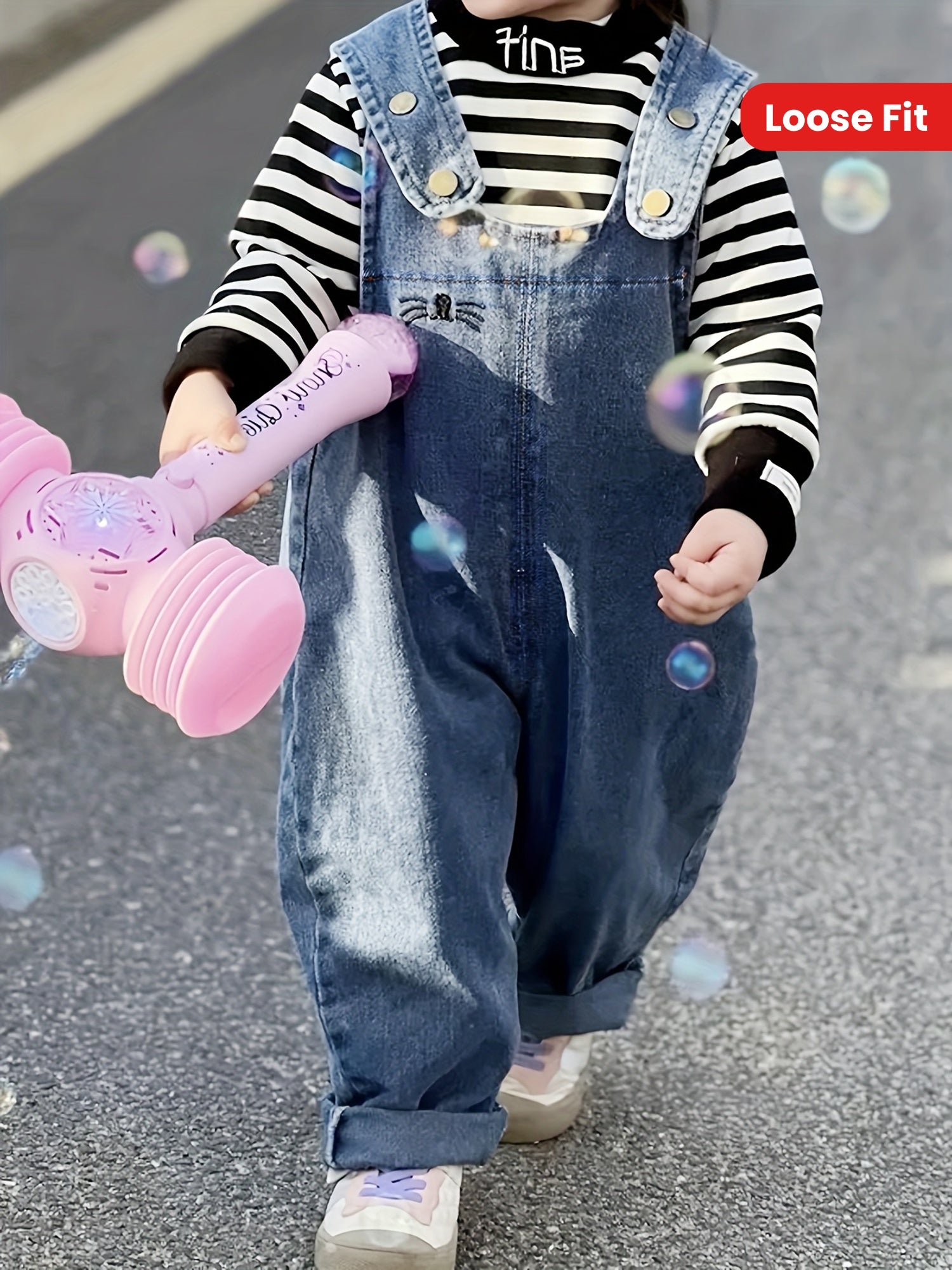 [Light Blue Denim Overalls Casual] Adorable Youngsters' Light Blue Denim Overalls with Rabbit Ear Details - Casual, Loose Fit for Spring & Autumn, Machine Washable, Perfect for Outdoor