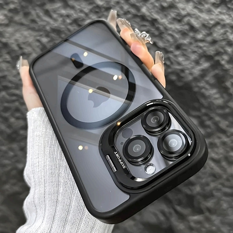 Simplified Magnetic Metal Frame Lens Protective Film/Bracket Three In One Phone Case Suitable for iPhone 16 16pro 16proMax 15 15Pro 15ProMax 14 14Pro 14ProMax 13 13Pro 13ProMax 12 12Pro 12ProMax 11 Acrylic Anti Drop Hard Shell Protective Case