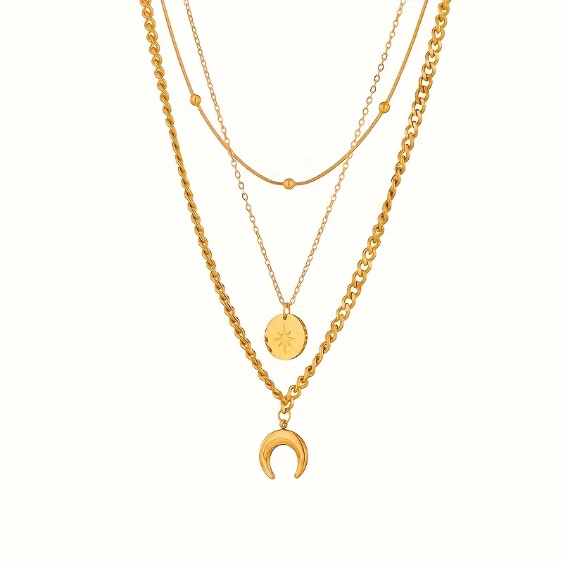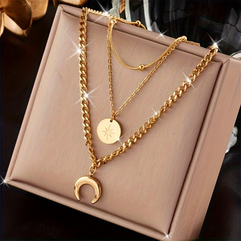 Stainless Steel Golden 3 Layer Shine Crescent Moon Pendant Necklace Women Trend Chain Neck Jewelry Gift, Gift for Eid, Ramadan