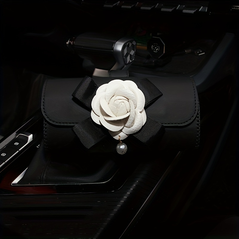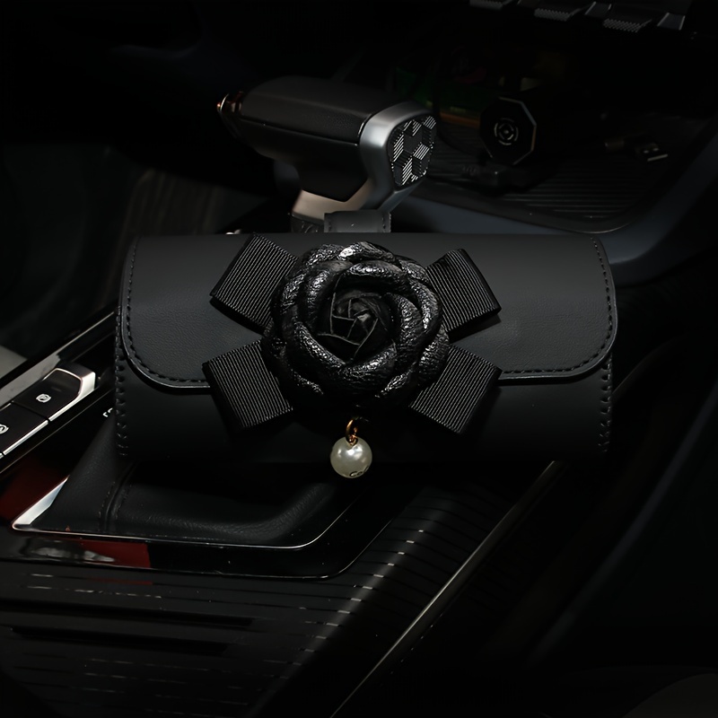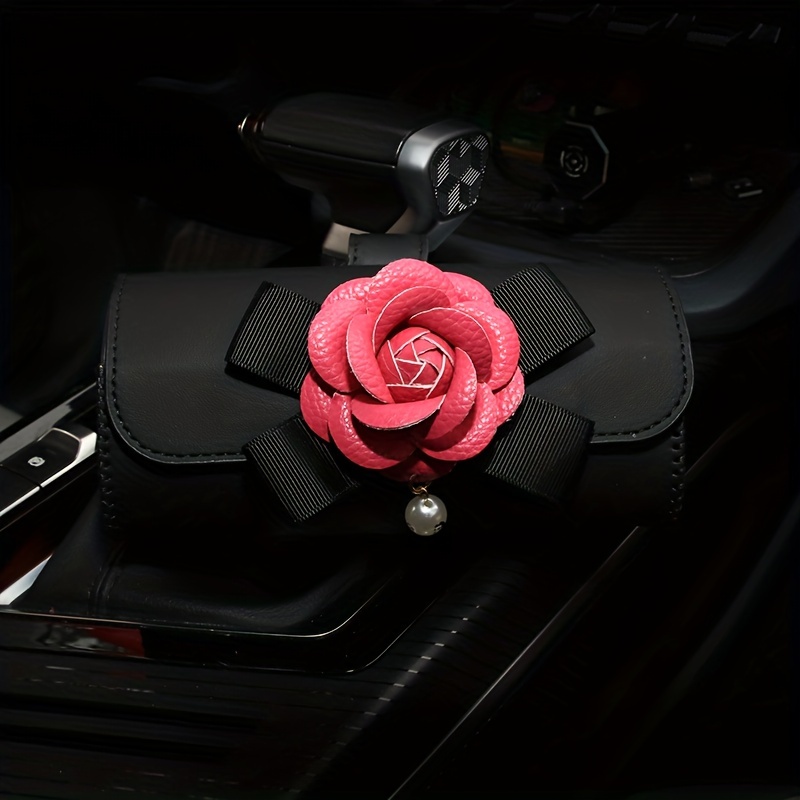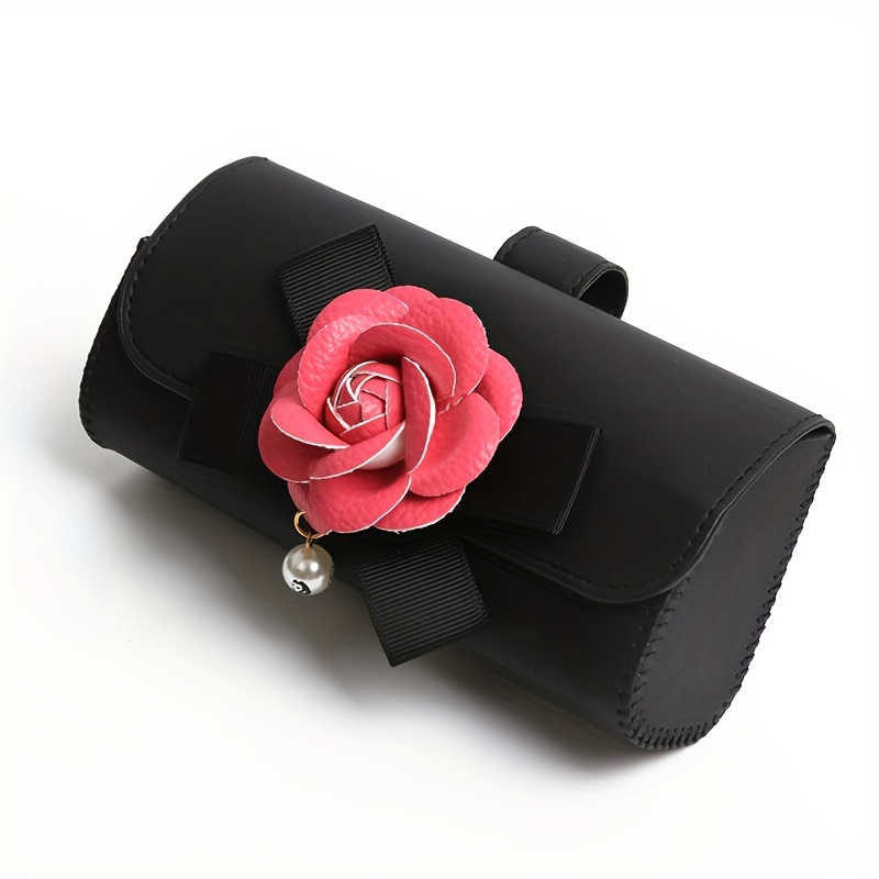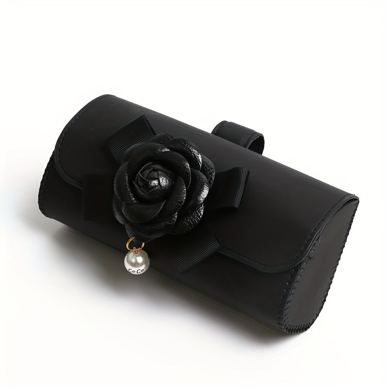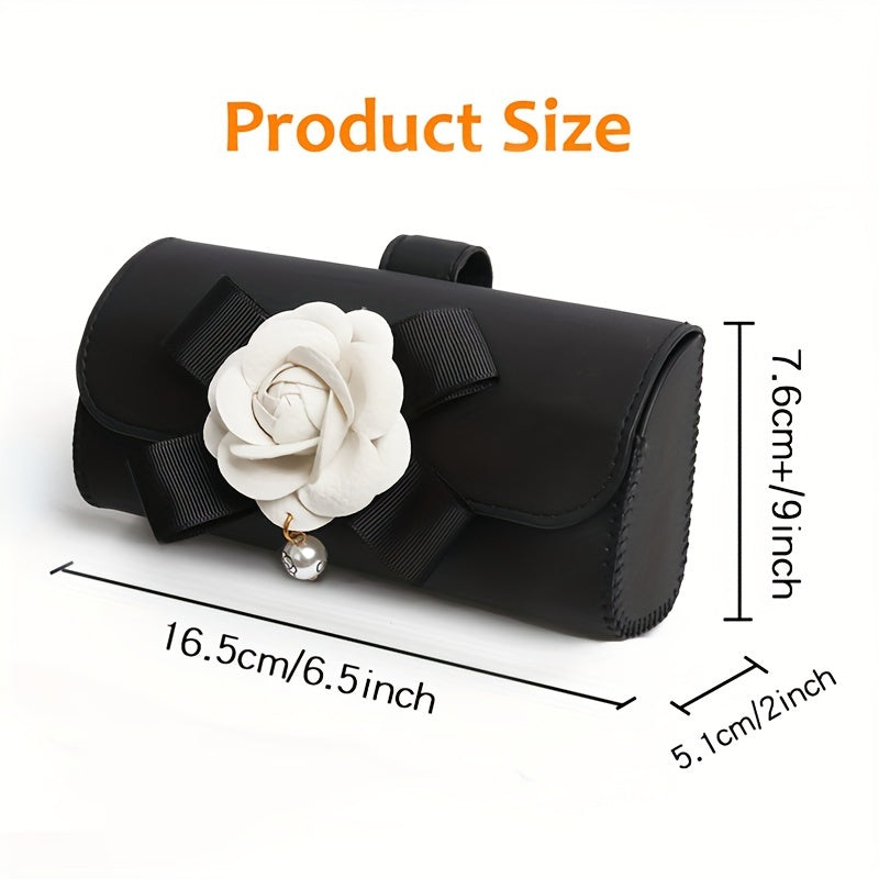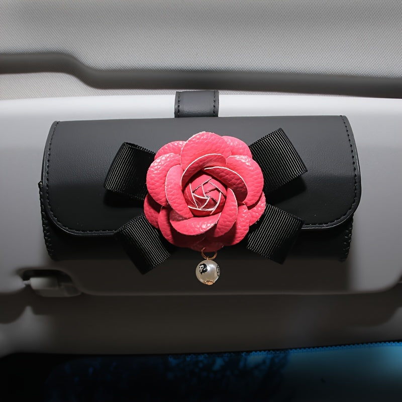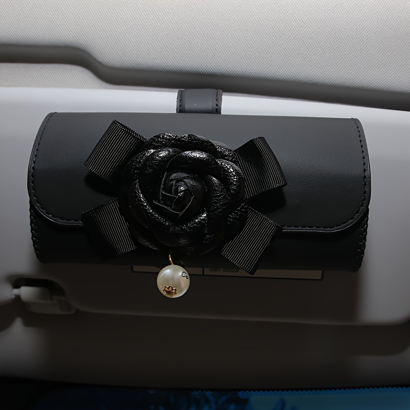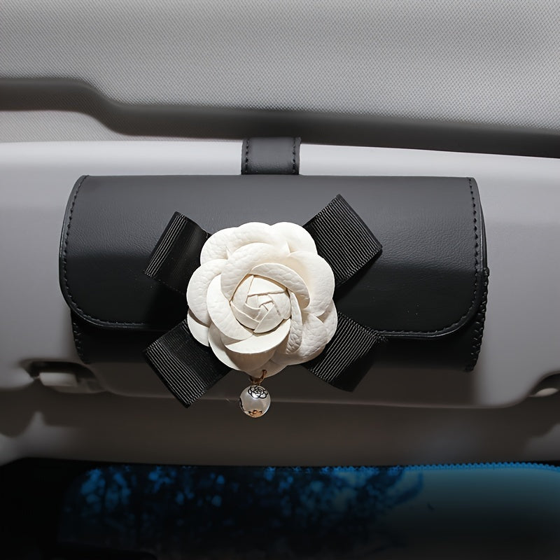 Stylish Camellia Flower Design PU Leather Car Visor Sunglasses Holder - Universal Eyeglass Clip with Bow and Pendant - Convenient Glasses Storage Box for Automotive Sun Visor Accessories