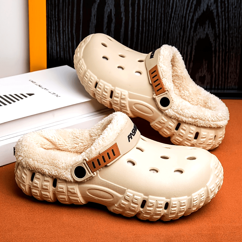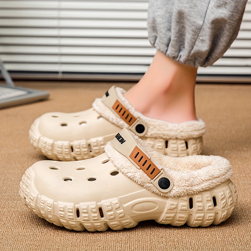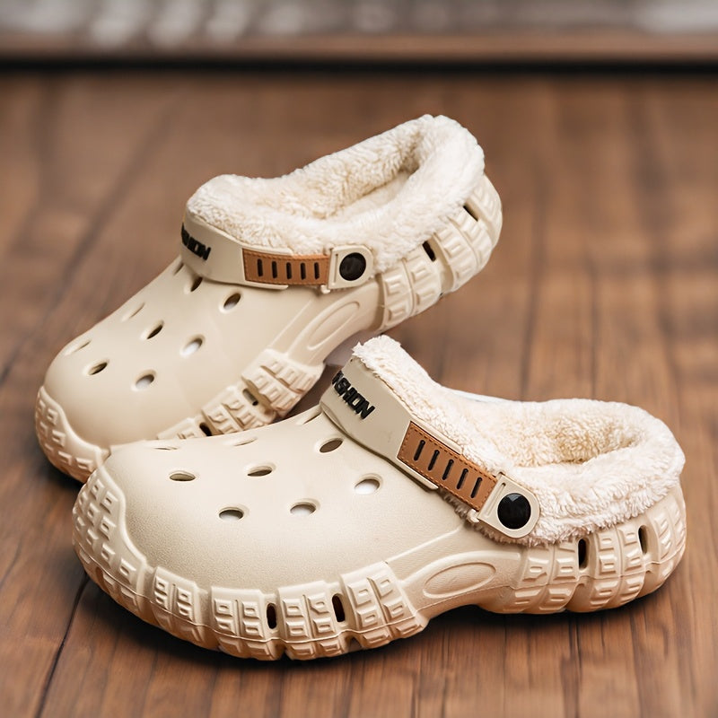 Unisex Winter Fleece-Lined Slip-On Clogs with Removable Plush Inner Lining, Non-Slip EVA Sole & Thick Insulation for Snow & Cold Weather - Beige Casual Shoes for Men and Women, Winter Shoes, Outdoor Footwear, Unique Tread Pattern, Durable Grip Footwear