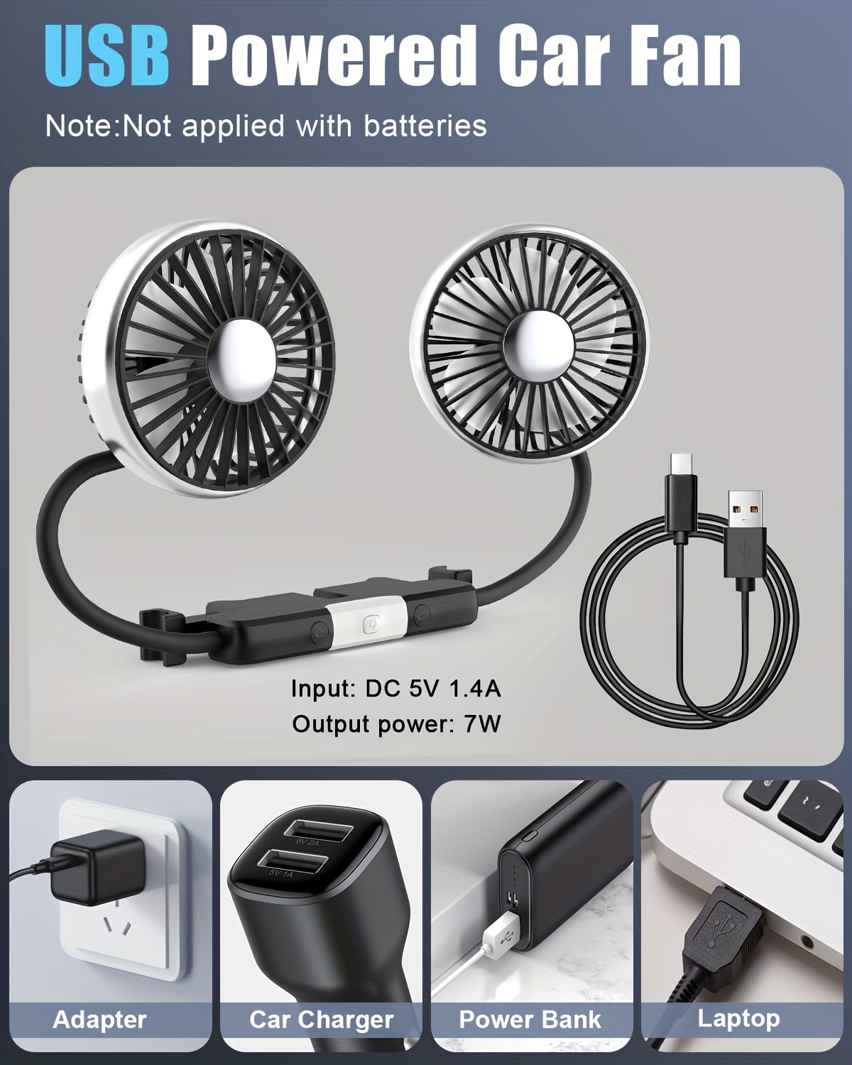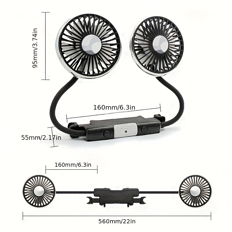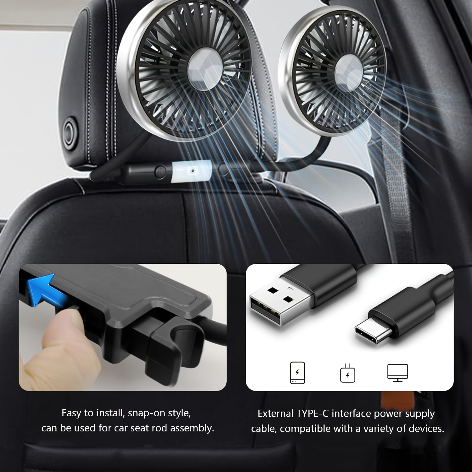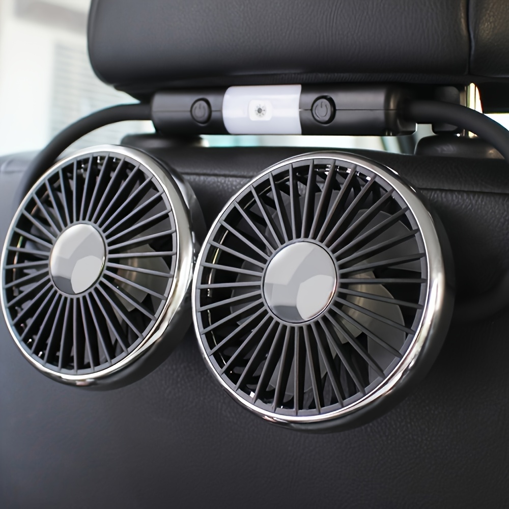 USB Car Back Seat Baby Fan, 2 Independent Heads, 360° Rotatable, 5V Quiet, Plastic, Exhaust, with Cord, for Sedan SUV RV Truck Van