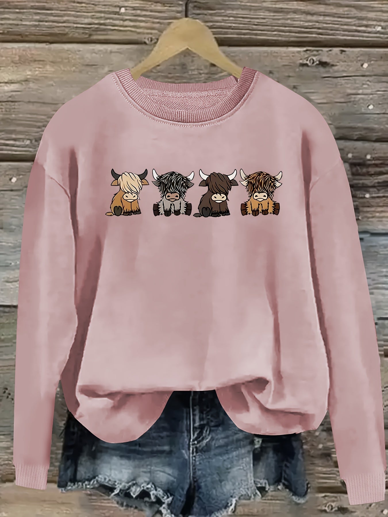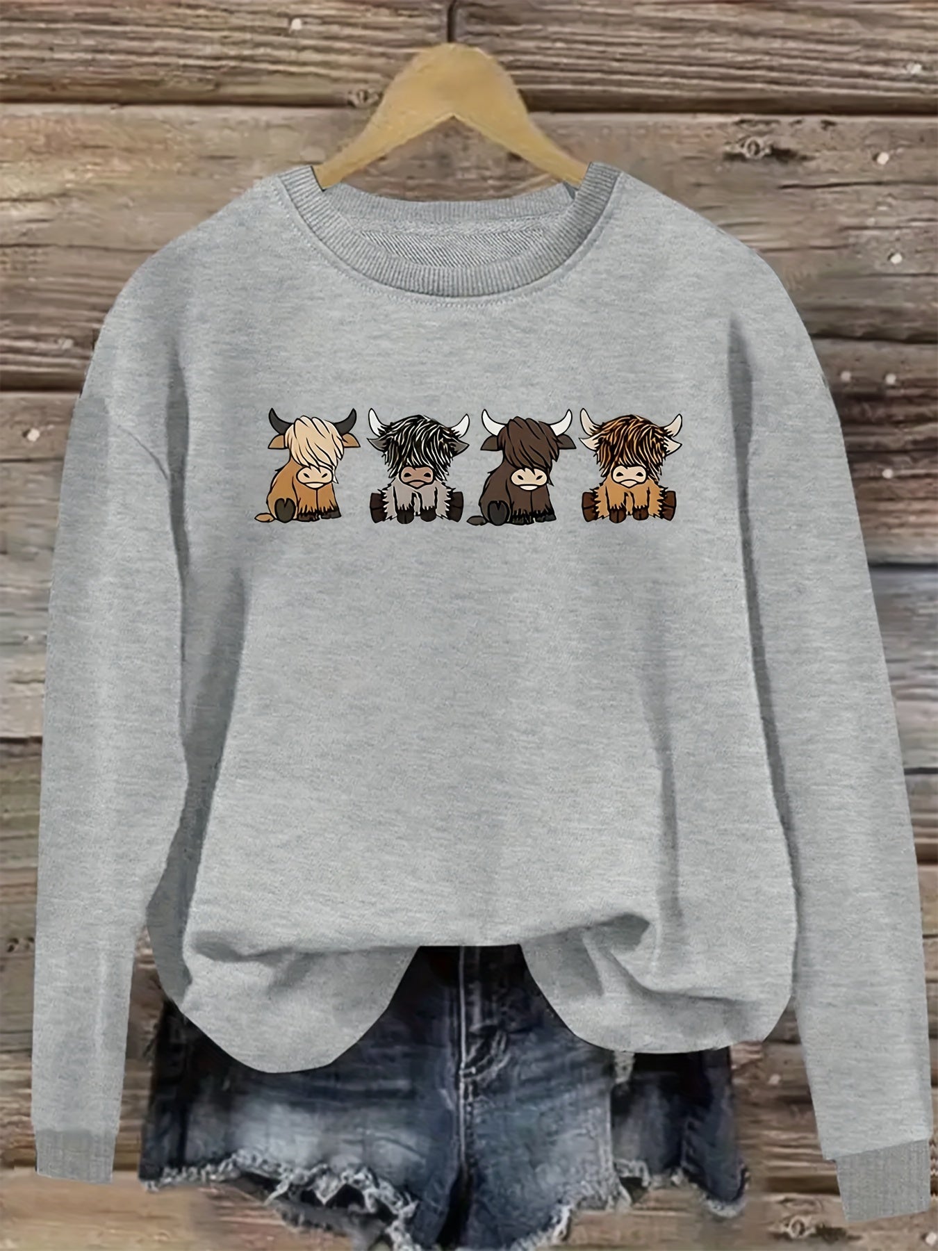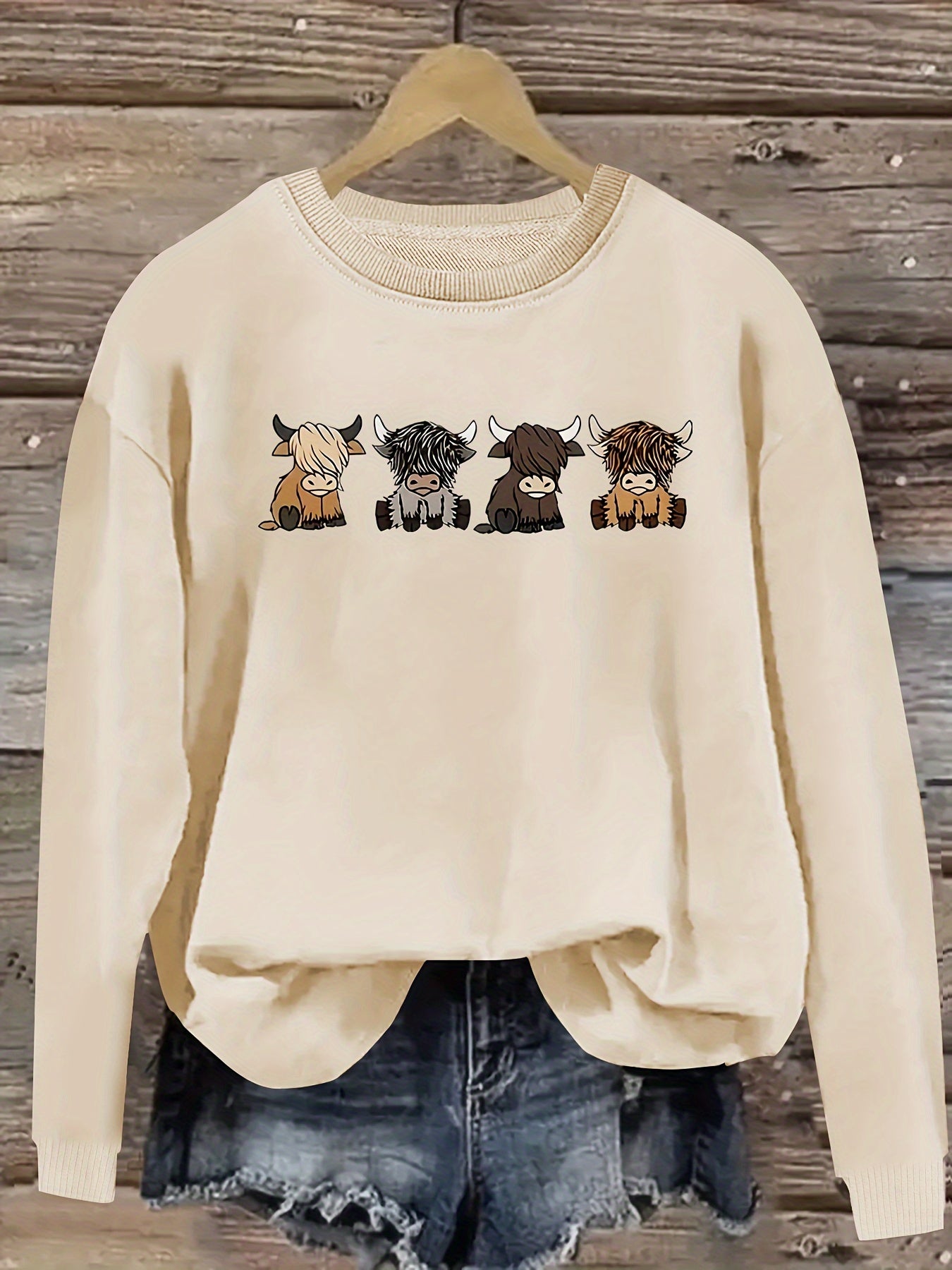 Women's Casual Long Sleeve Round Neck Sweatshirt - Cute Cartoon Cow Print Pullover, Cozy Beige Fall Winter Top, Machine Washable Regular Fit, Autumn Apparel, Comfortable Wear