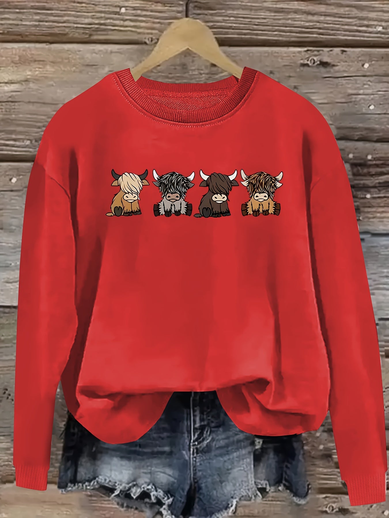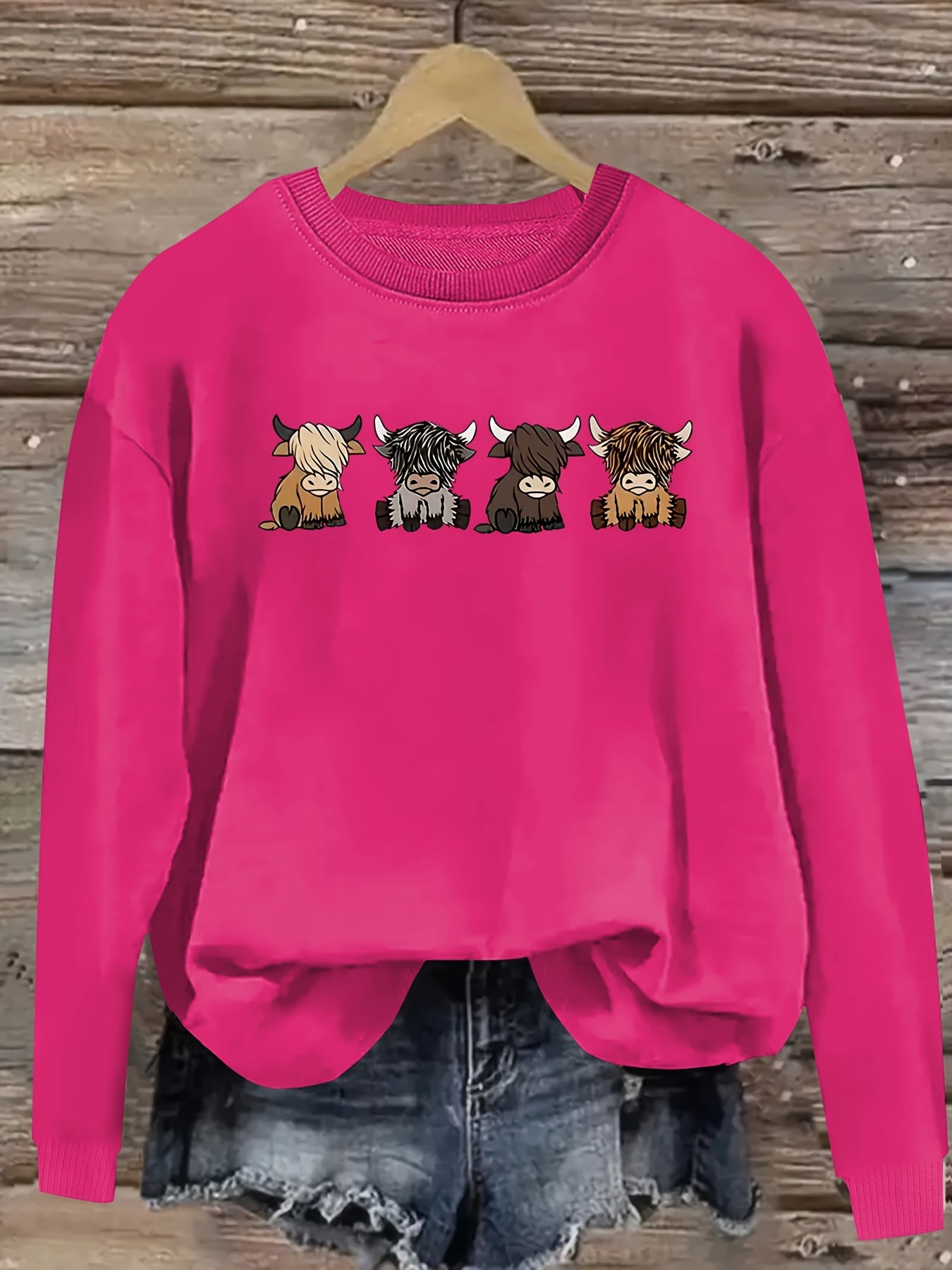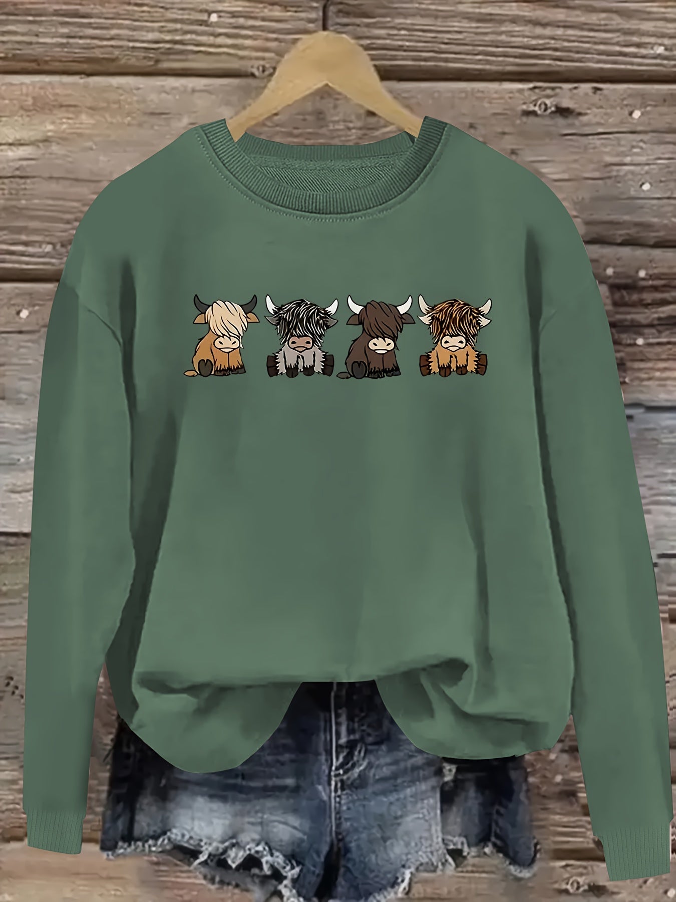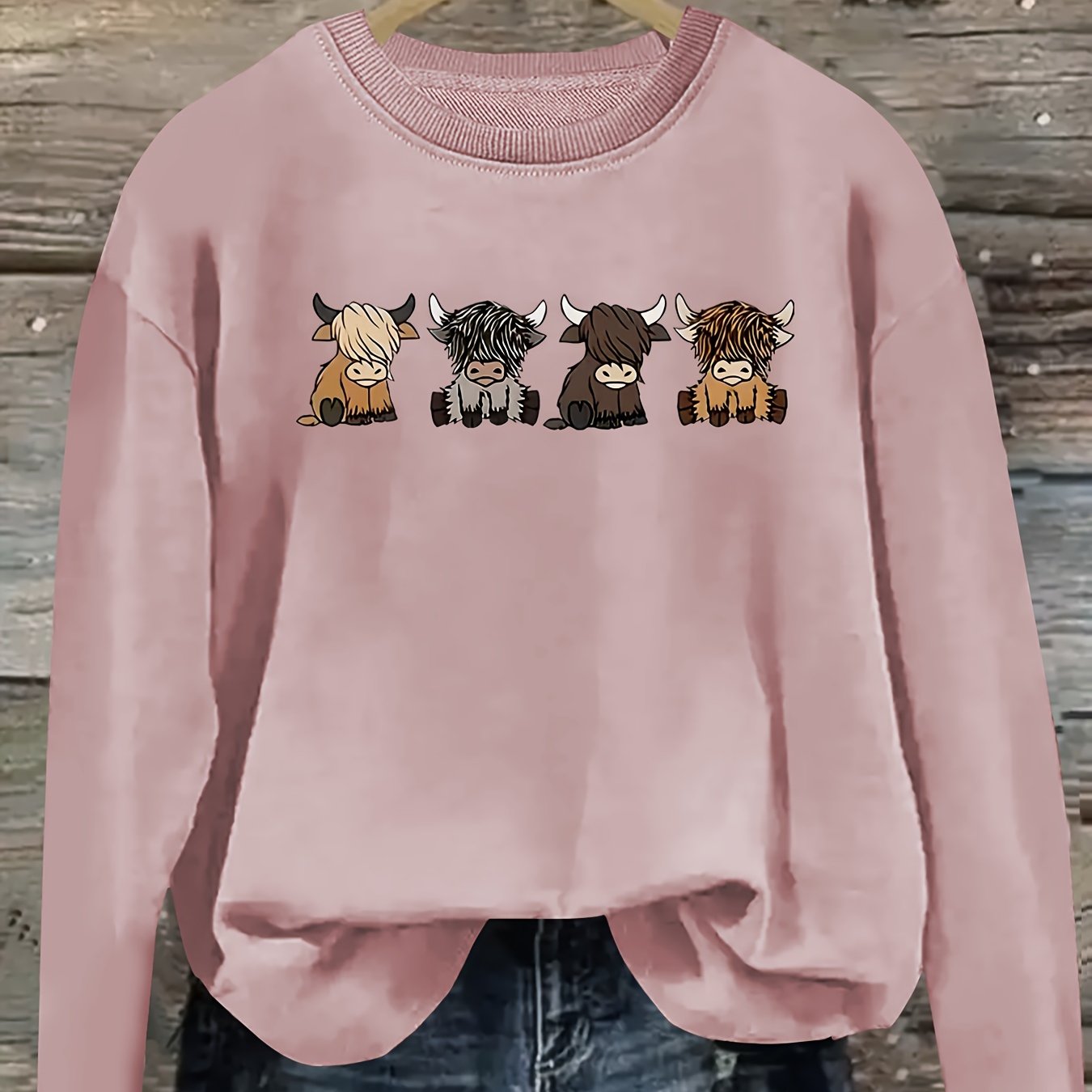 Women's Casual Long Sleeve Round Neck Sweatshirt - Cute Cartoon Cow Print Pullover, Cozy Beige Fall Winter Top, Machine Washable Regular Fit, Autumn Apparel, Comfortable Wear