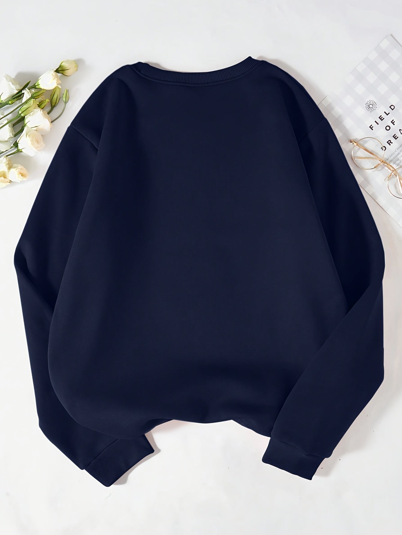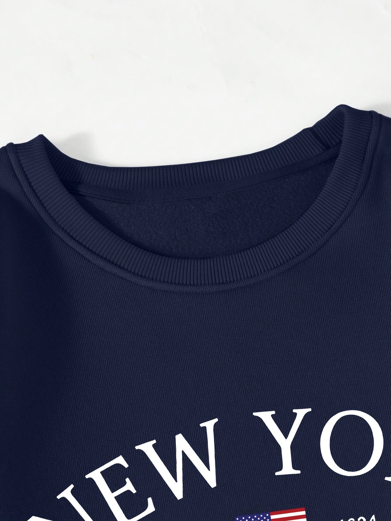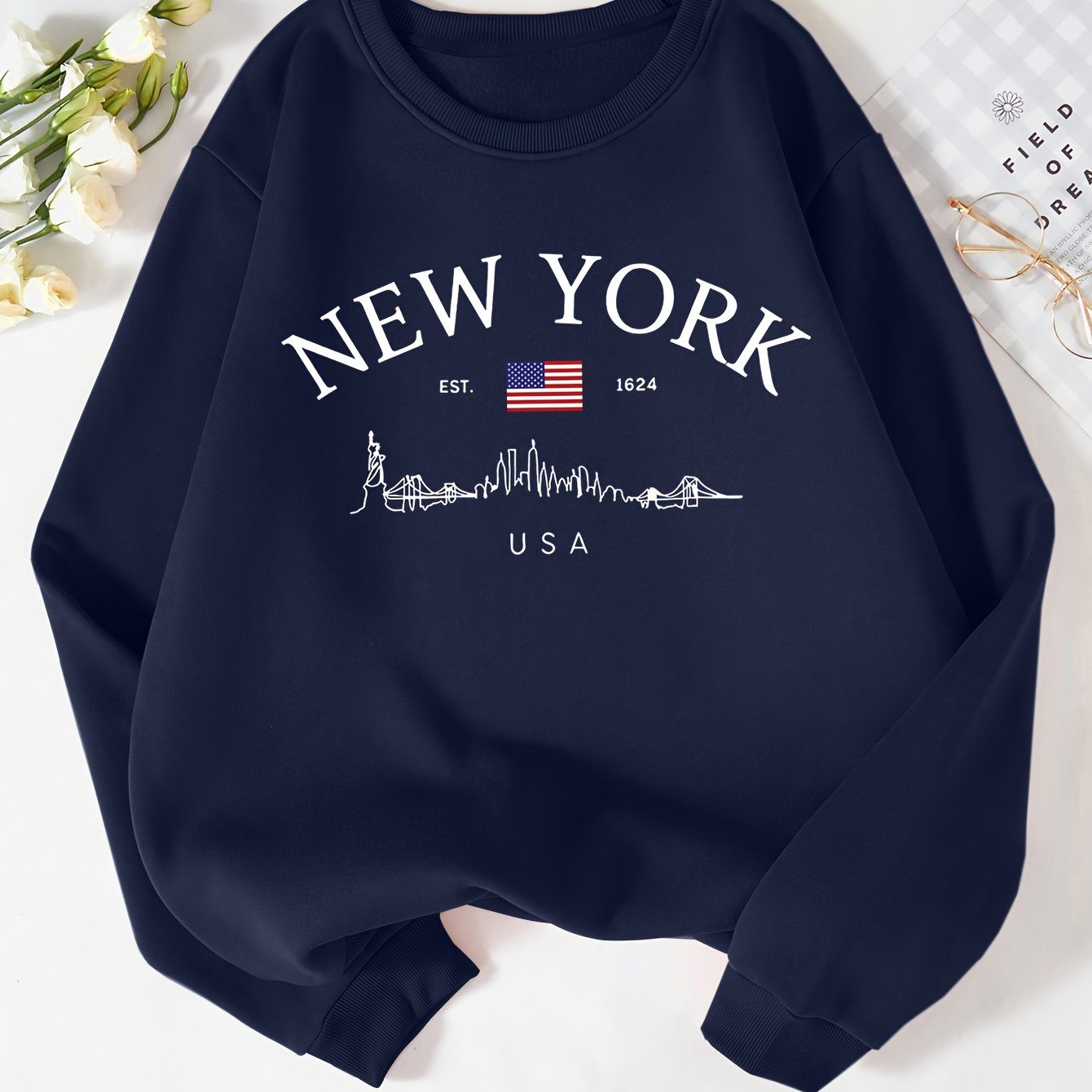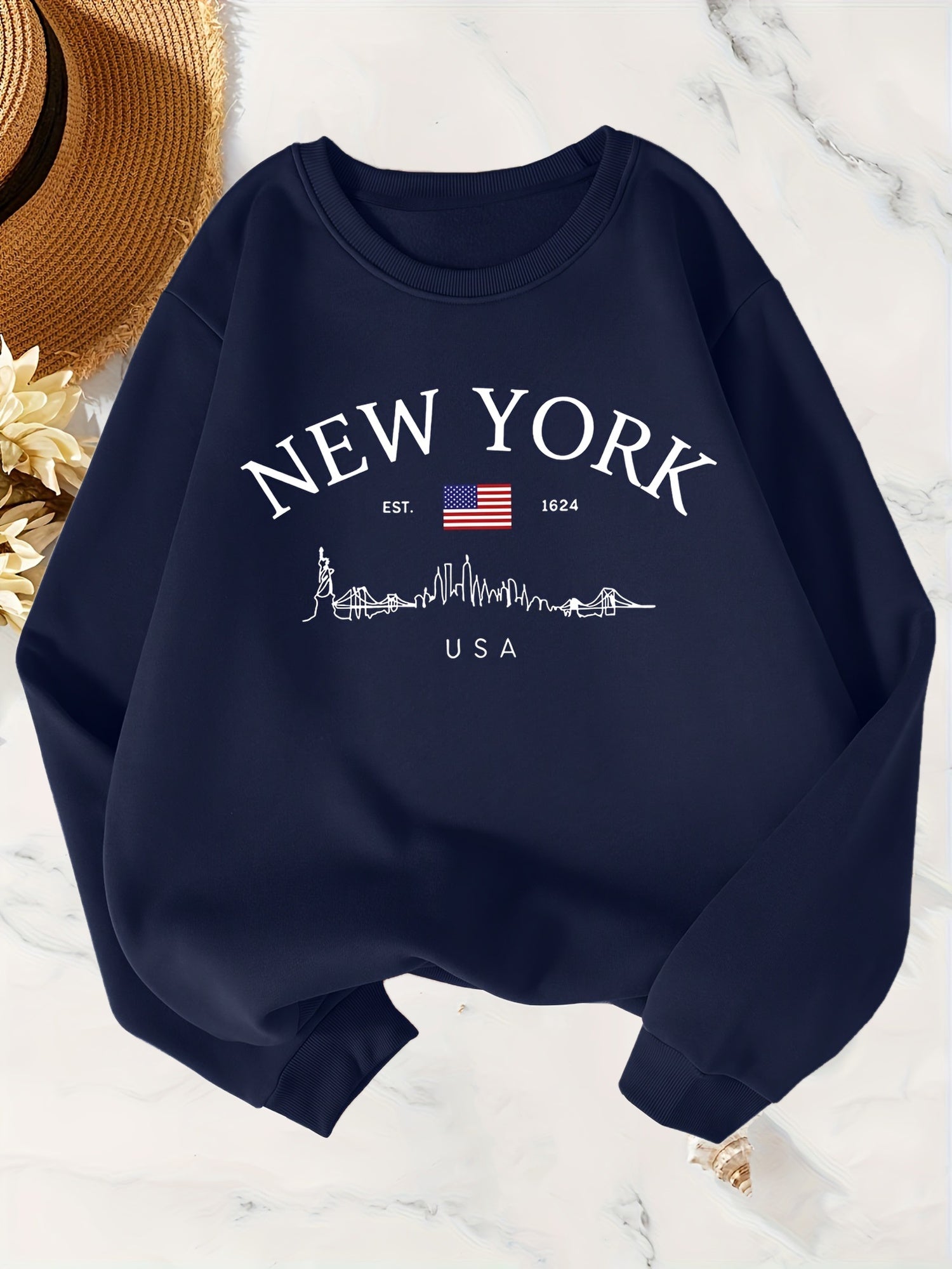Women's New York 1624 Graphic Plush-Lined Sweatshirt - Patriotic NYC Skyline & American Flag Print, Cozy Round Neck Long Sleeve Pullover for Fall Winter Casual Wear, Comfortable Hline